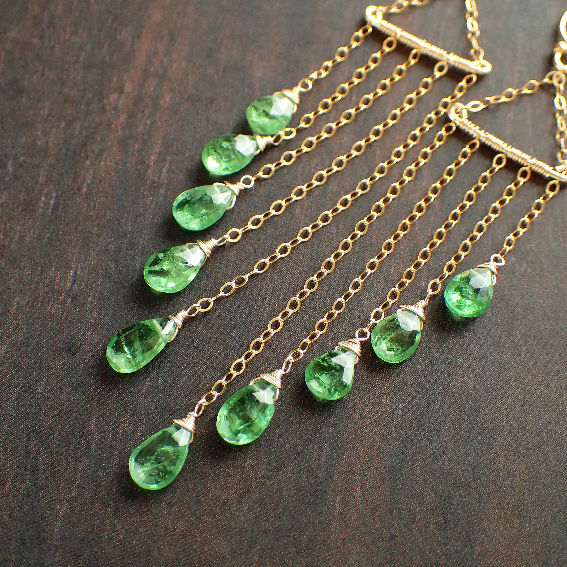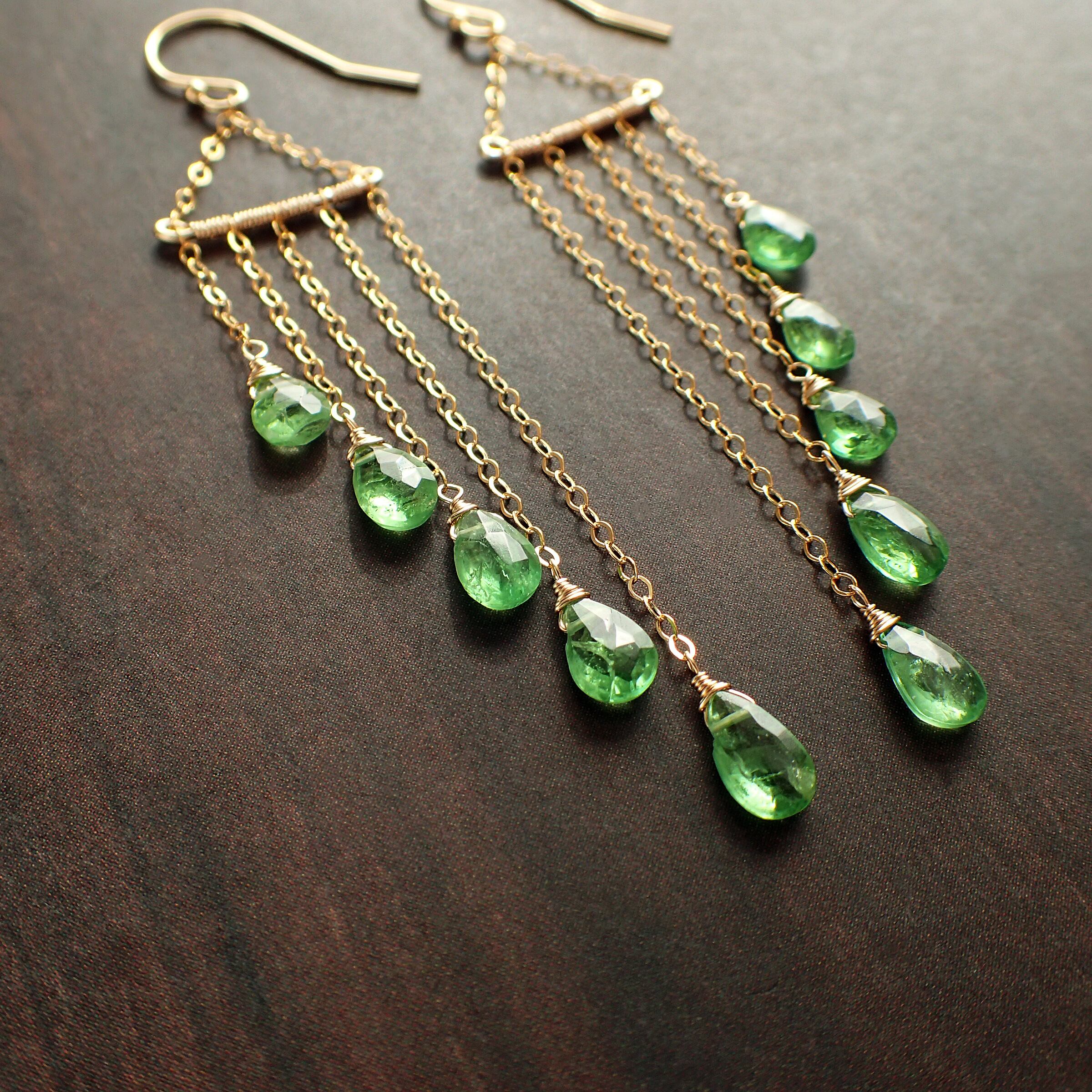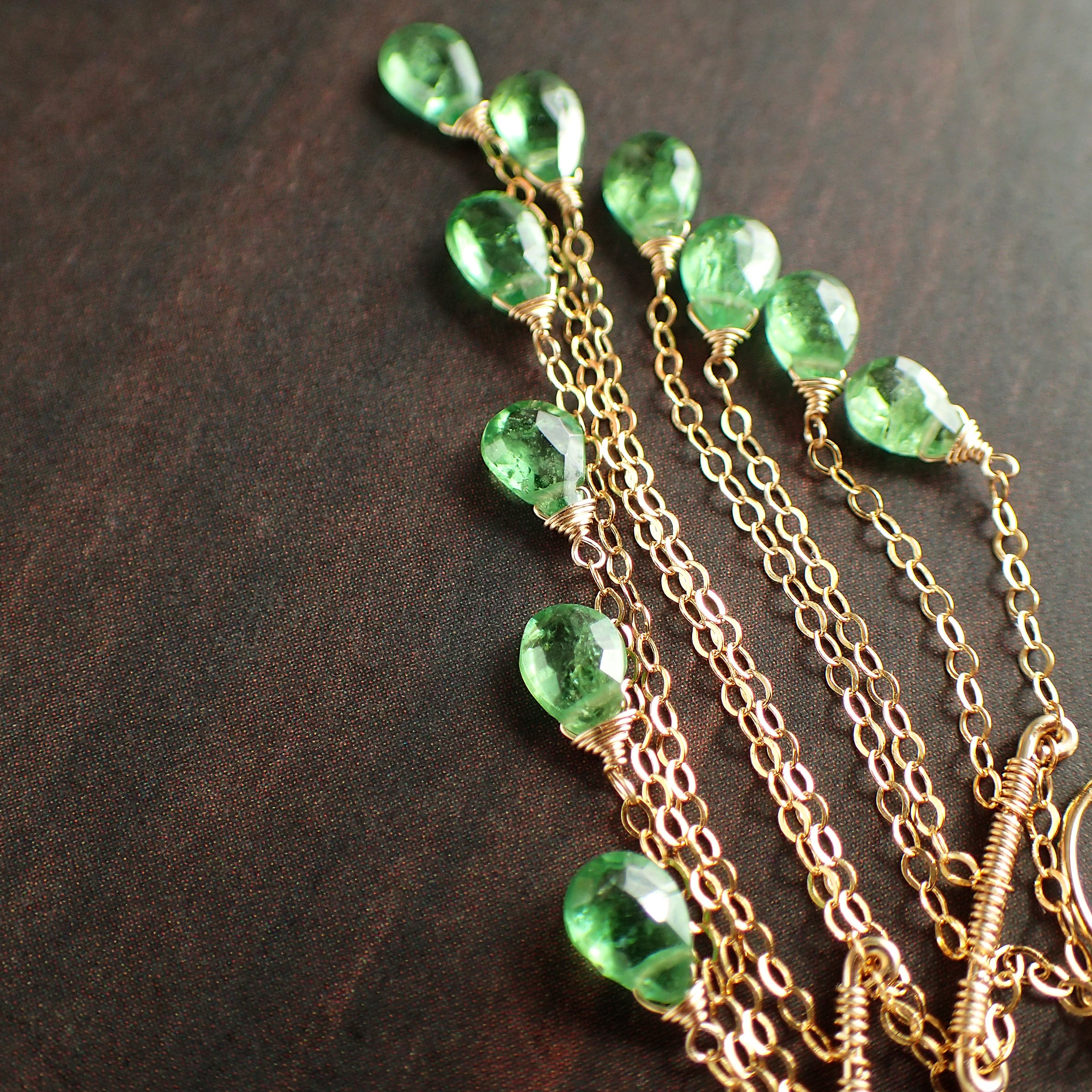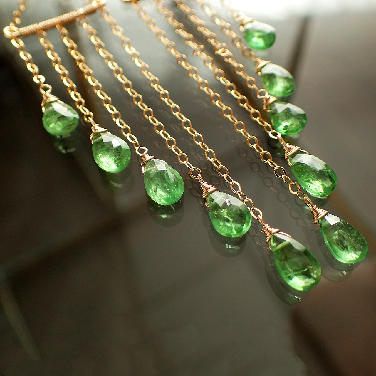このグリーンガーネットのシャンデリアピアスは、瑞々しいグリーンガーネットの魅力が際立つ美しいアクセサリーです。