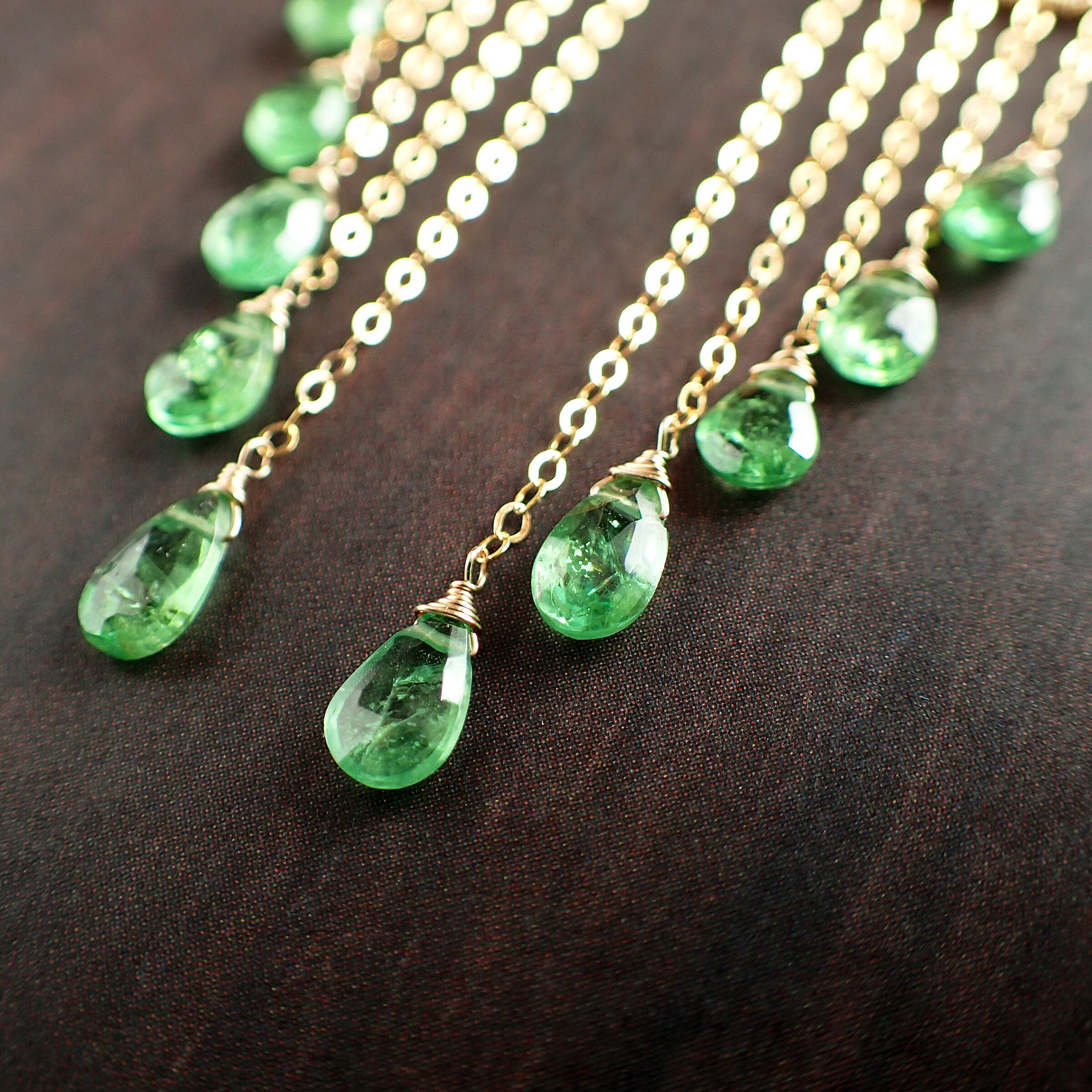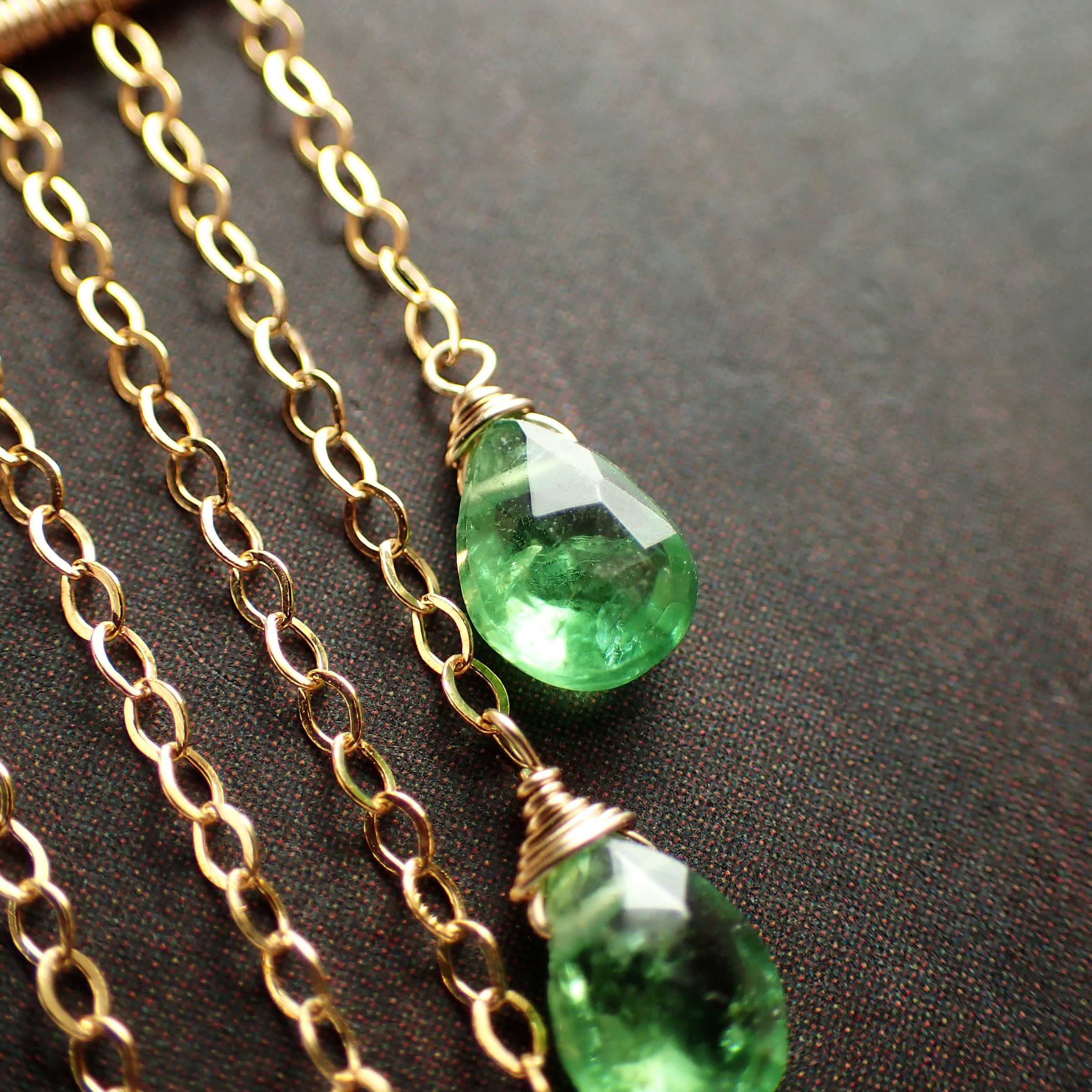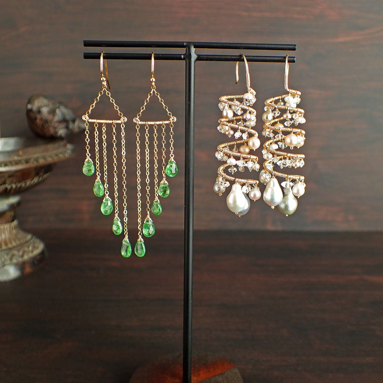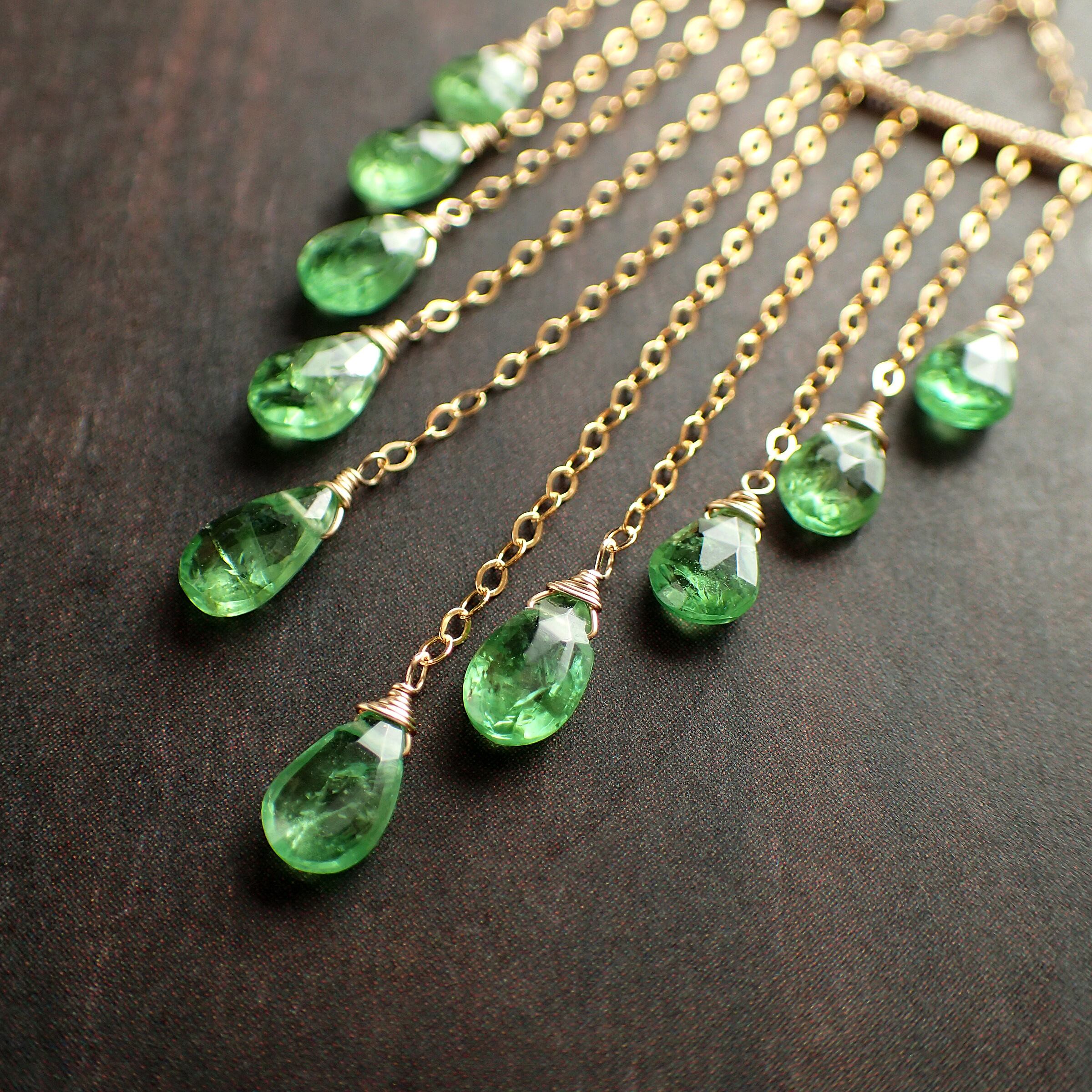 このグリーンガーネットのシャンデリアピアスは、瑞々しいグリーンガーネットの魅力が際立つ美しいアクセサリーです。