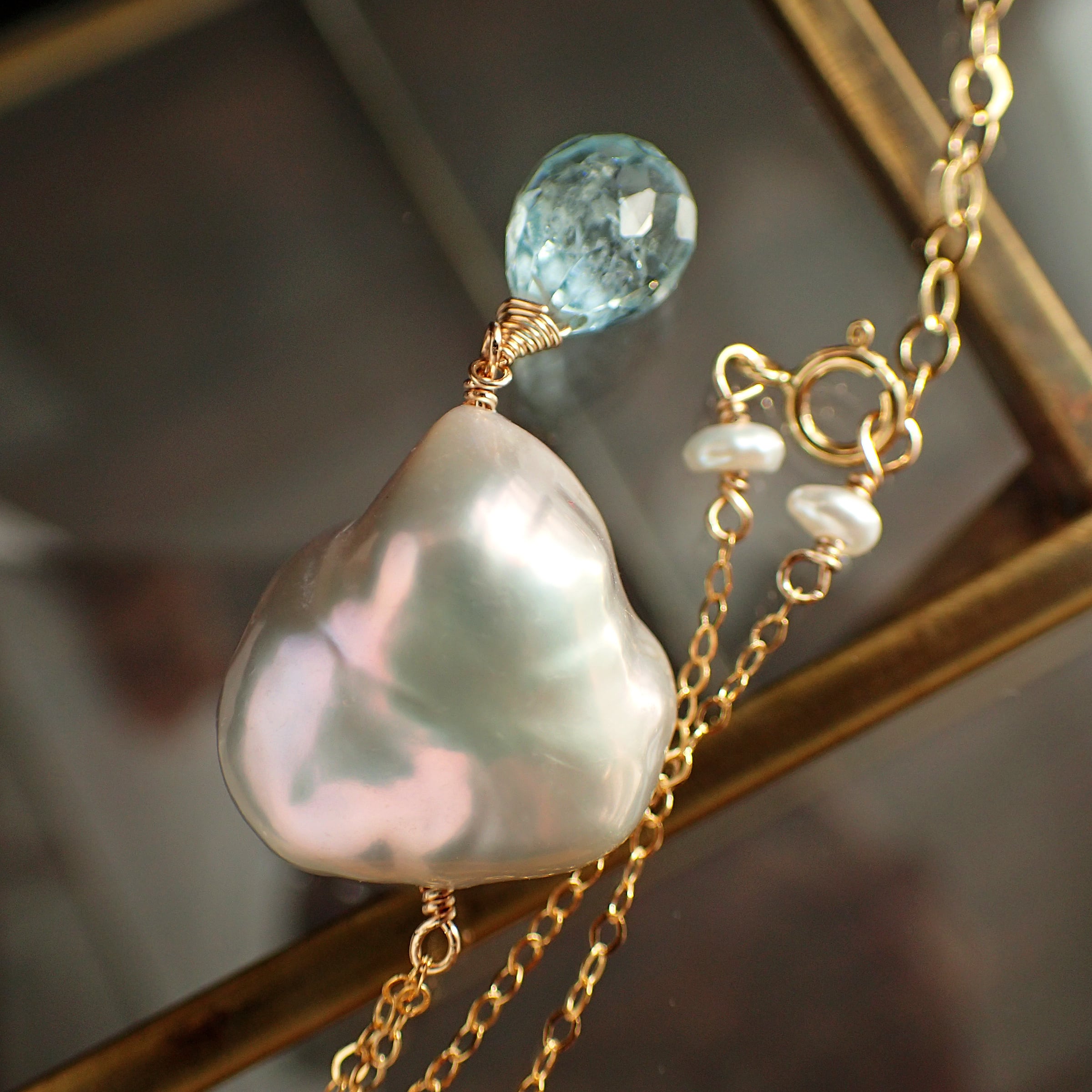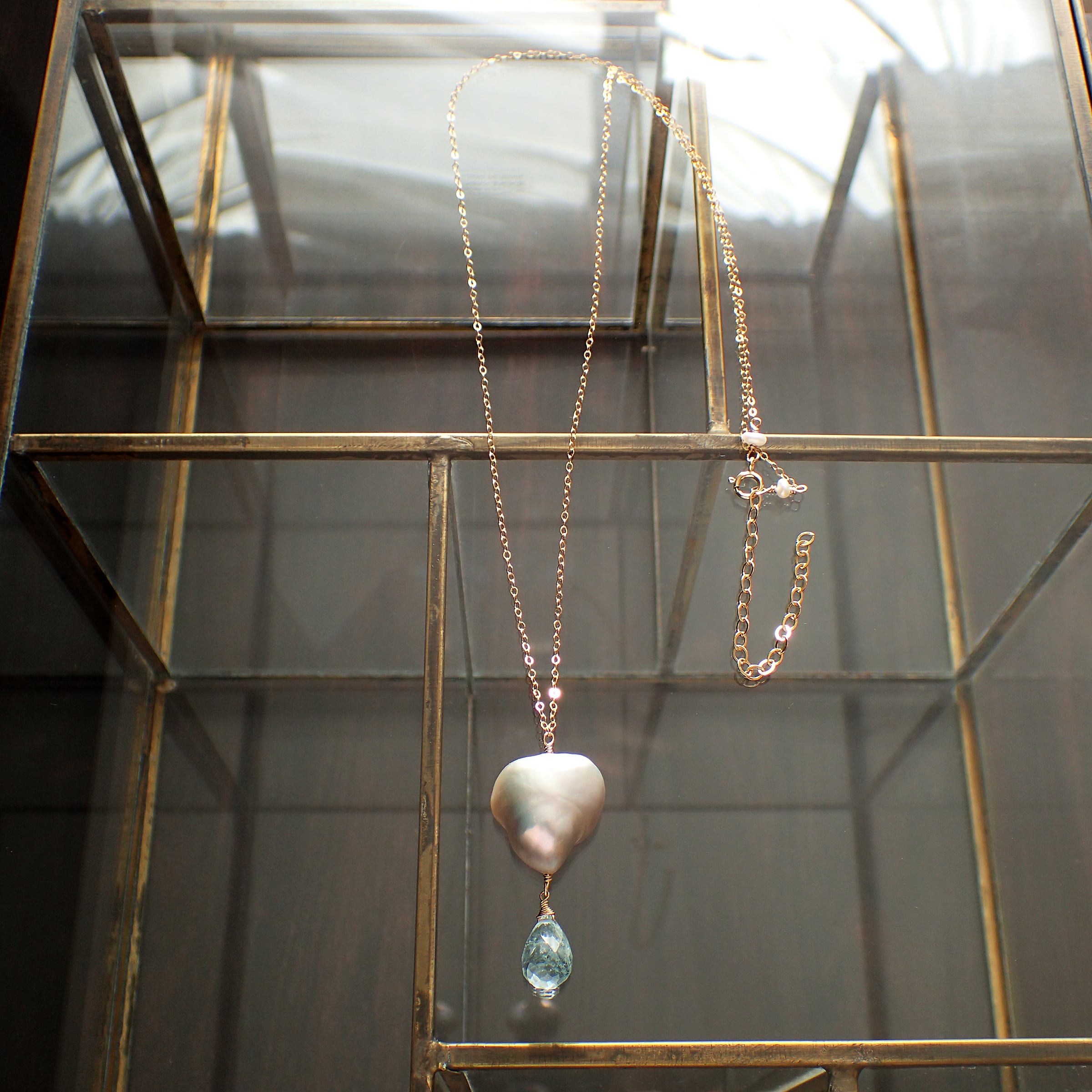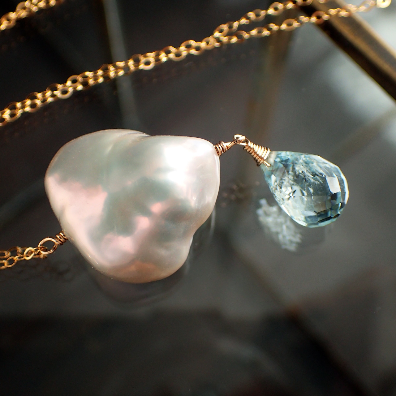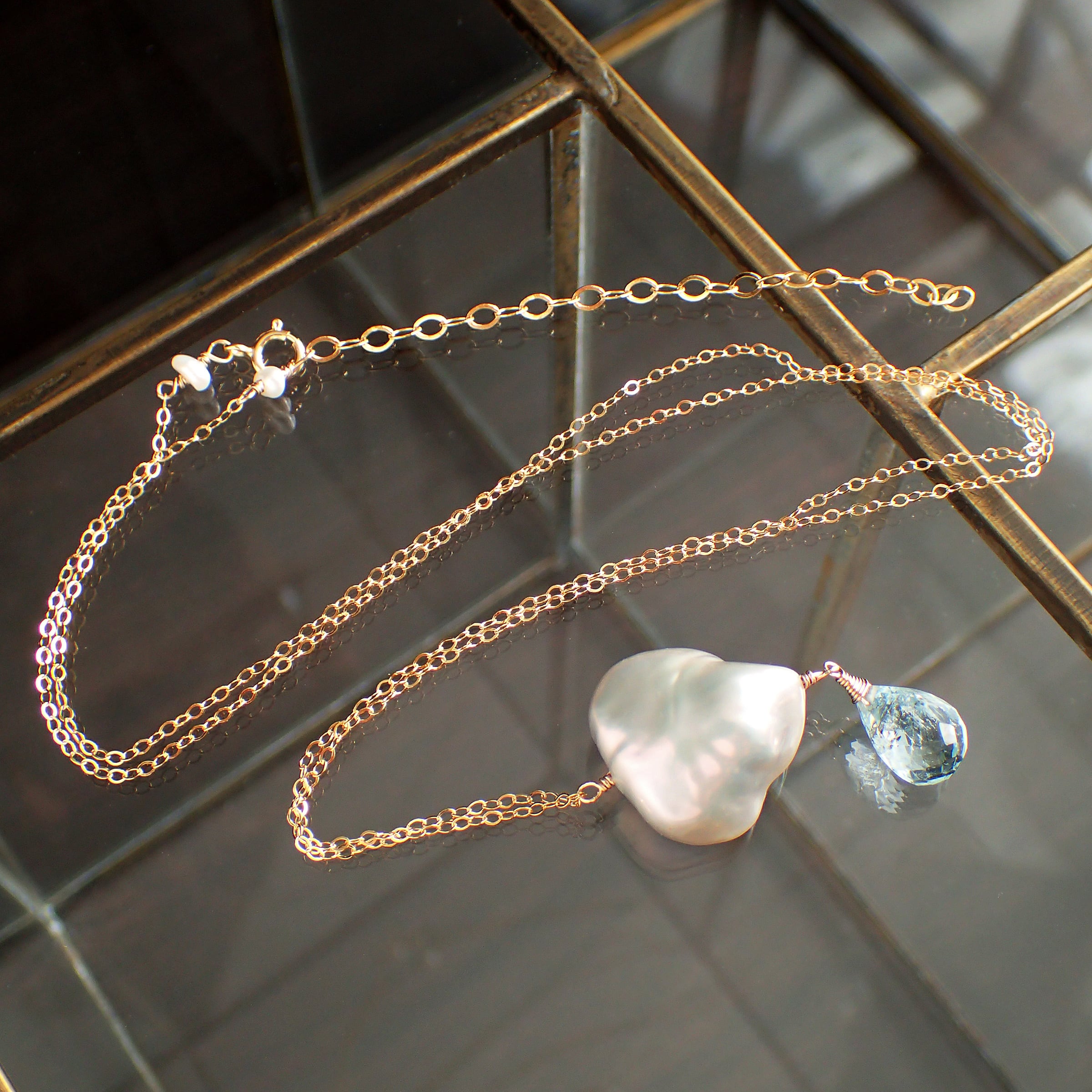 # 大粒バロックパール&アクアマリンのしずくネックレス