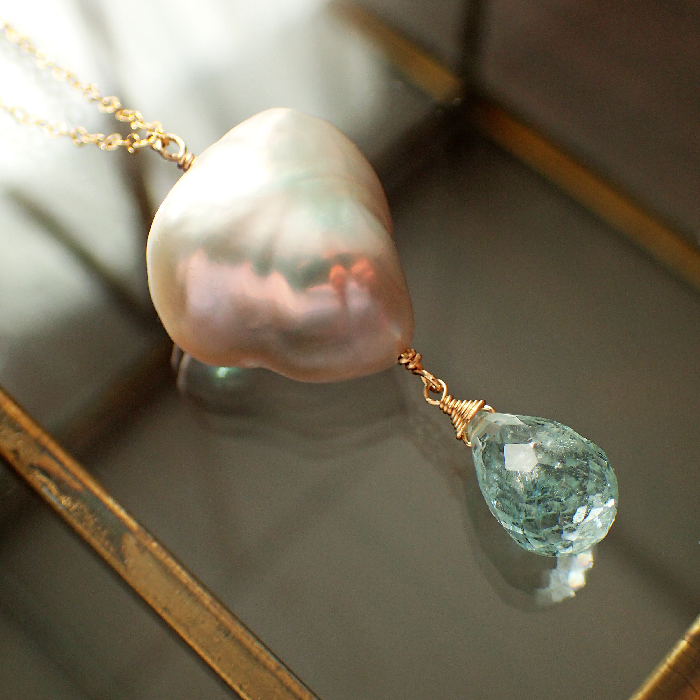 この魅力的なネックレスは、大粒のバロックパールとアクアマリンのしずくが美しく組み合わさった、特別なデザインが特長です。