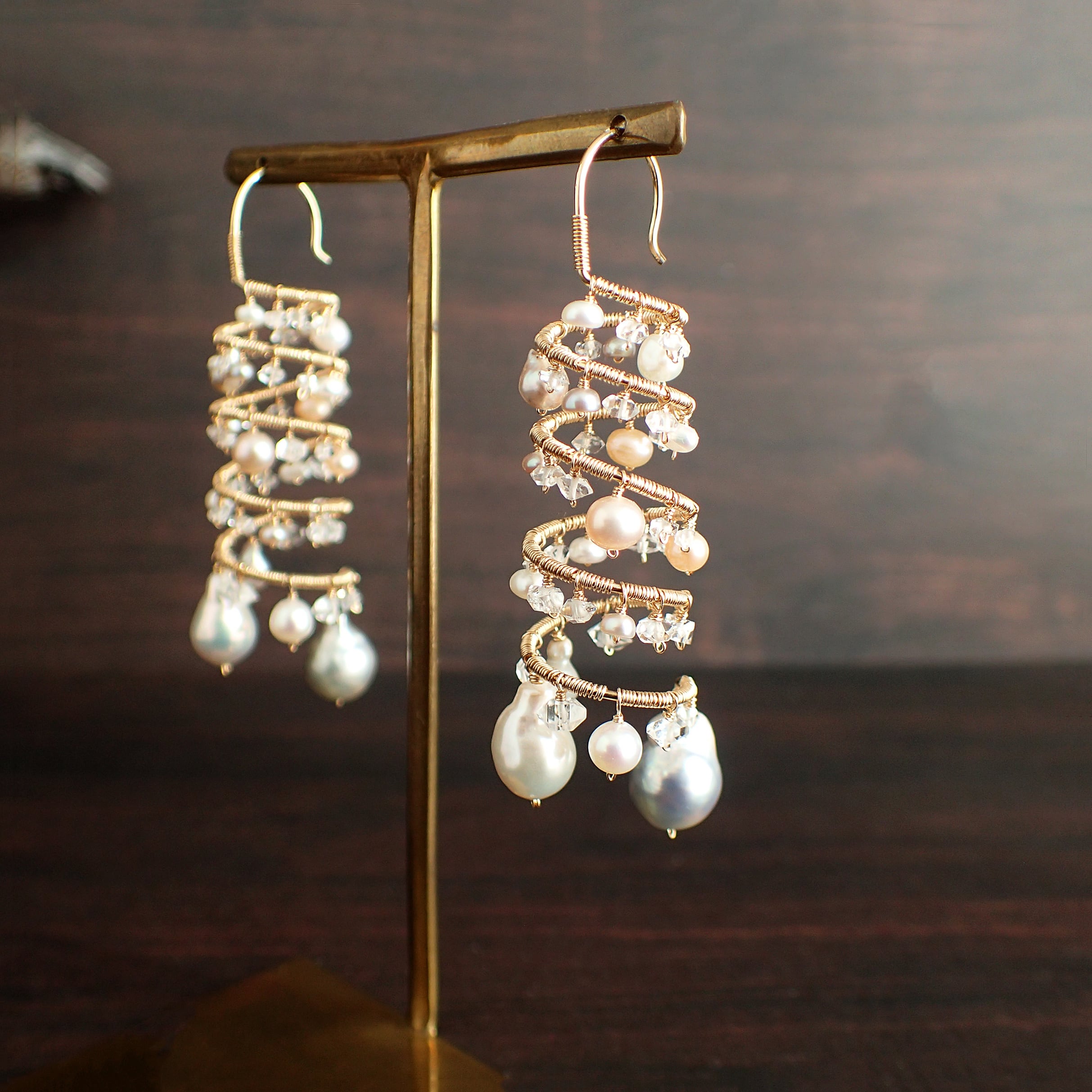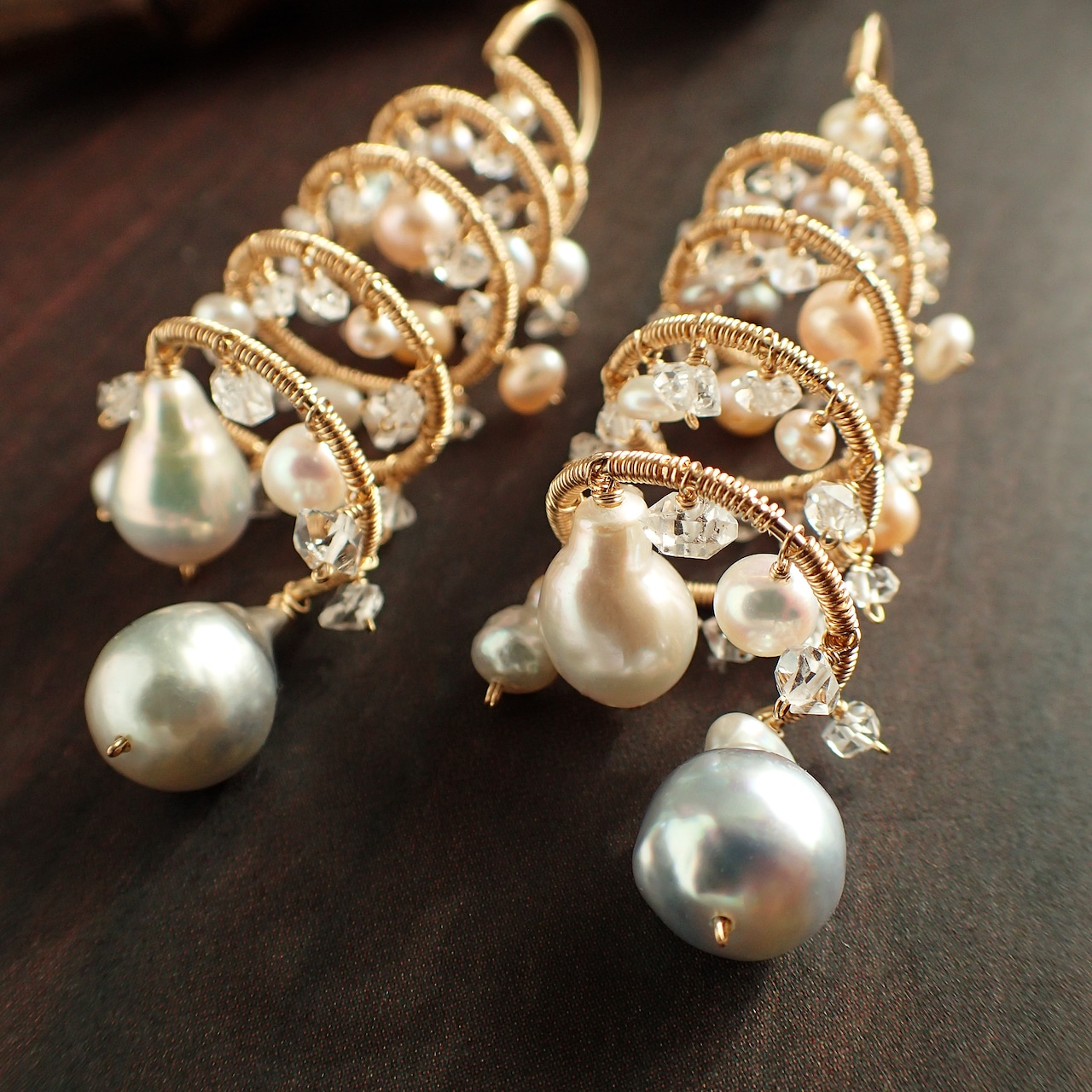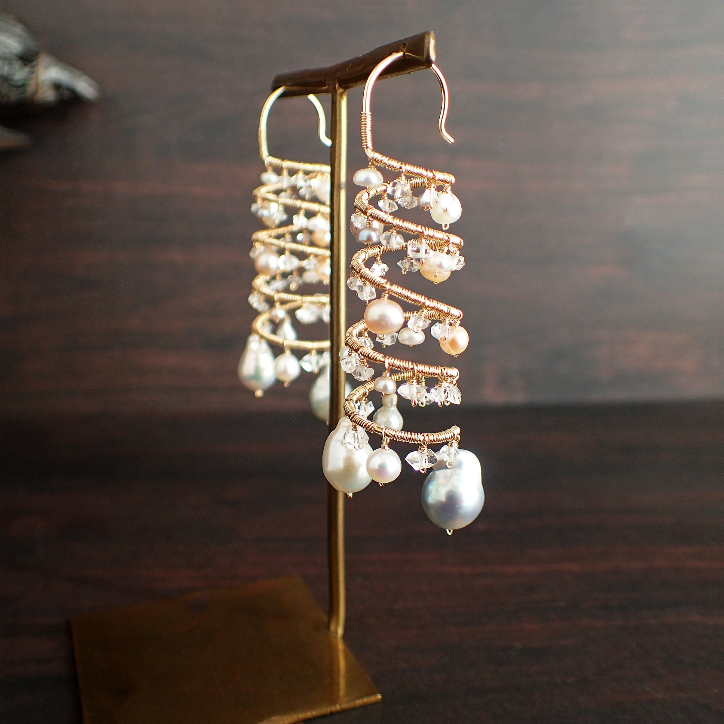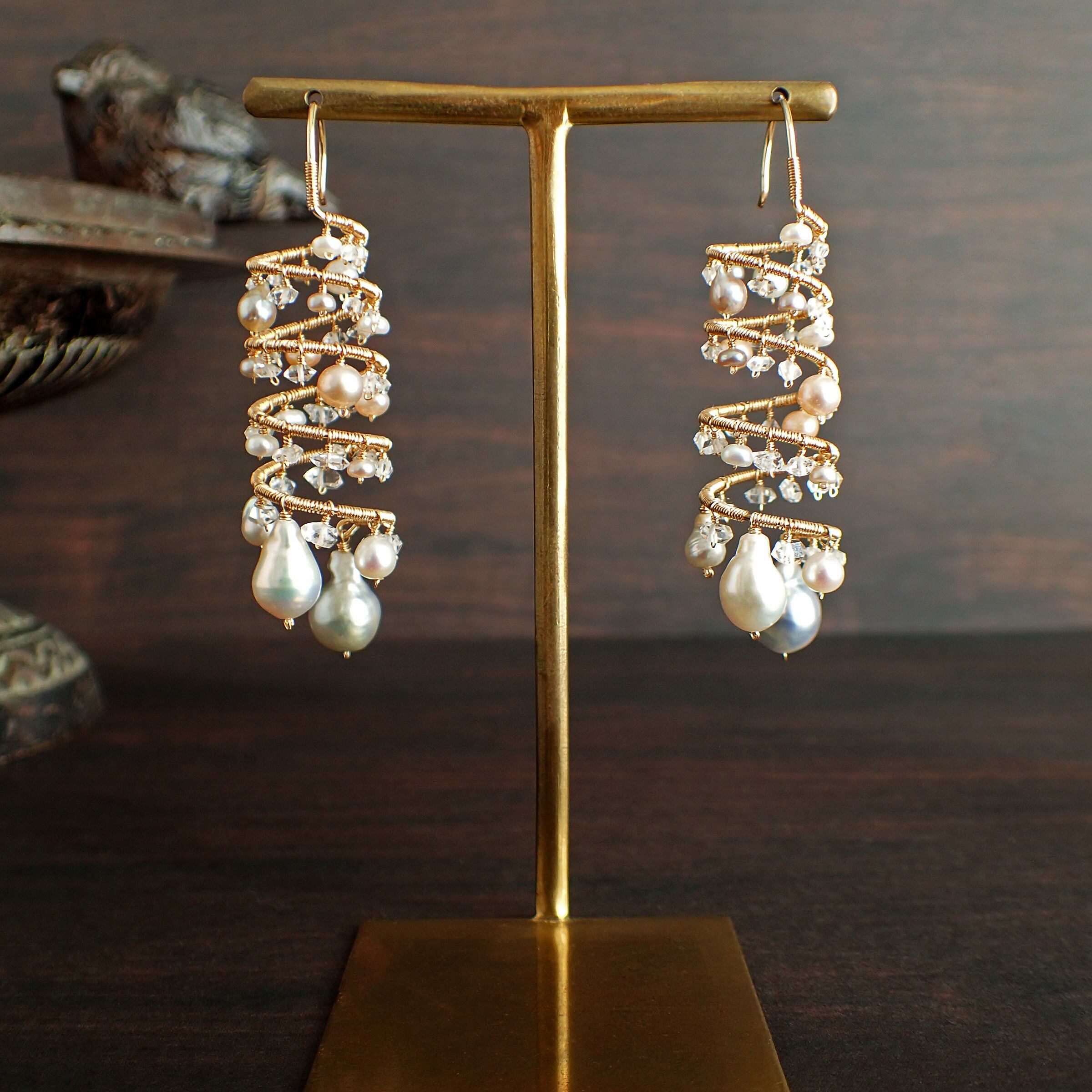 形の異なる大小のあこやバロックパールや淡水パール、ハーキマーダイヤモンドを使用した特別なデザインが特長です。