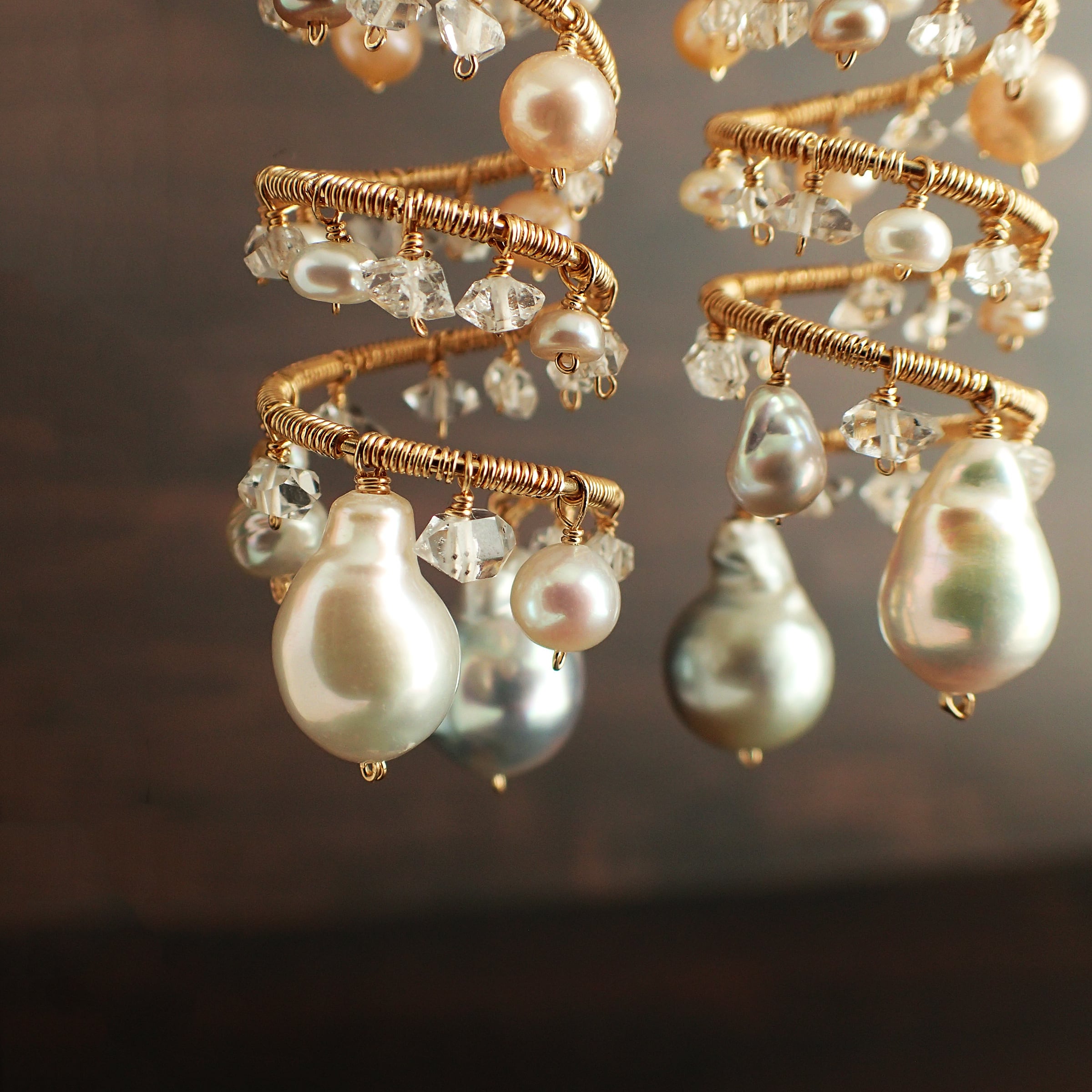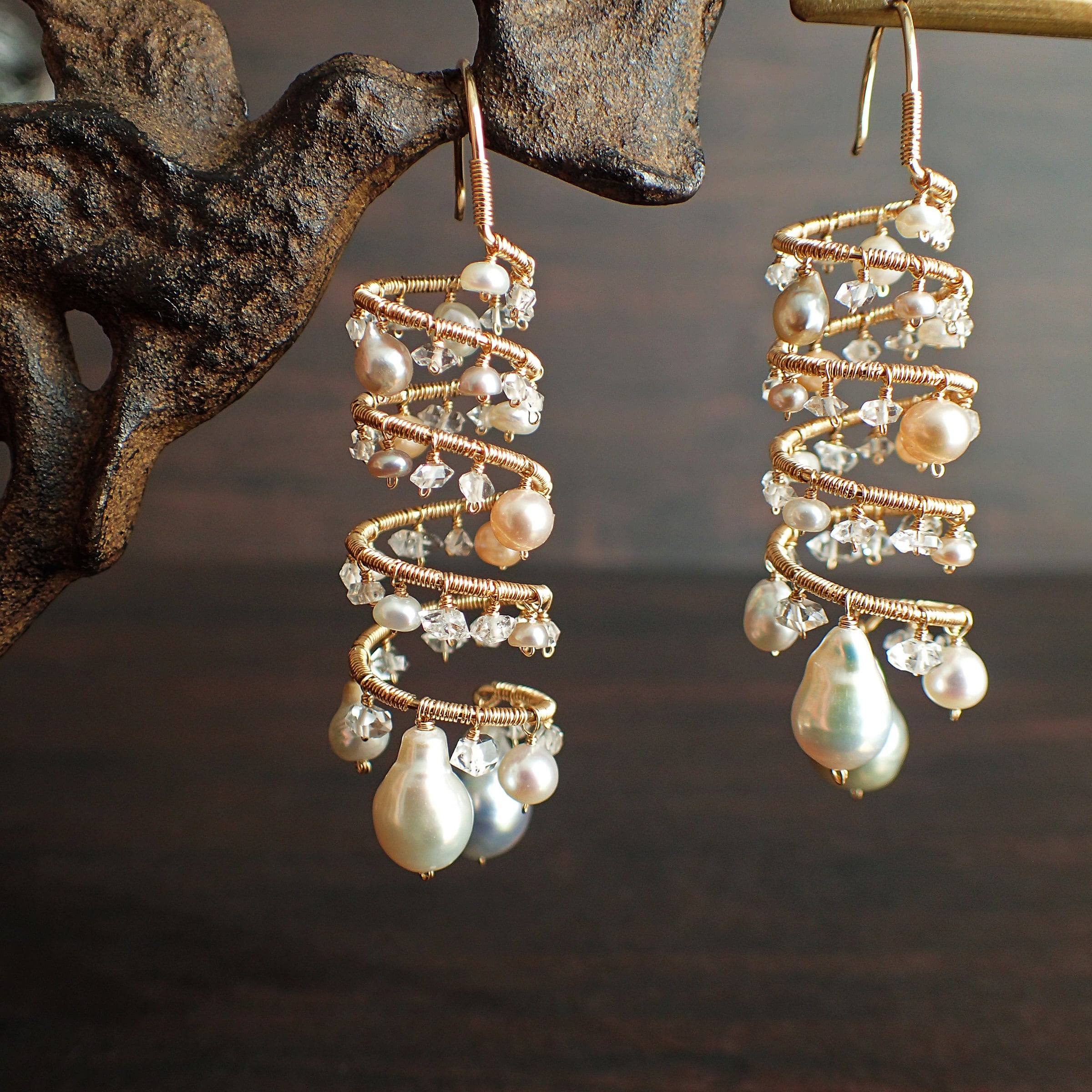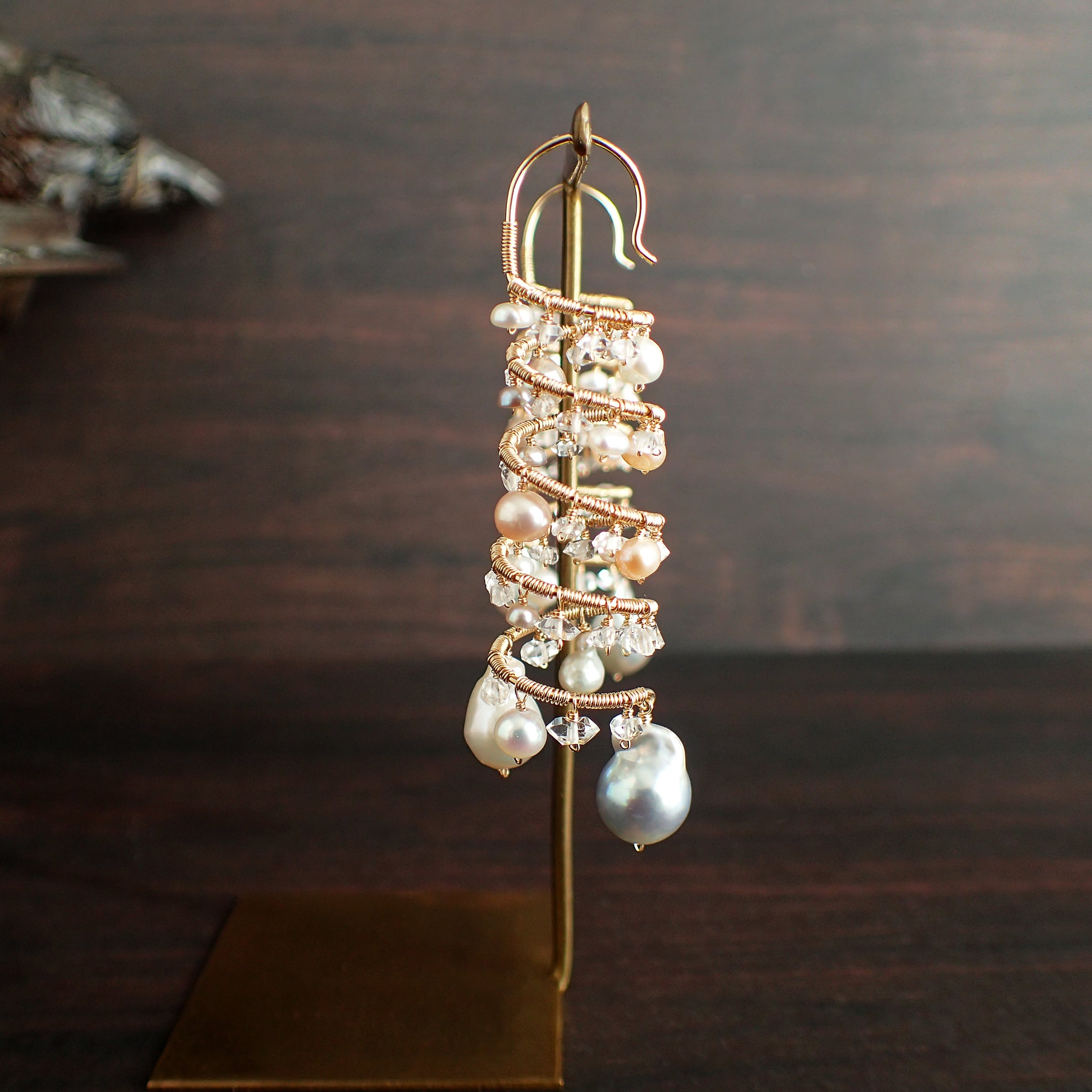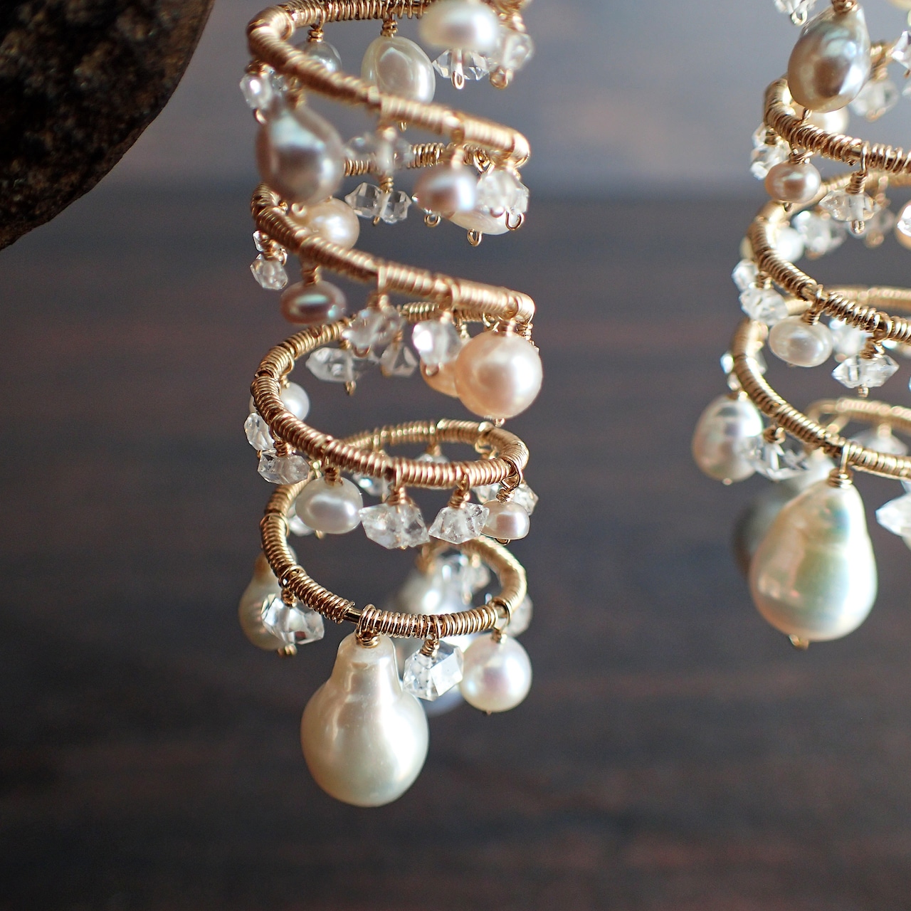 形の異なる大小のあこやバロックパールや淡水パール、ハーキマーダイヤモンドを使用した特別なデザインが特長です。