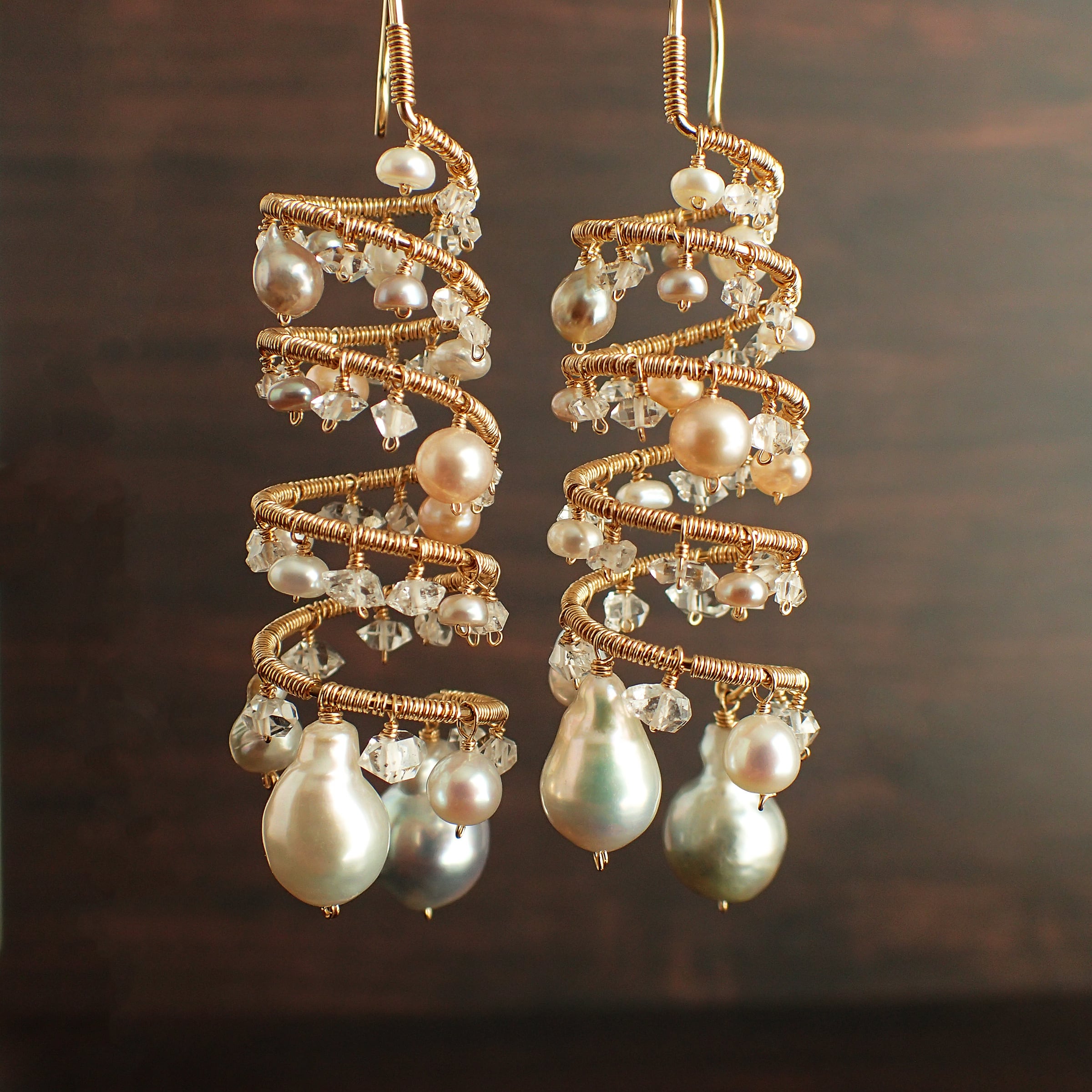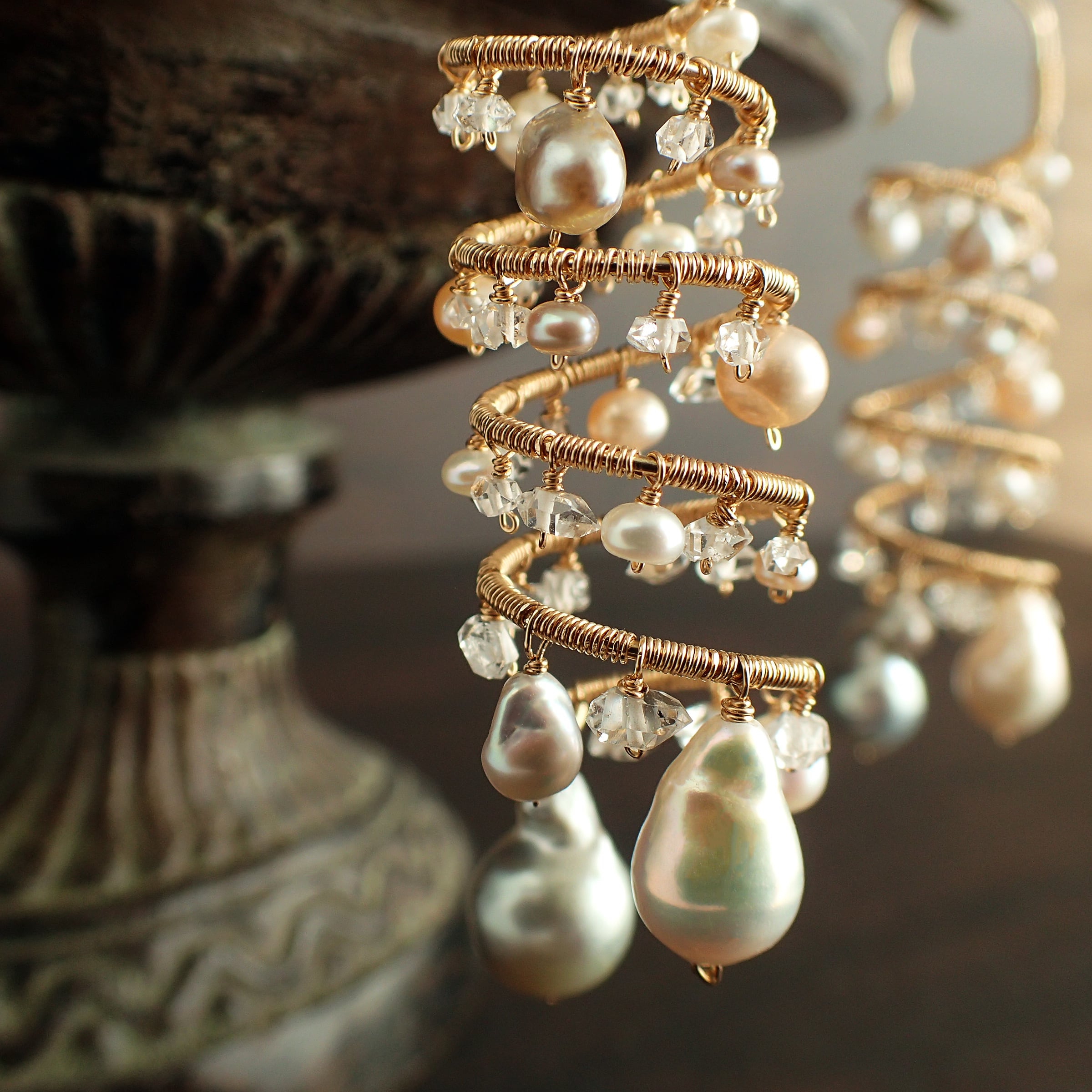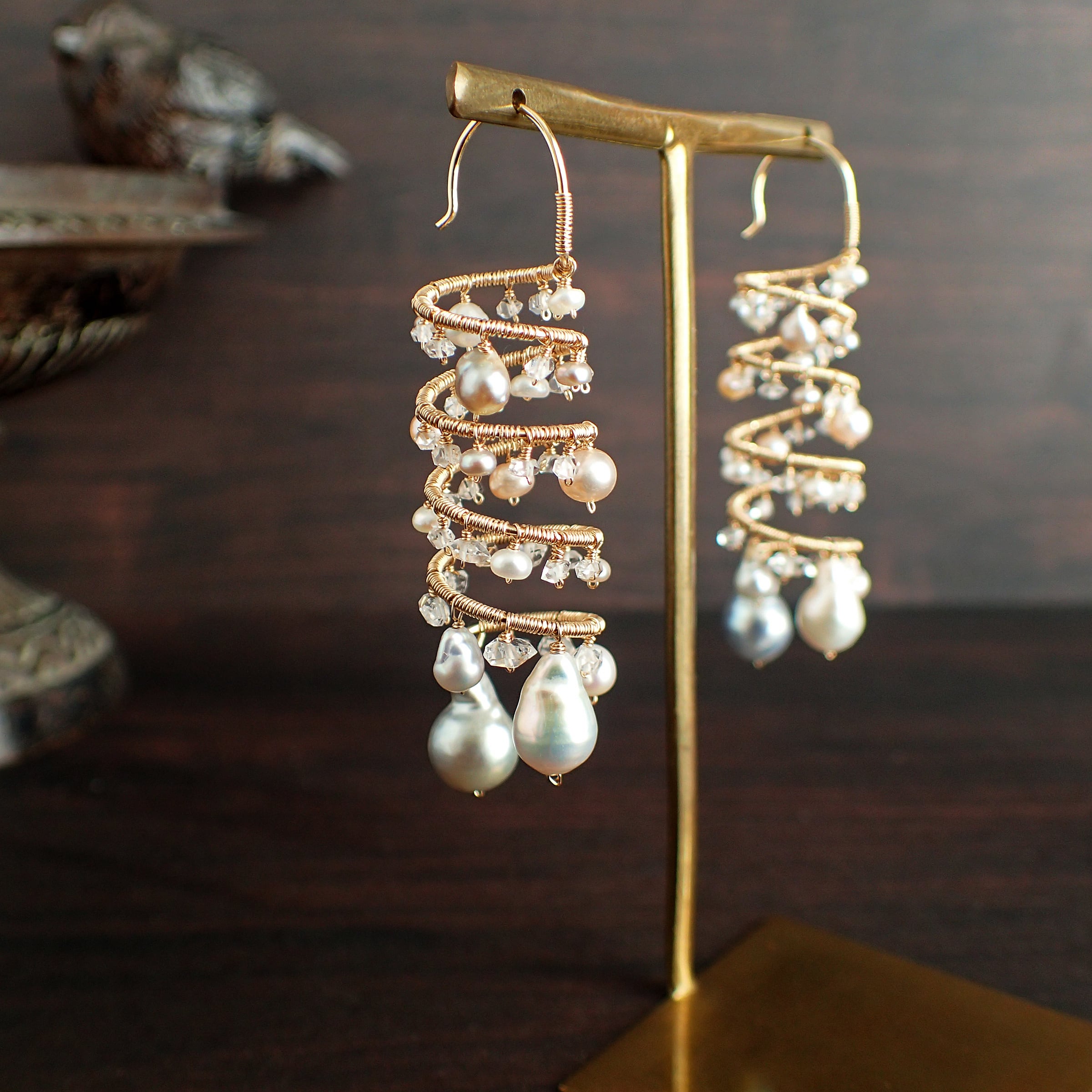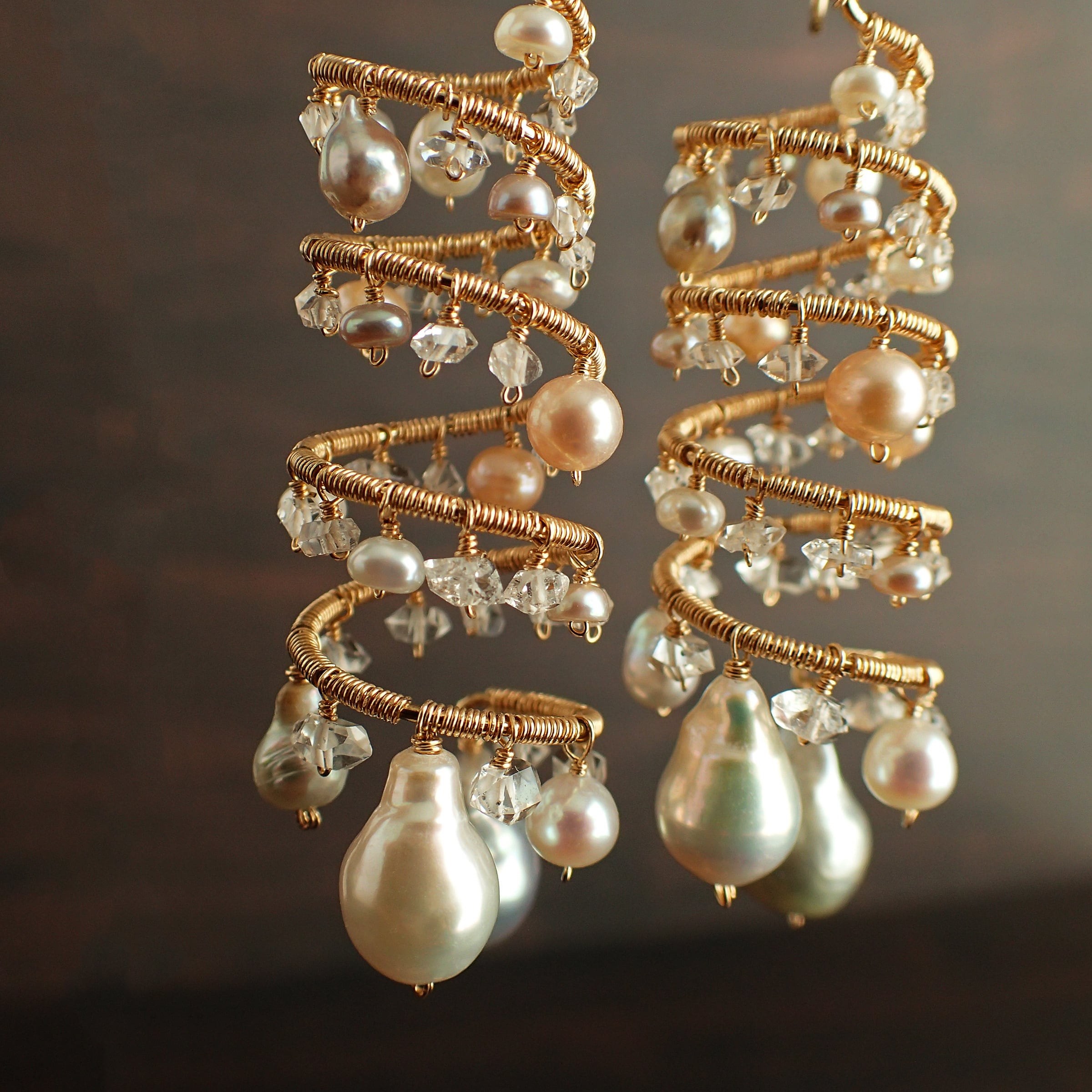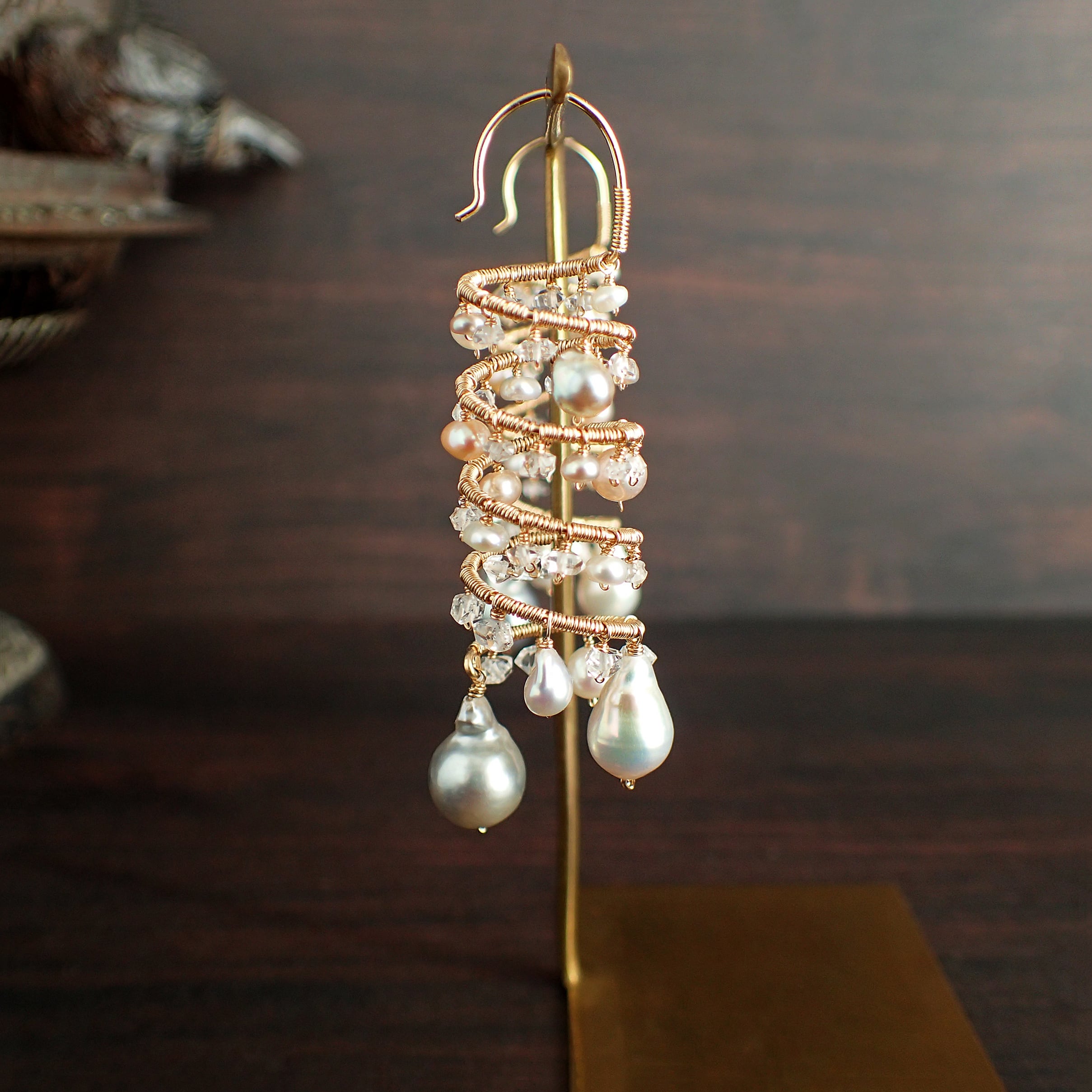 形の異なる大小のあこやバロックパールや淡水パール、ハーキマーダイヤモンドを使用した特別なデザインが特長です。