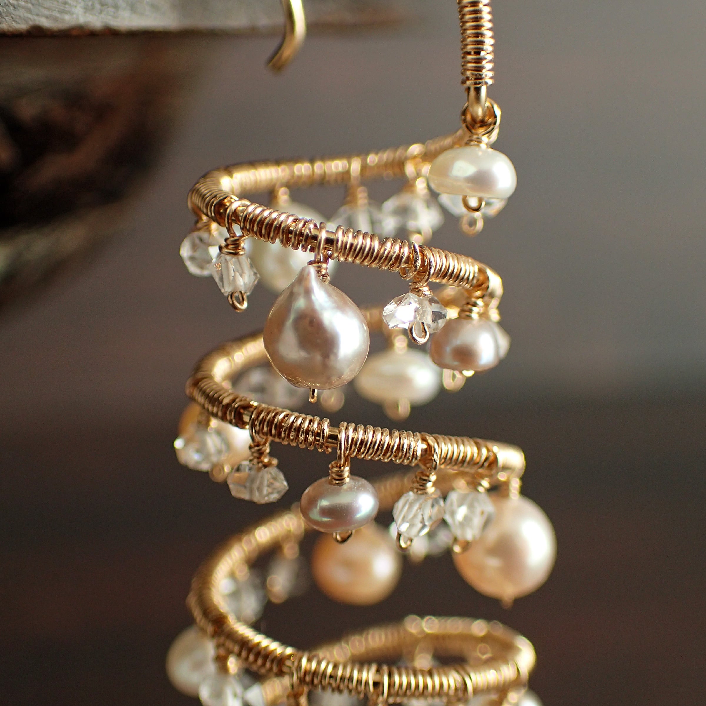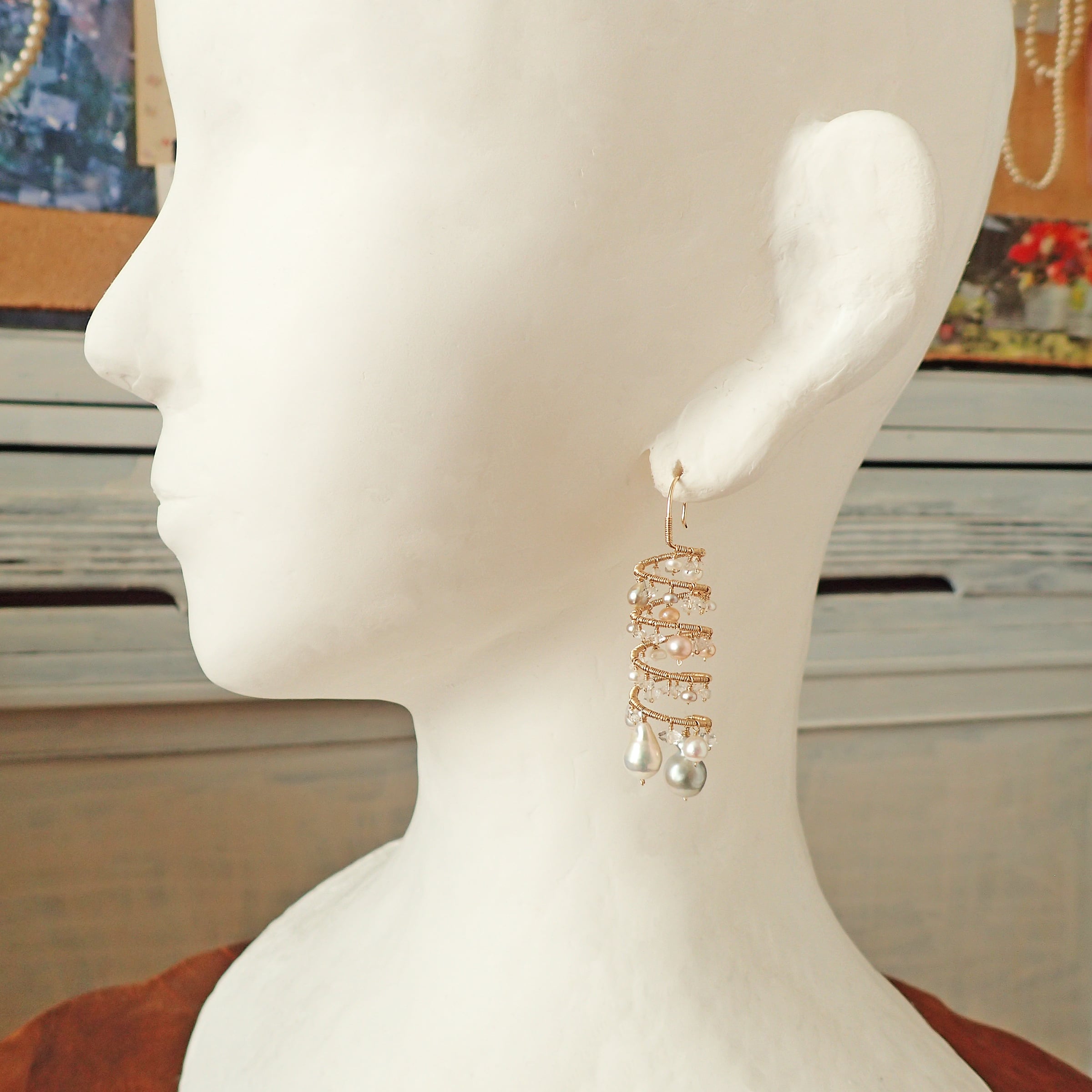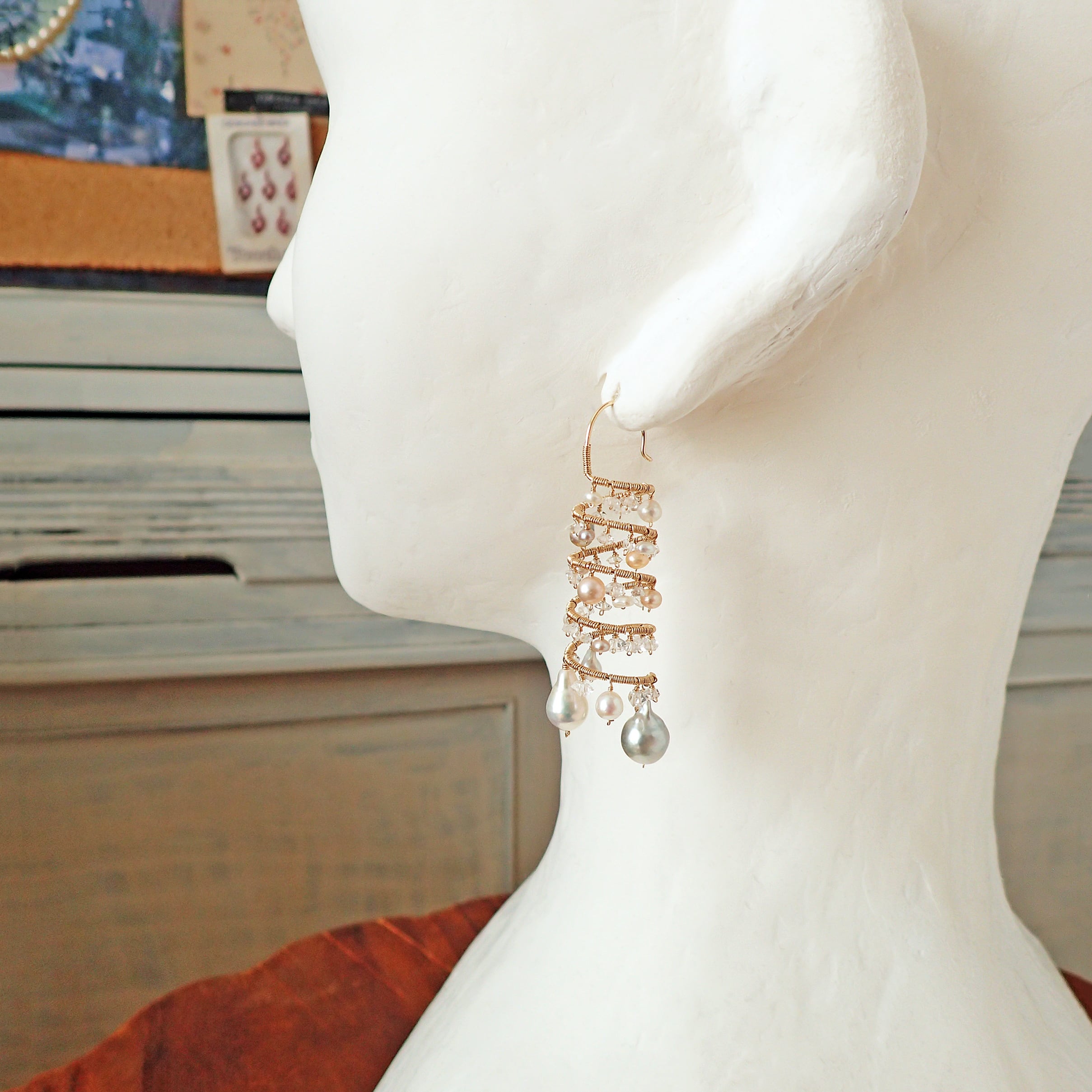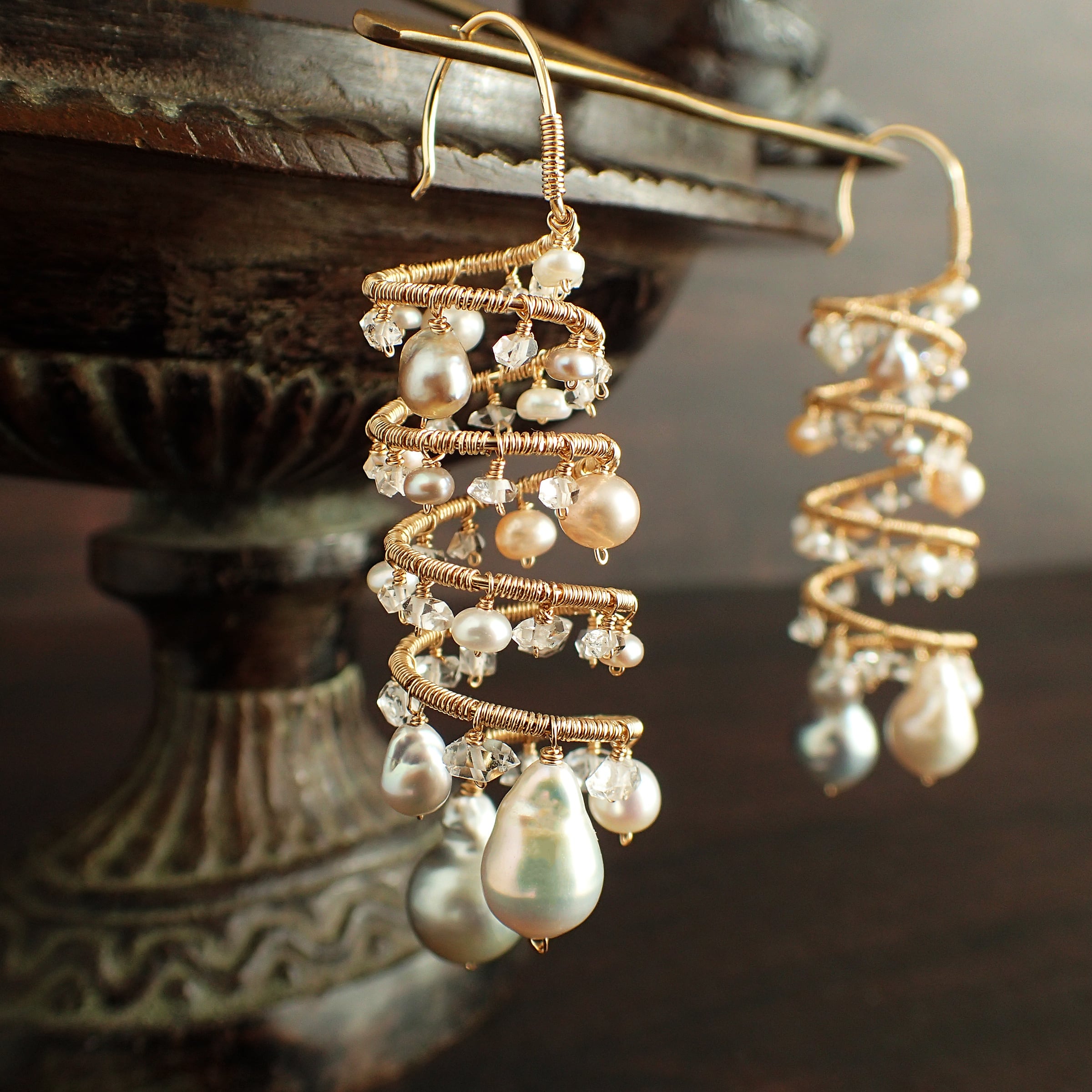形の異なる大小のあこやバロックパールや淡水パール、ハーキマーダイヤモンドを使用した特別なデザインが特長です。
