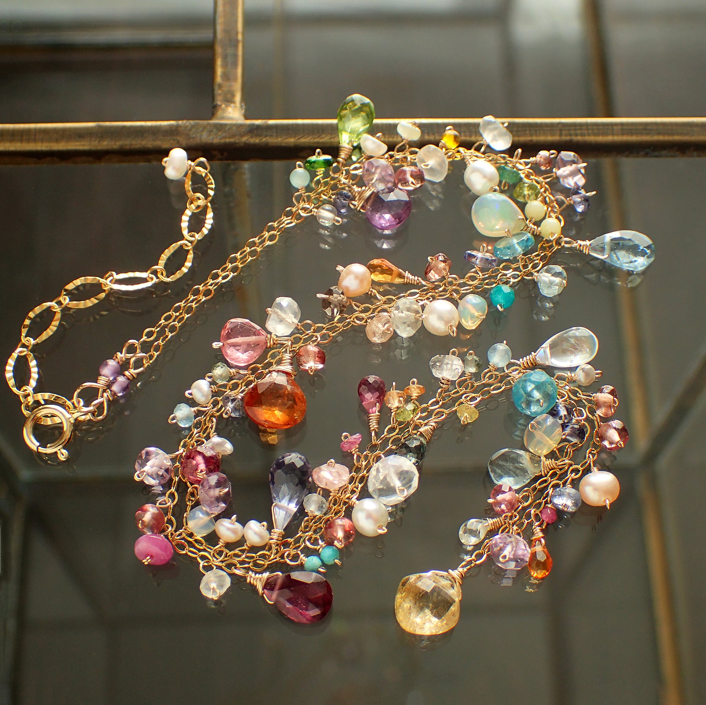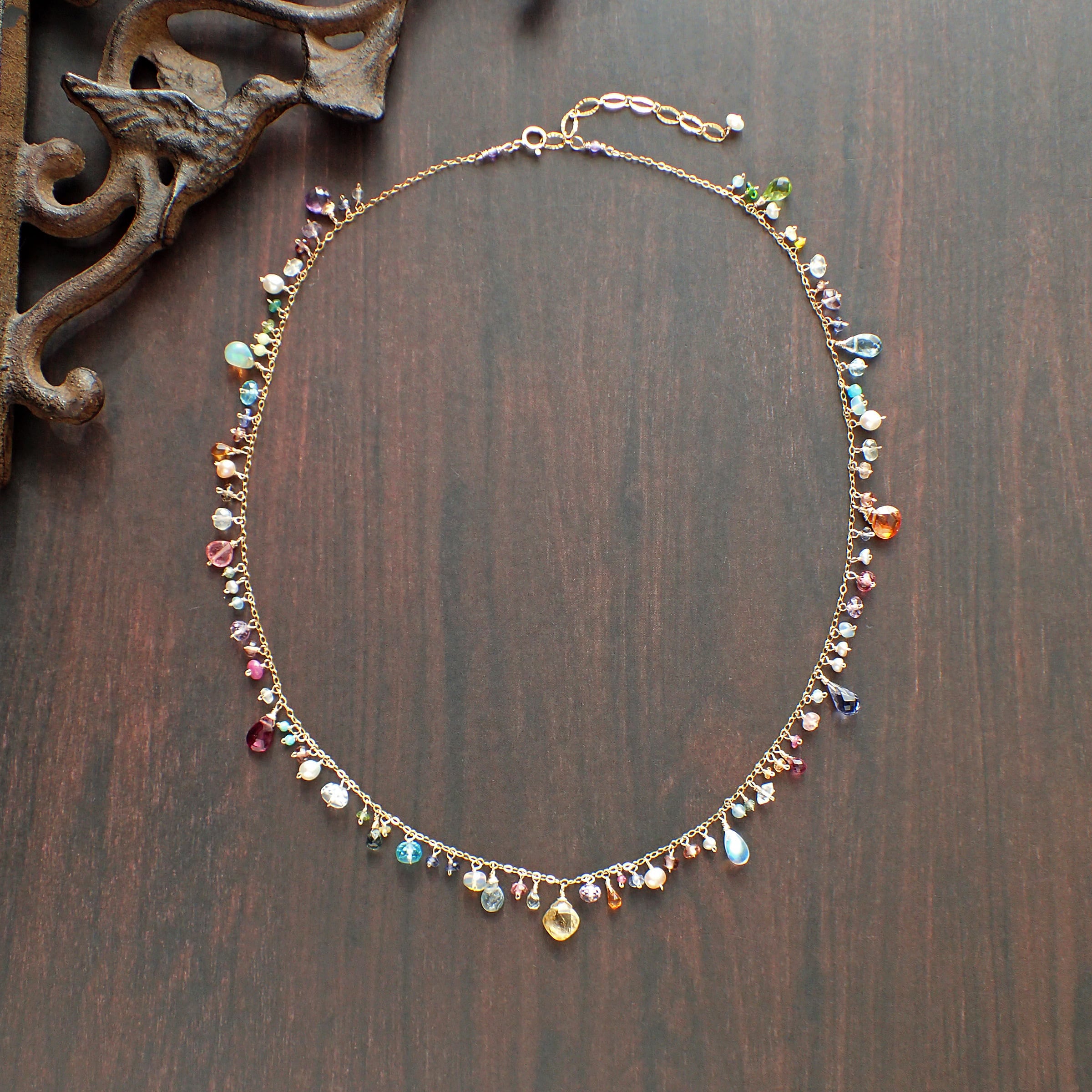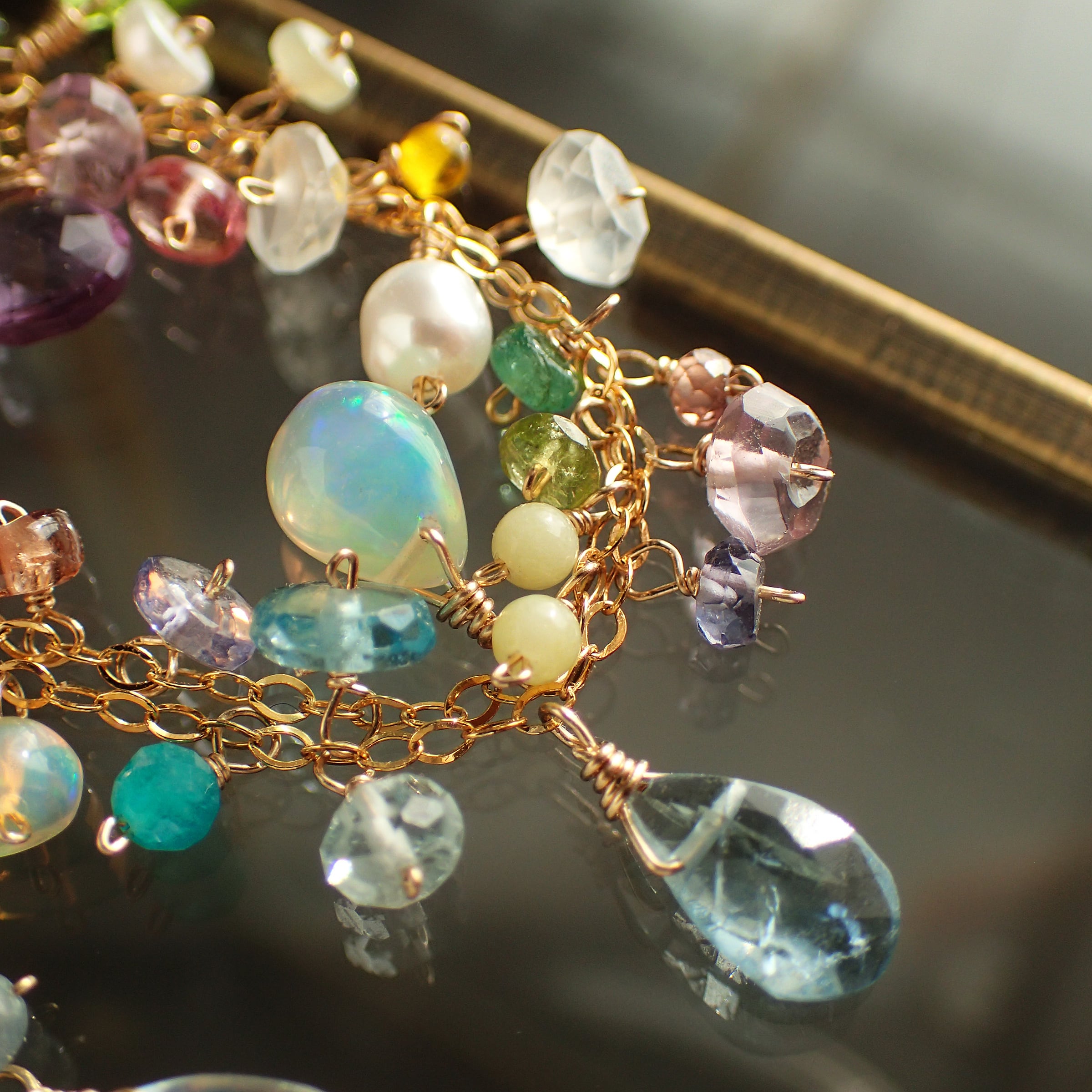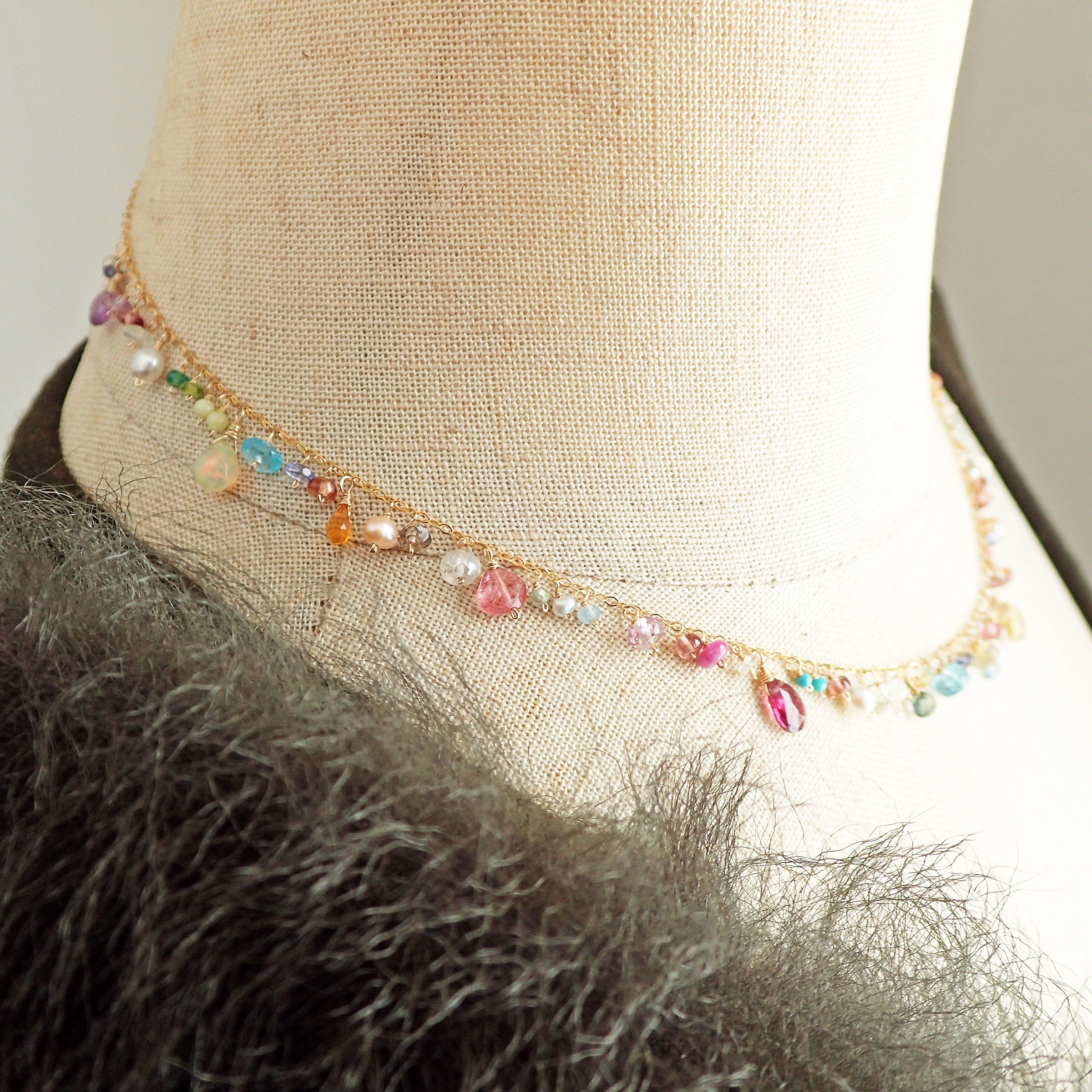 このジェムストーンのネックレスは、センターにインペリアルトパーズを配置し、アクアマリンやオパール、多色のトルマリンやサファイア、ファイヤーオパール、天然のキャッツアイといった色とりどりの美しい天然石が贅沢に組み合わされた華やかなデザインが特長です。