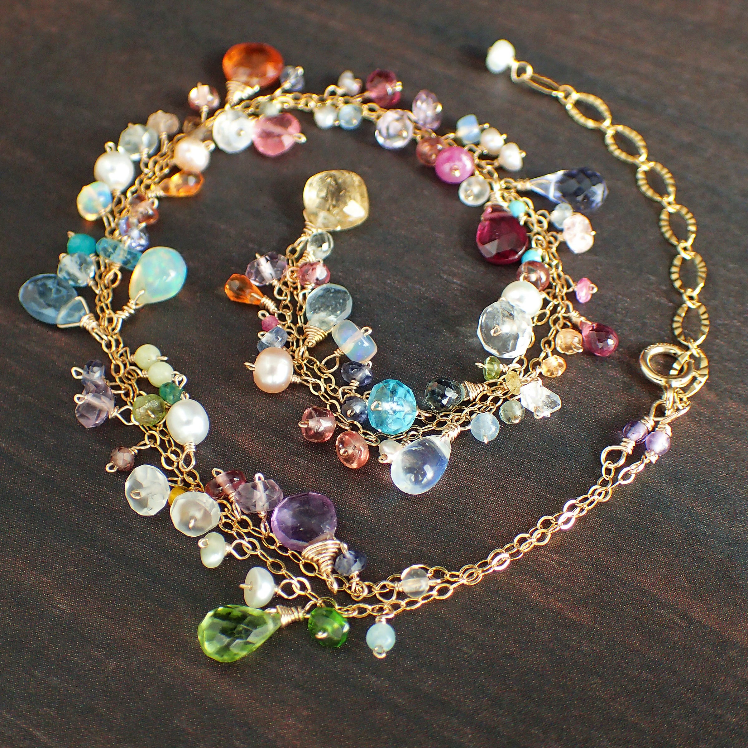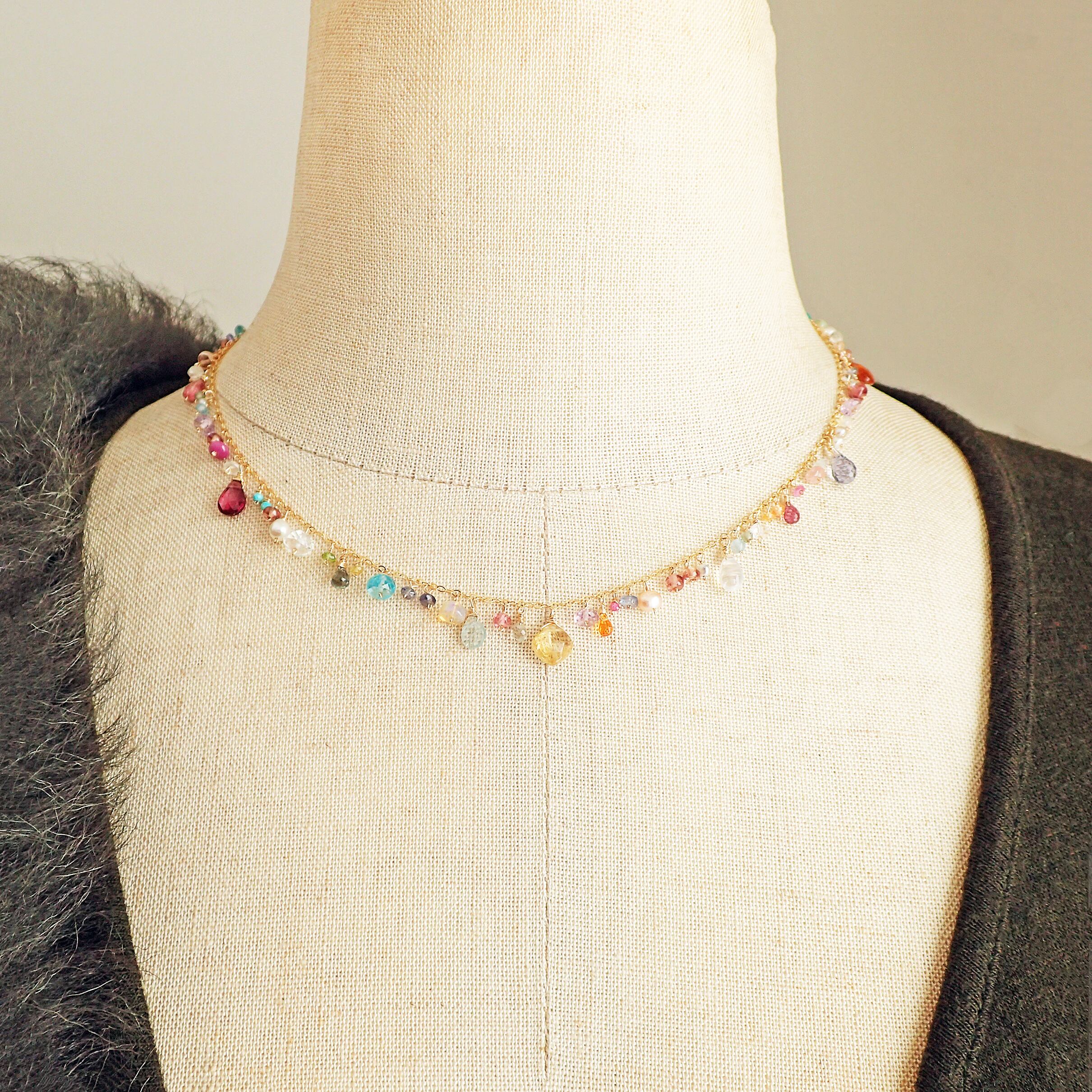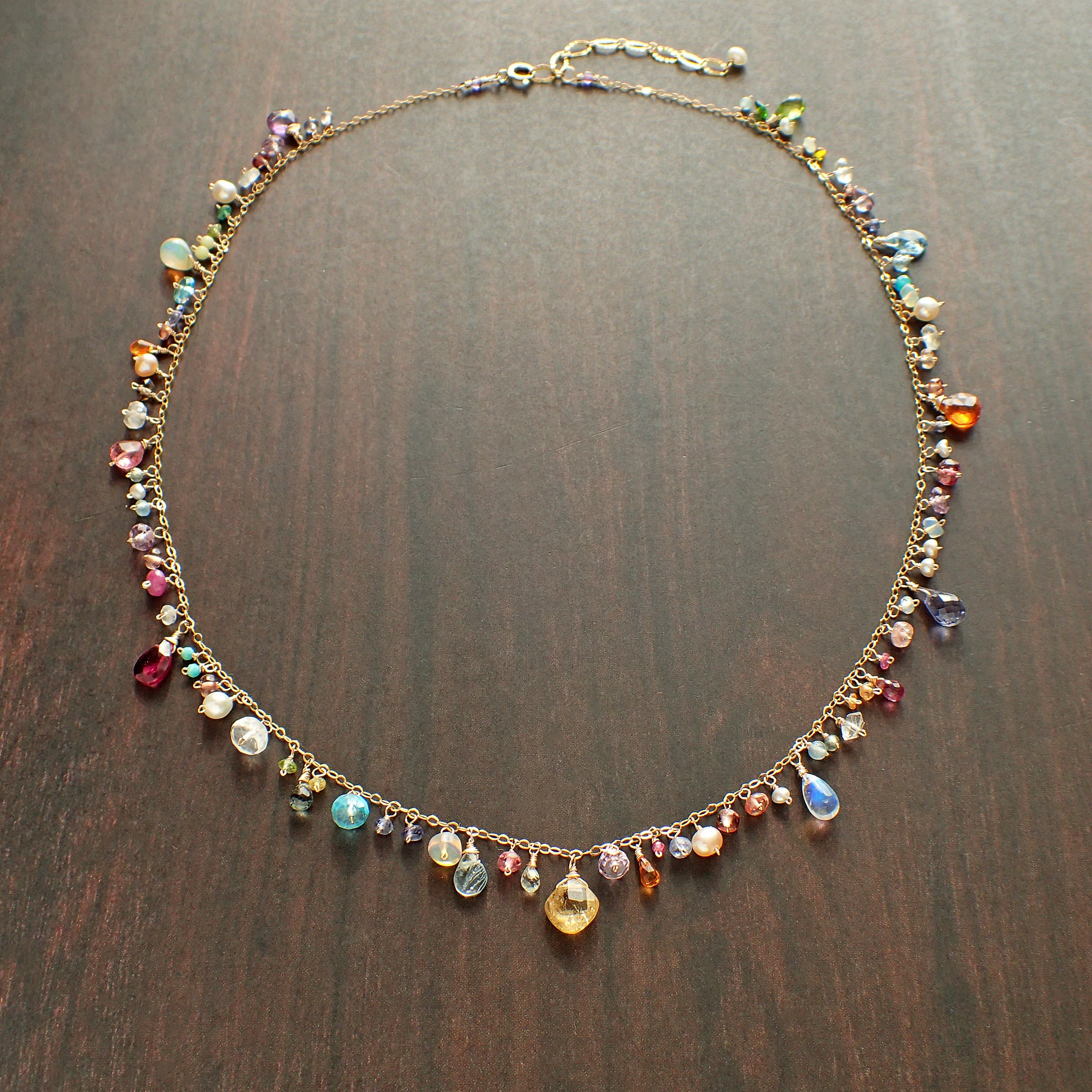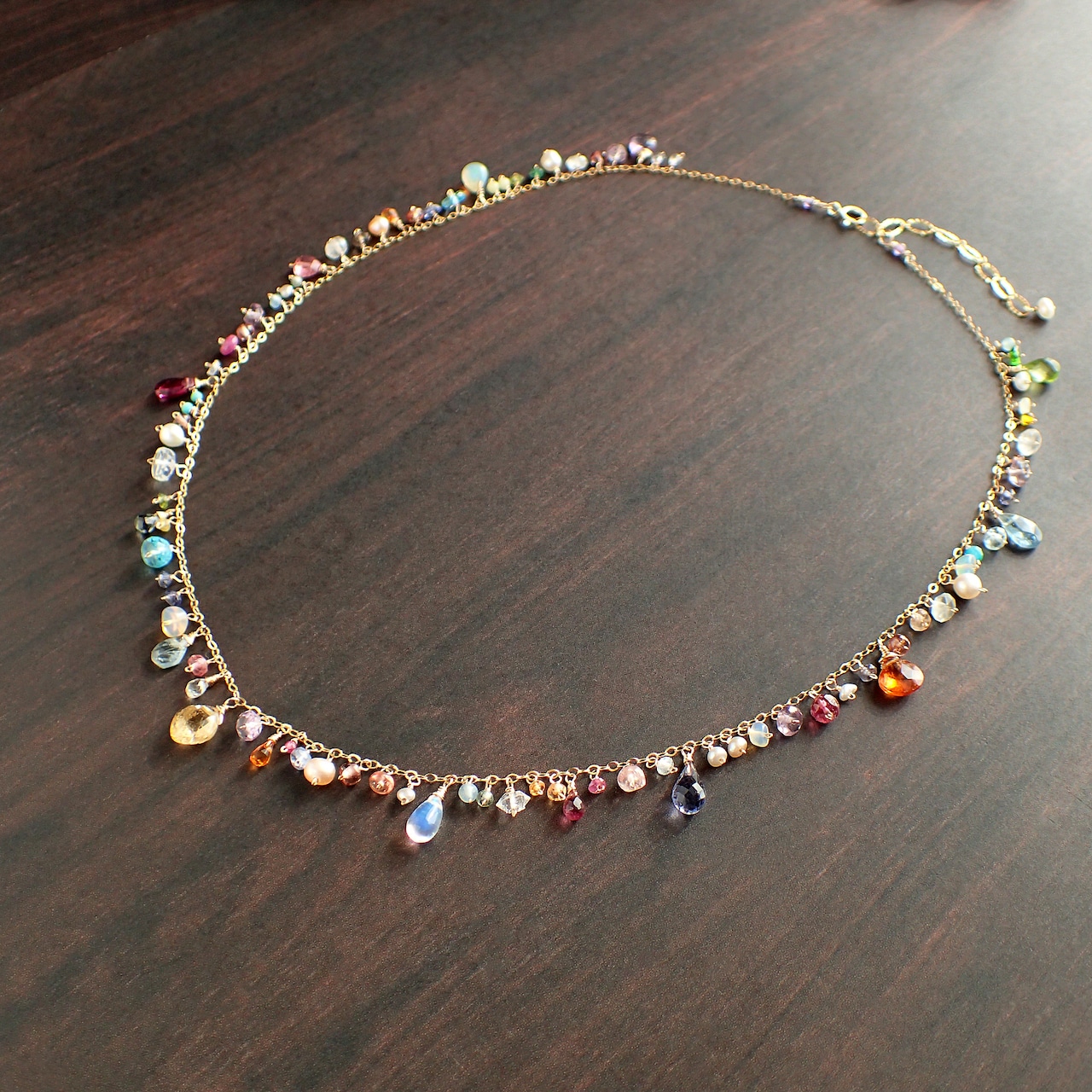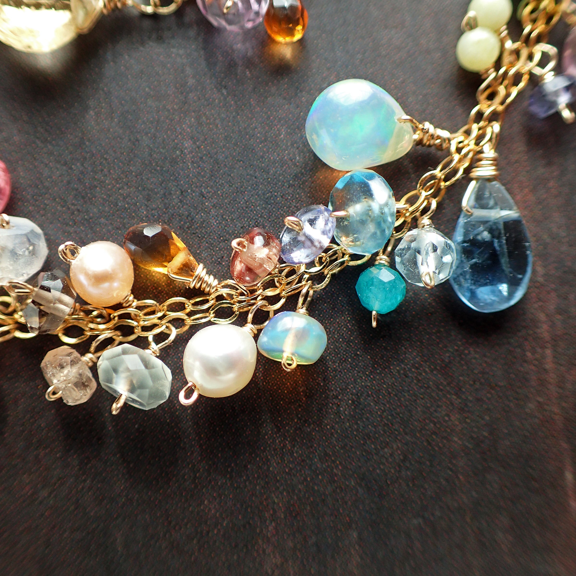 このジェムストーンのネックレスは、センターにインペリアルトパーズを配置し、アクアマリンやオパール、多色のトルマリンやサファイア、ファイヤーオパール、天然のキャッツアイといった色とりどりの美しい天然石が贅沢に組み合わされた華やかなデザインが特長です。