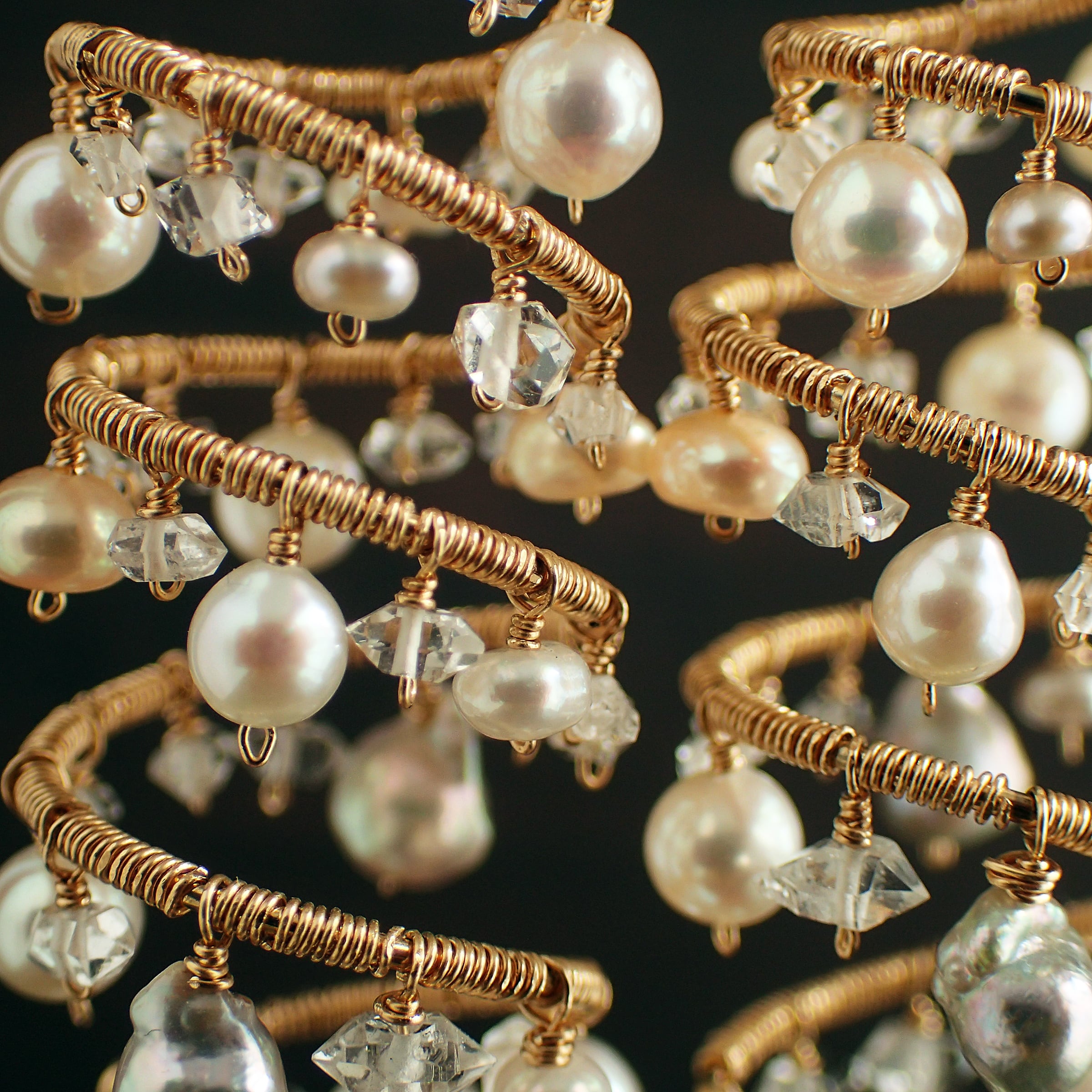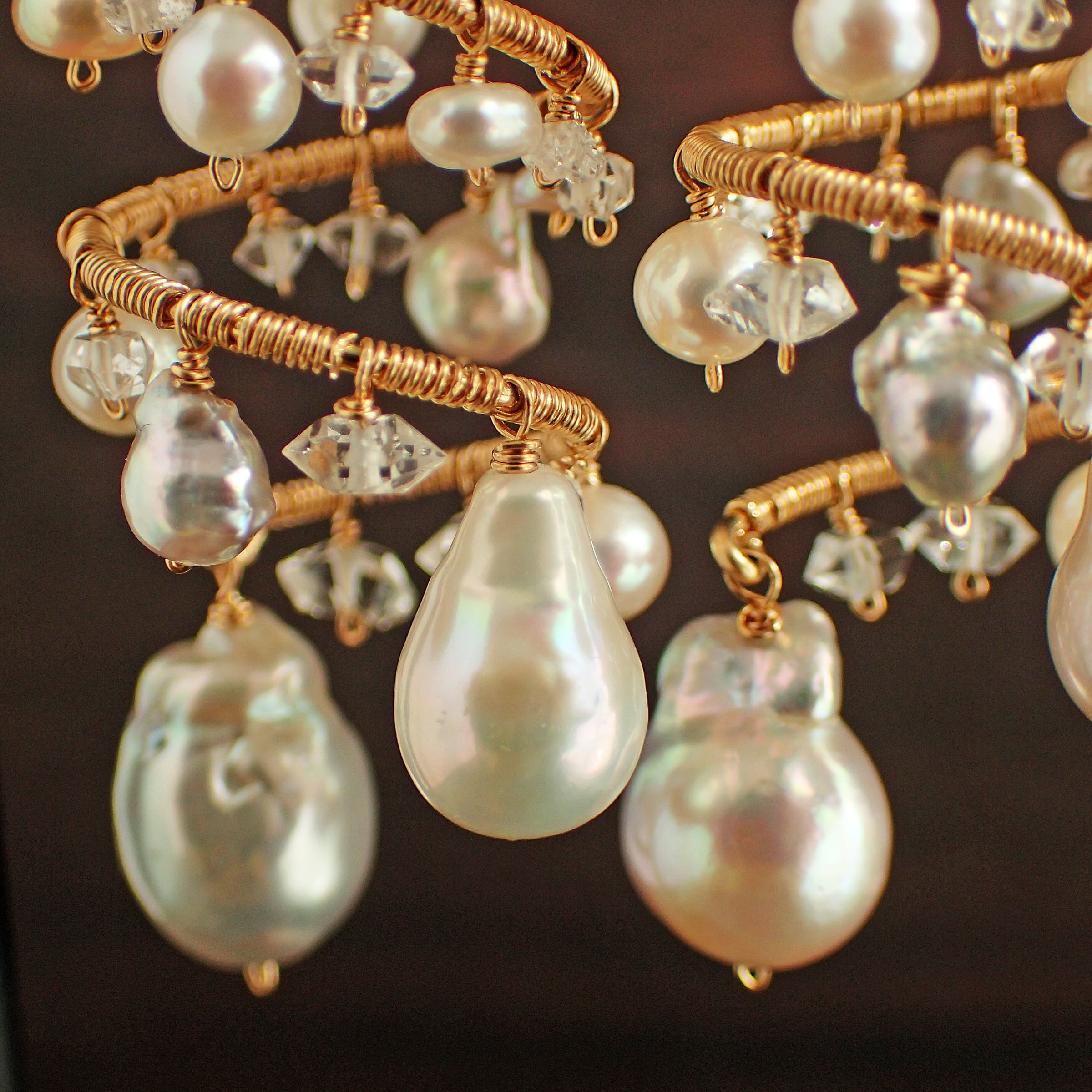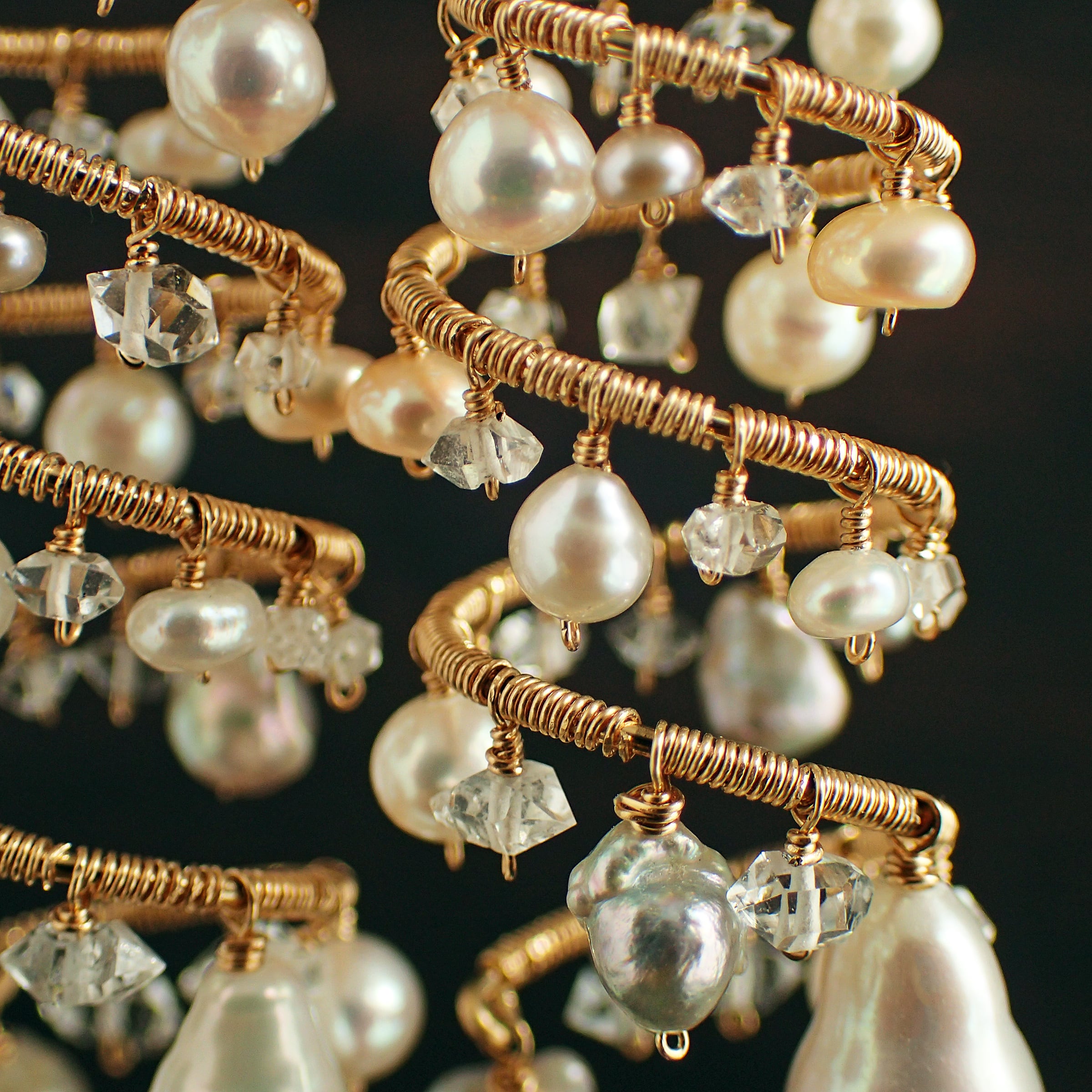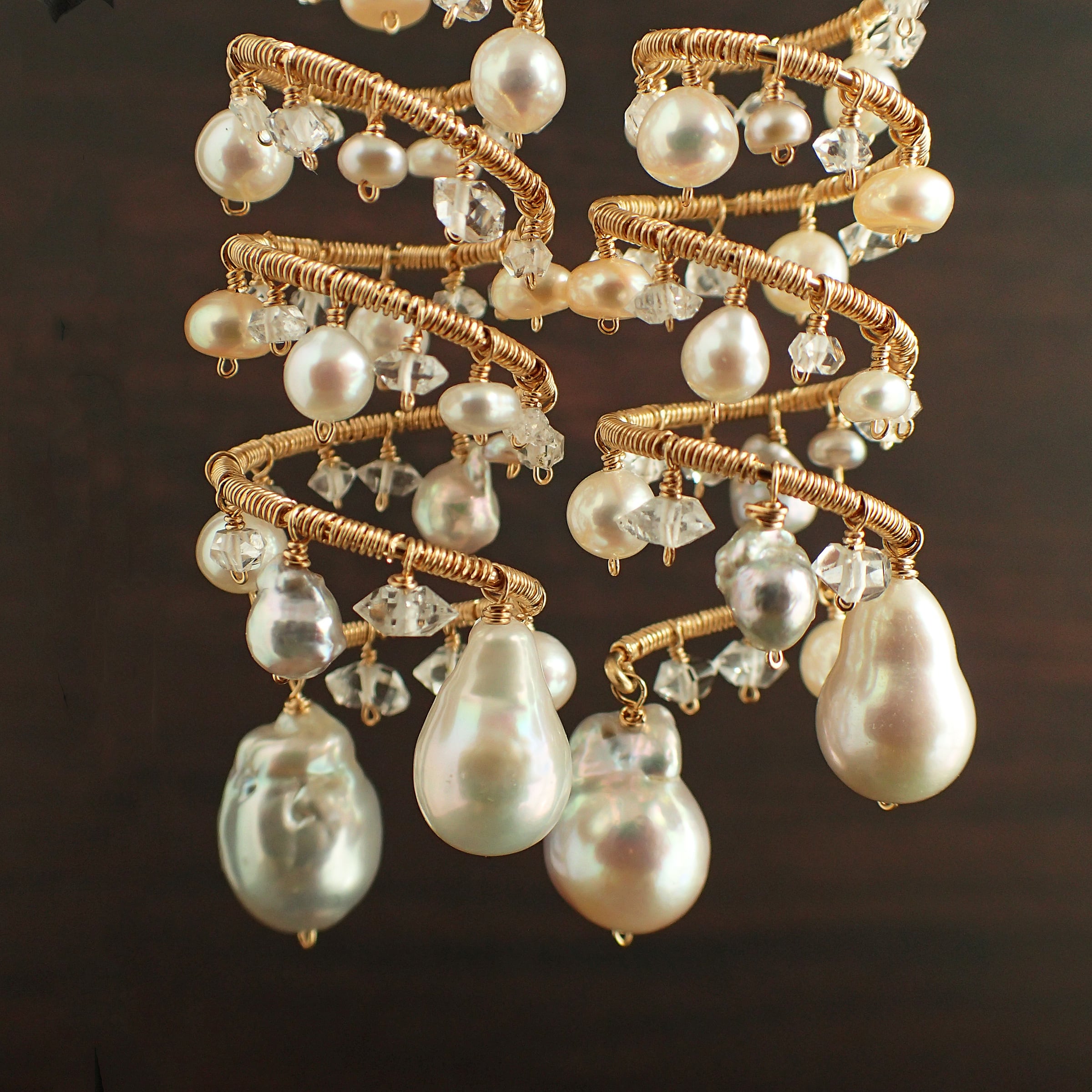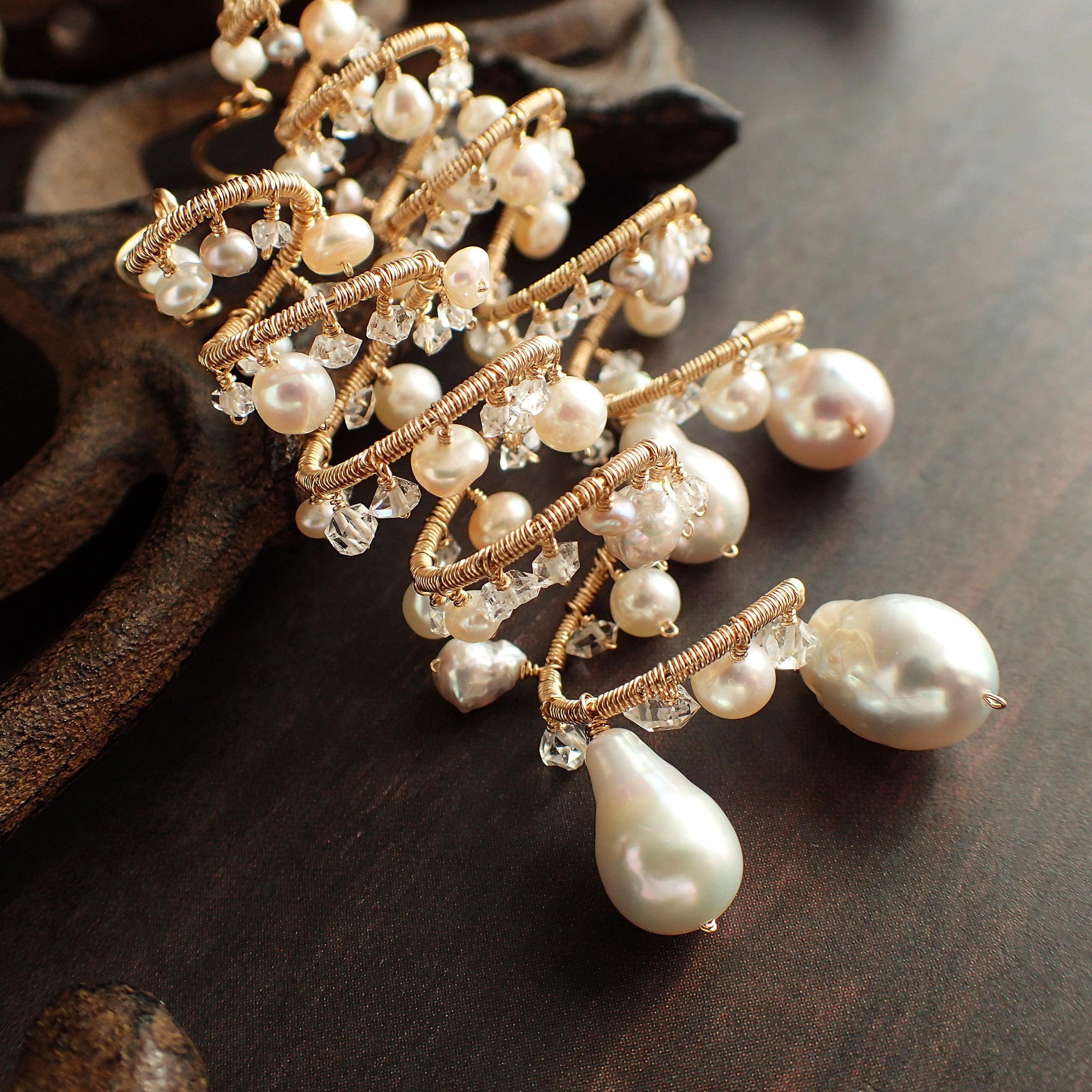 形の異なる大小のあこやバロックパールや淡水パール、ハーキマーダイヤモンドを使用した特別なデザインが特長です。