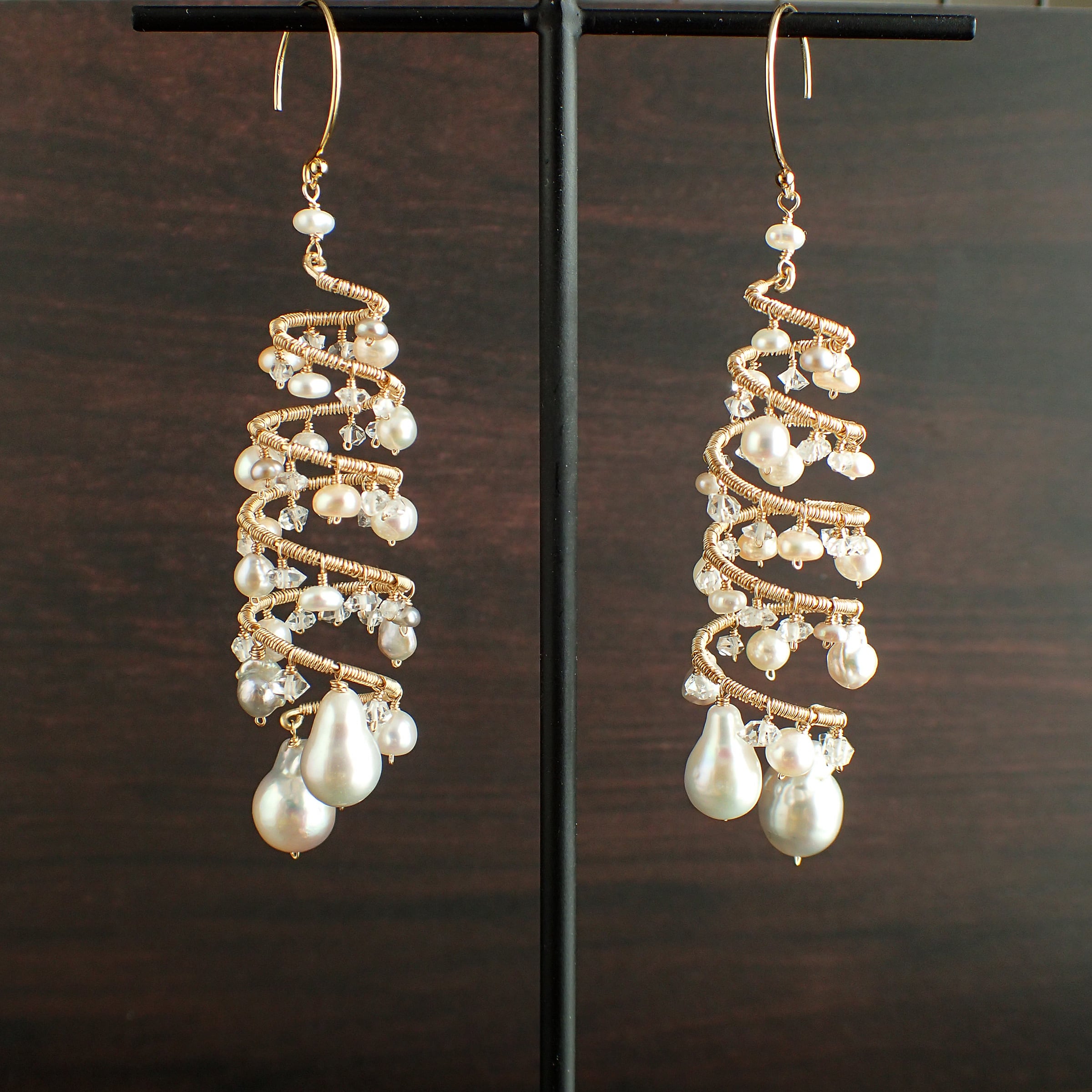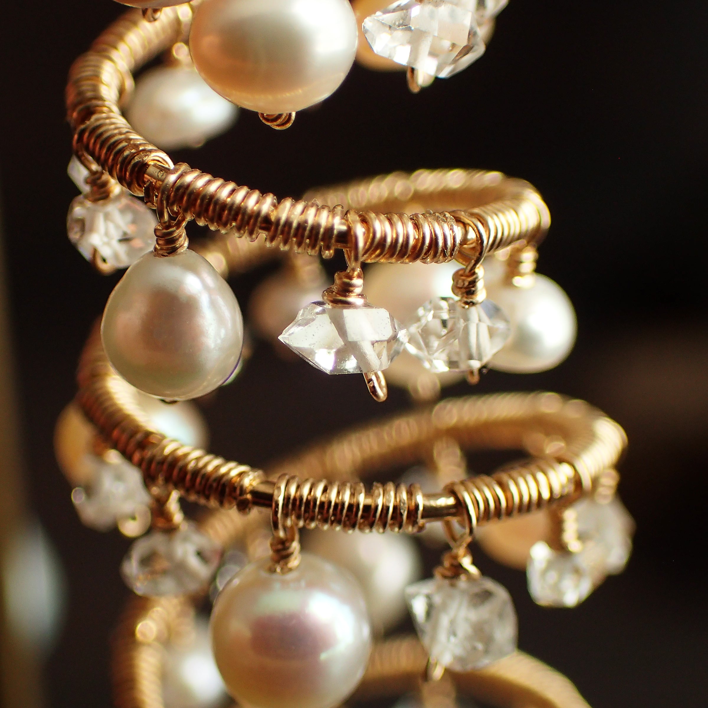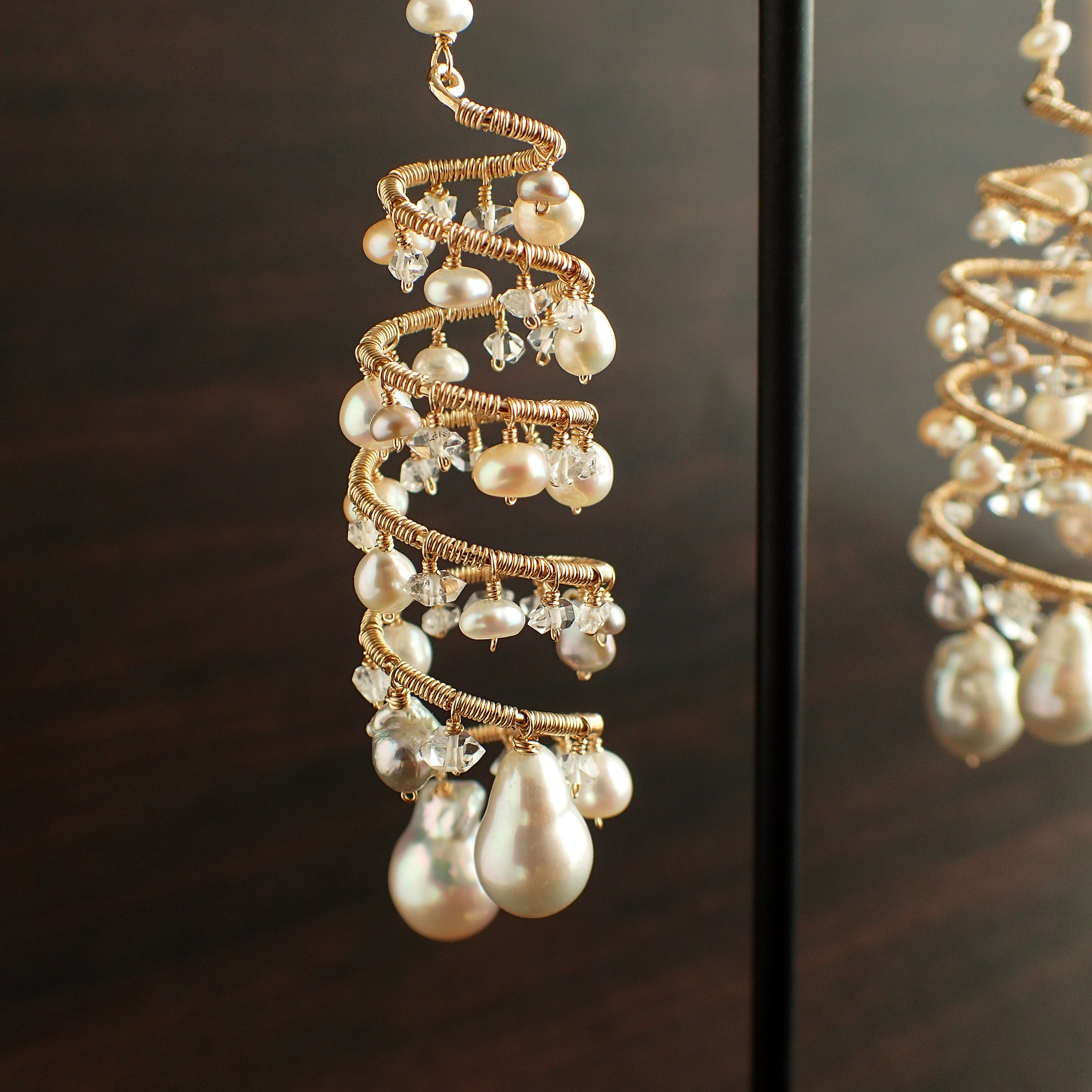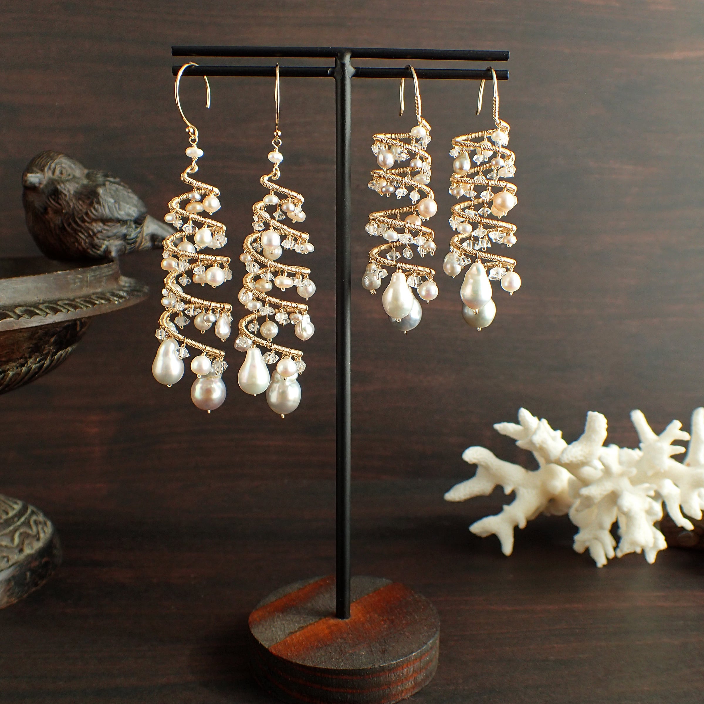 形の異なる大小のあこやバロックパールや淡水パール、ハーキマーダイヤモンドを使用した特別なデザインが特長です。