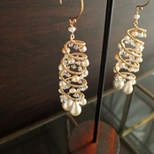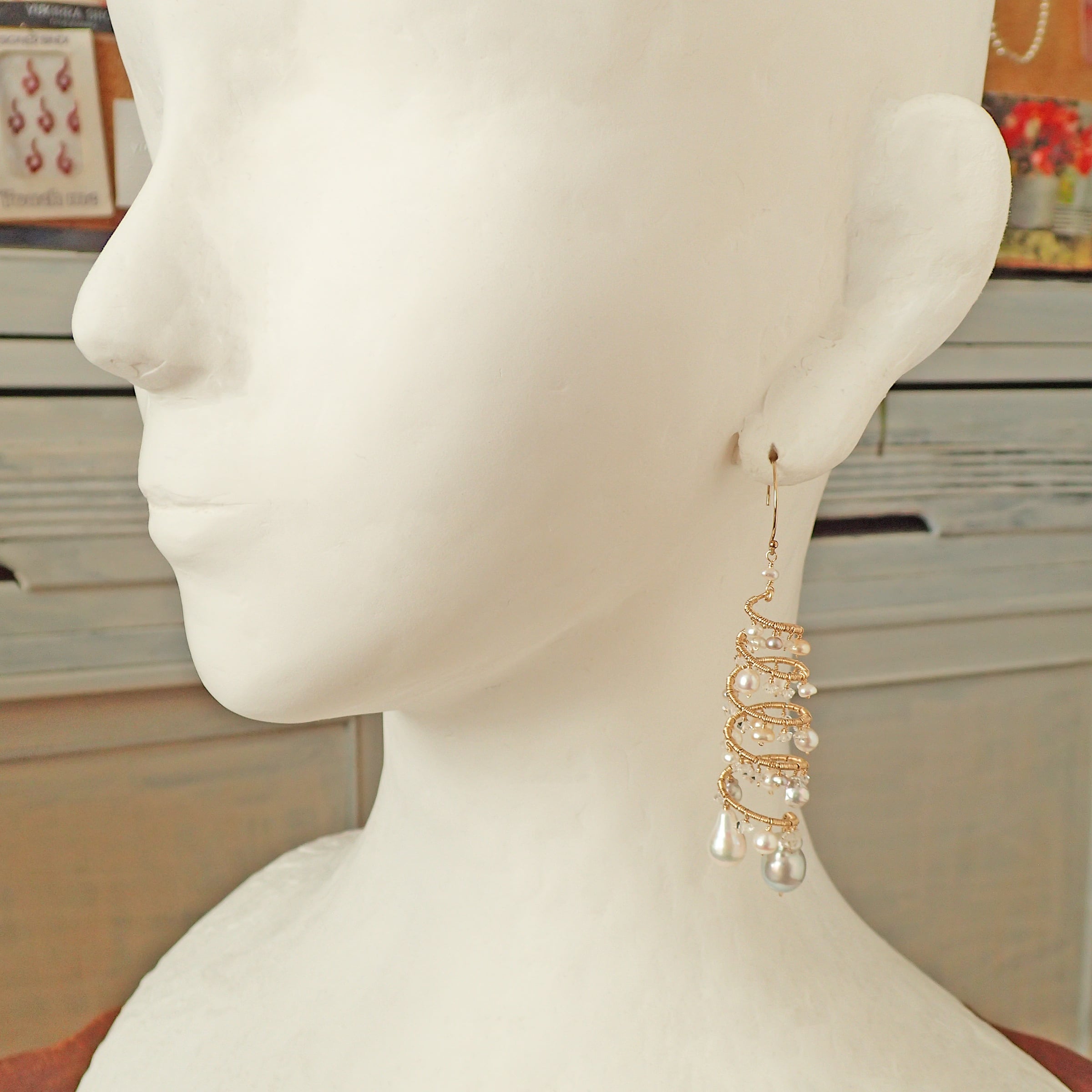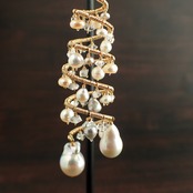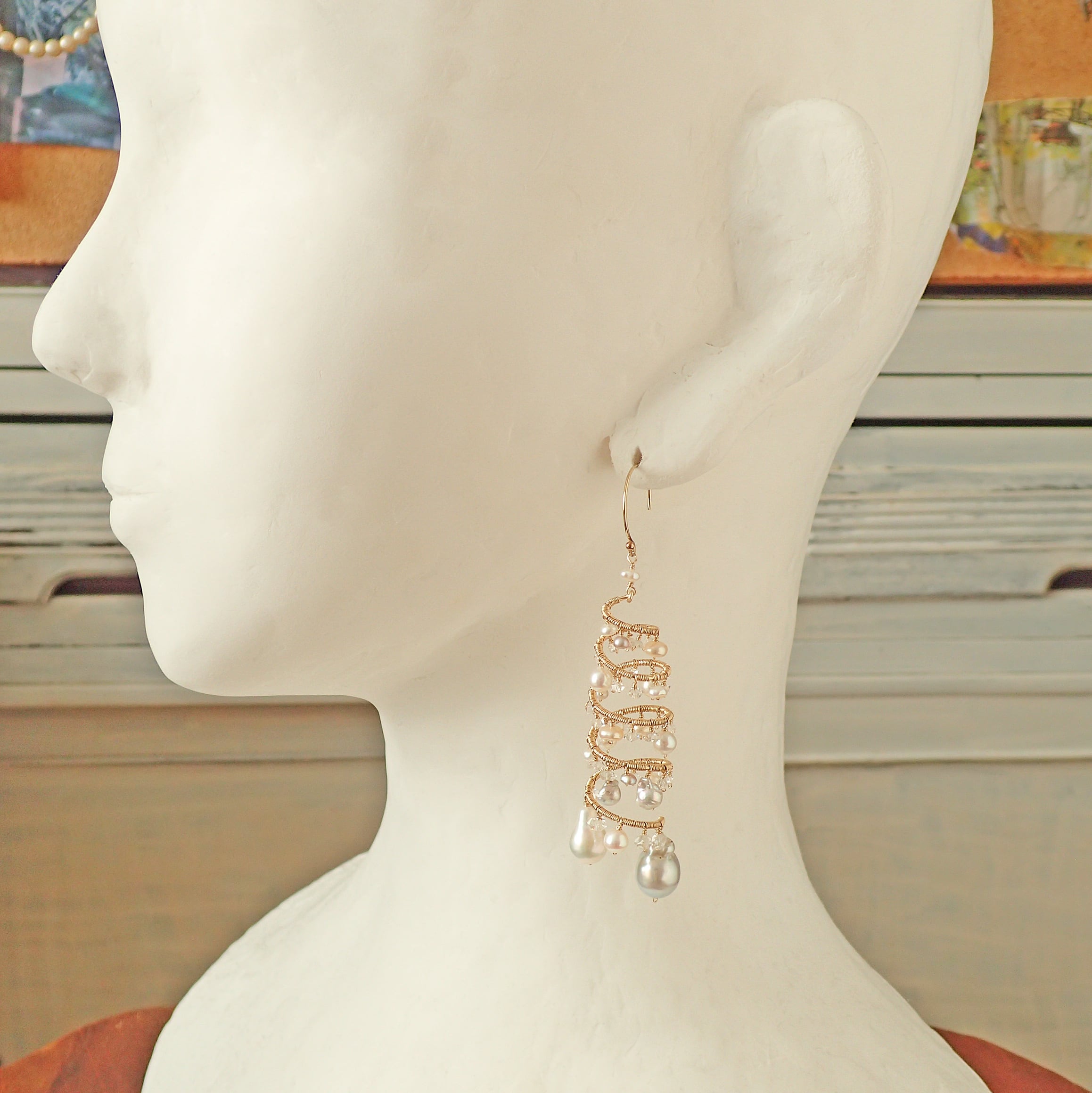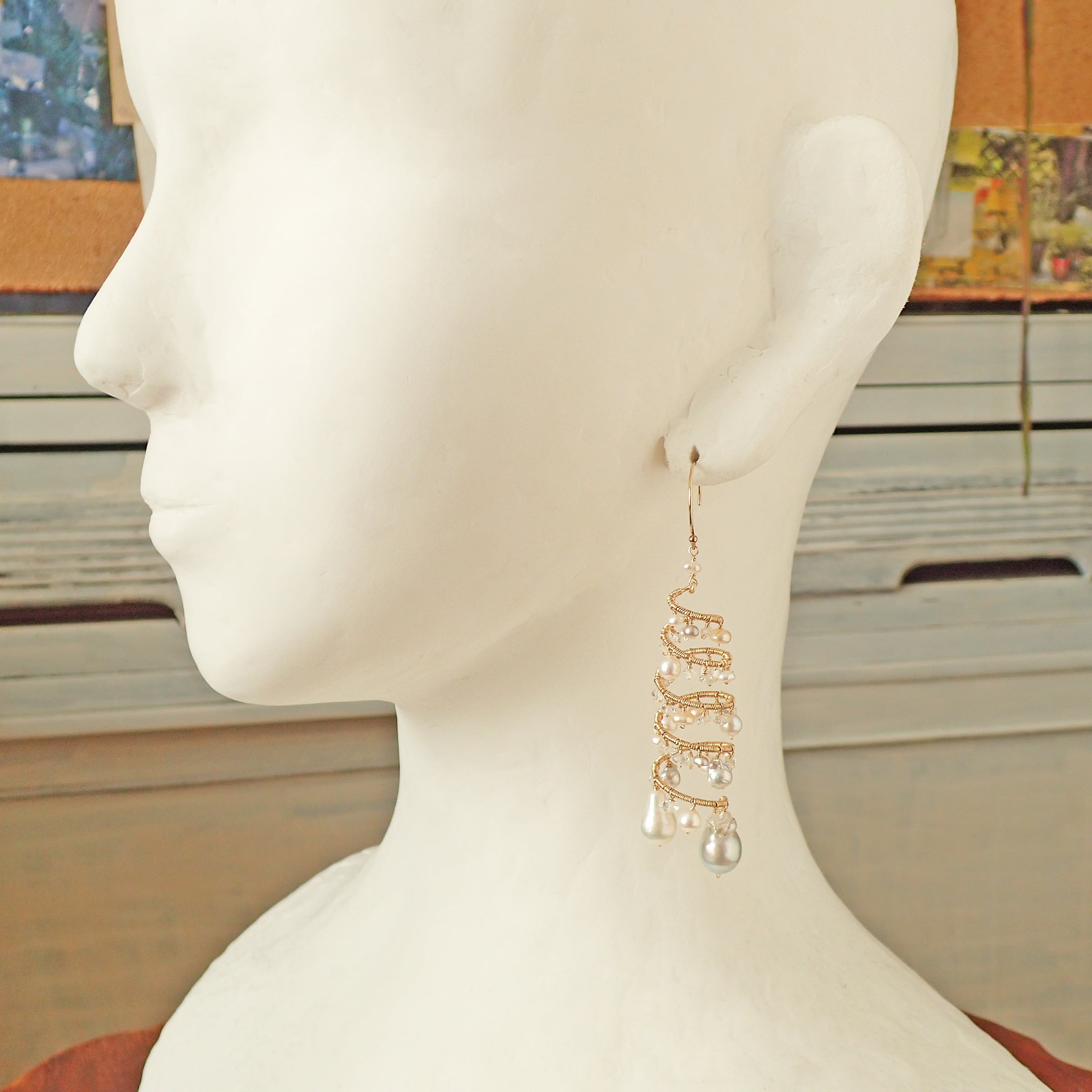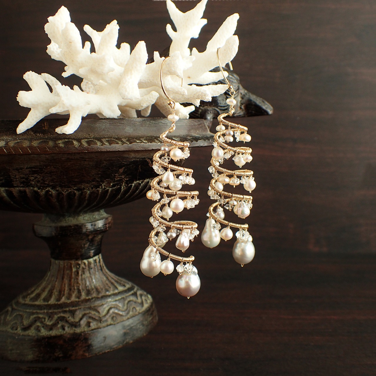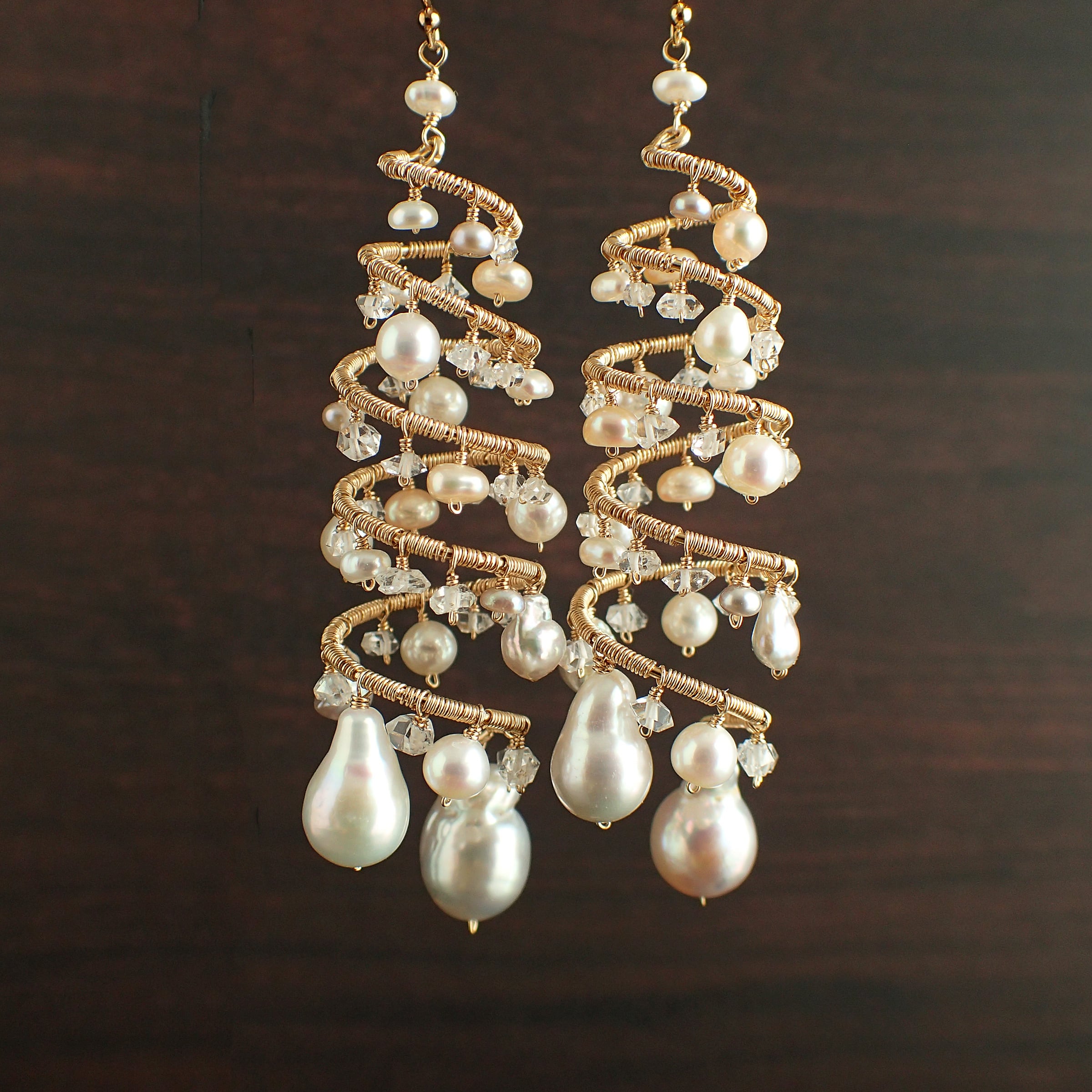 形の異なる大小のあこやバロックパールや淡水パール、ハーキマーダイヤモンドを使用した特別なデザインが特長です。
