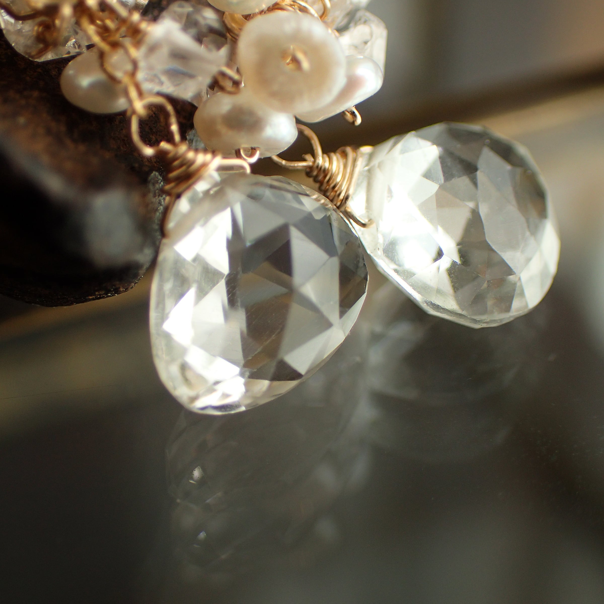 アクアマリンはまるできらめく水面のように、ハーキマーダイヤモンドは小さな氷の粒のような透明感でキラキラと光を反射します。