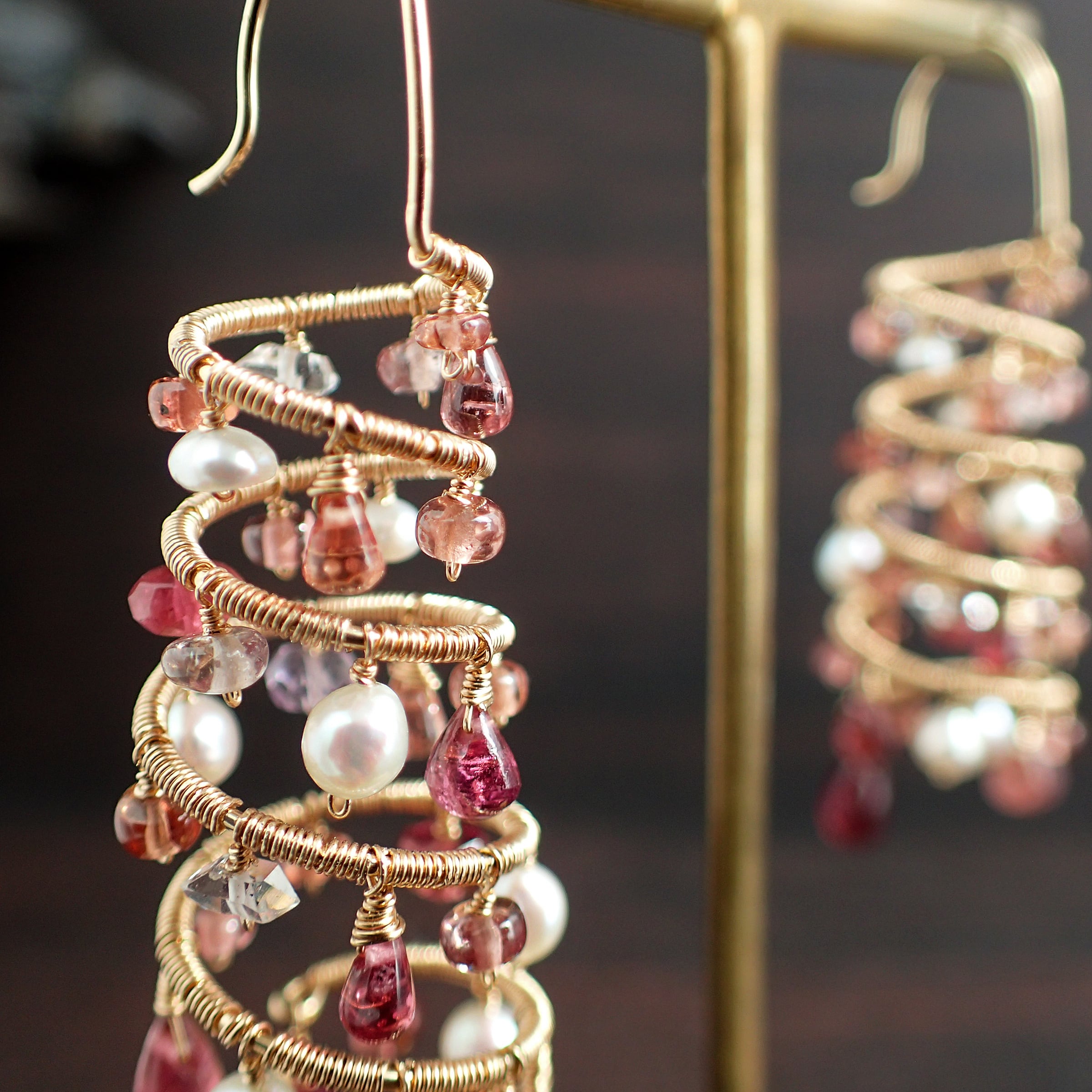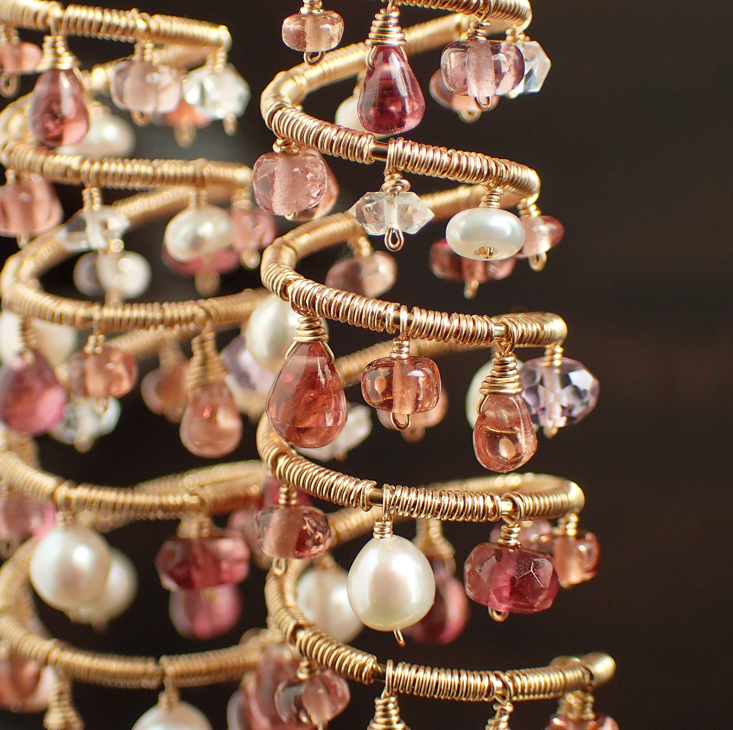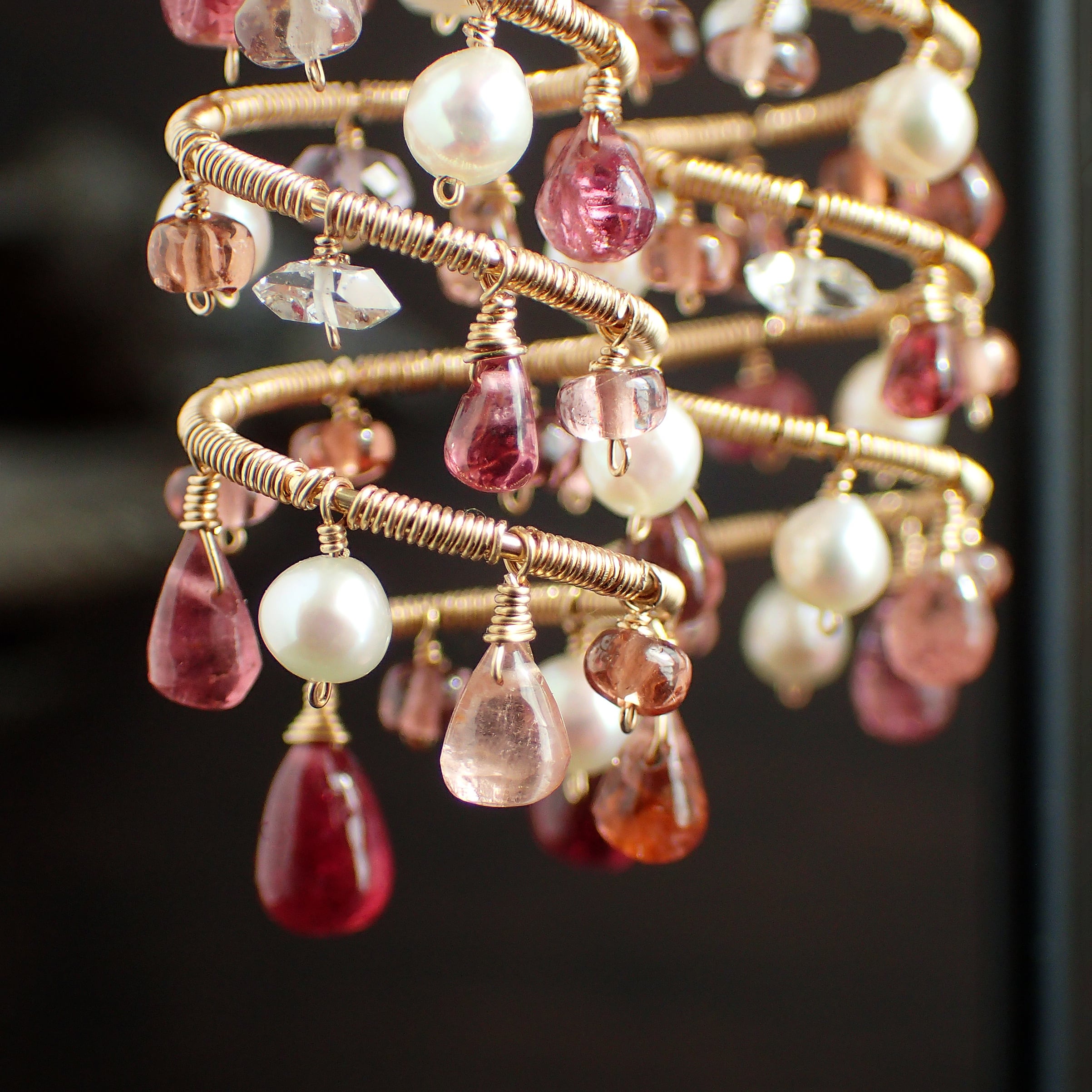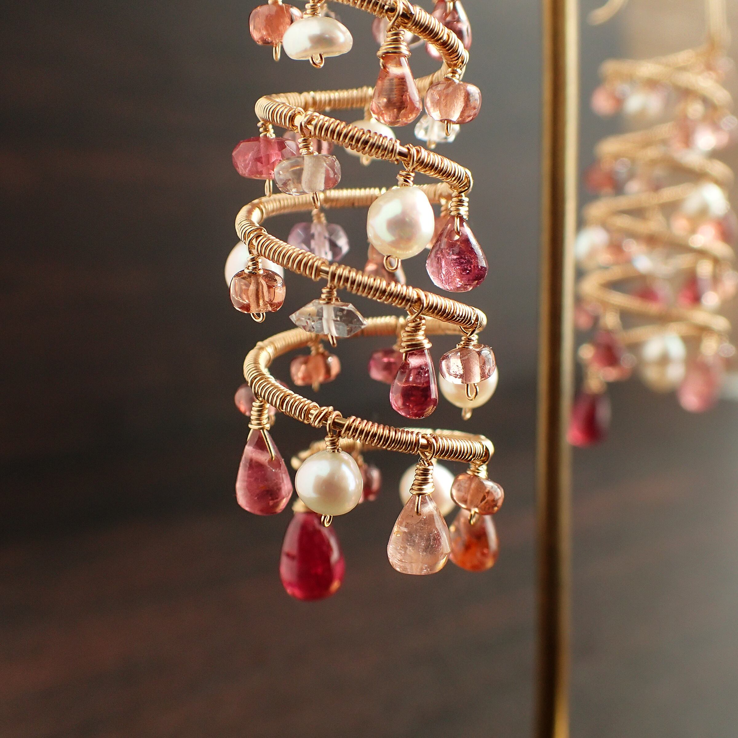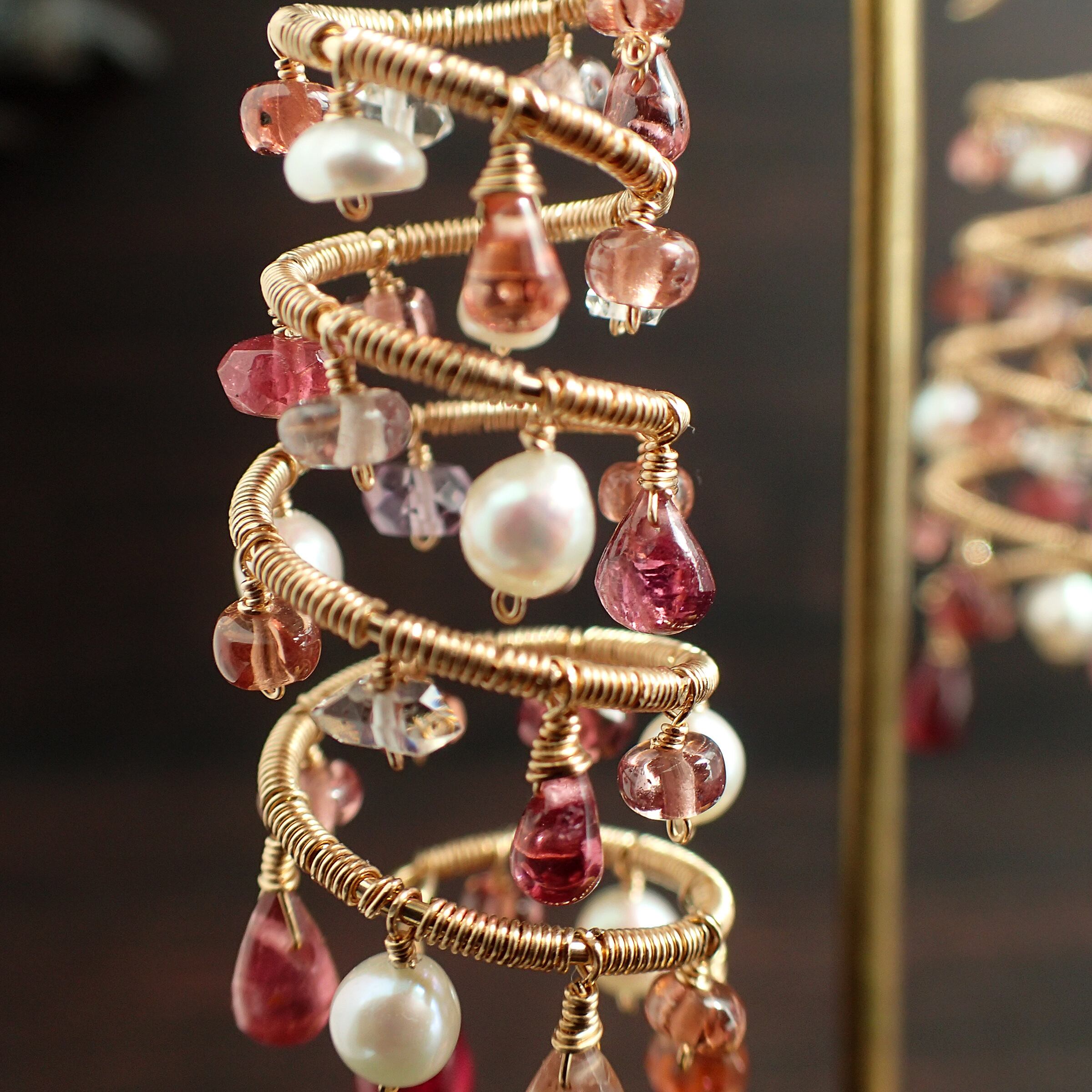 ピンクトルマリン、マラヤガーネットやスピネルのトーンの違う優しいピンクカラーはまるでローズの花びらのような瑞々しい美しさが感じられる繊細なお色で、その間にハーキマーダイヤモンドの煌めきやベビーパールの暖かみのある艶が差し込みます。