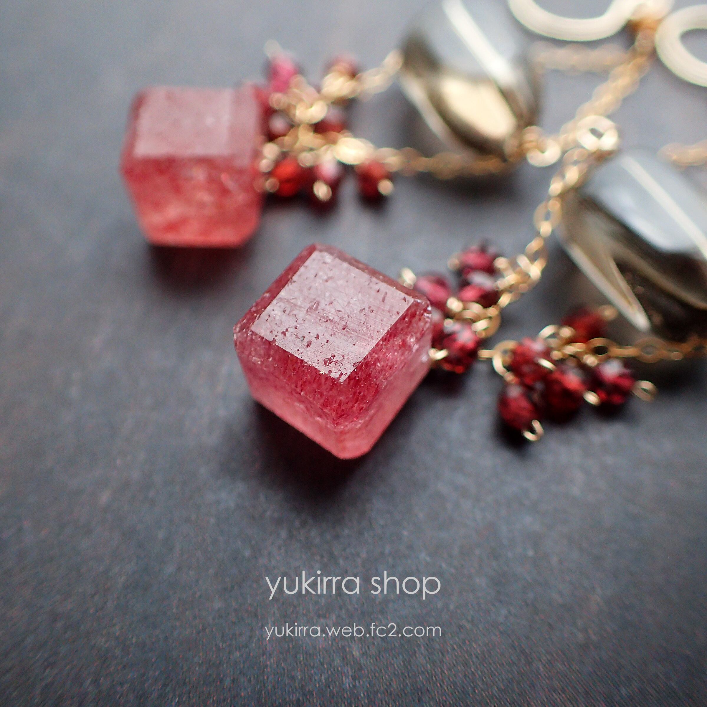 サイコロ型のストロベリークウォーツはシックな色合いで、ガーネットとの組み合わせが華やかさを引き立てます。