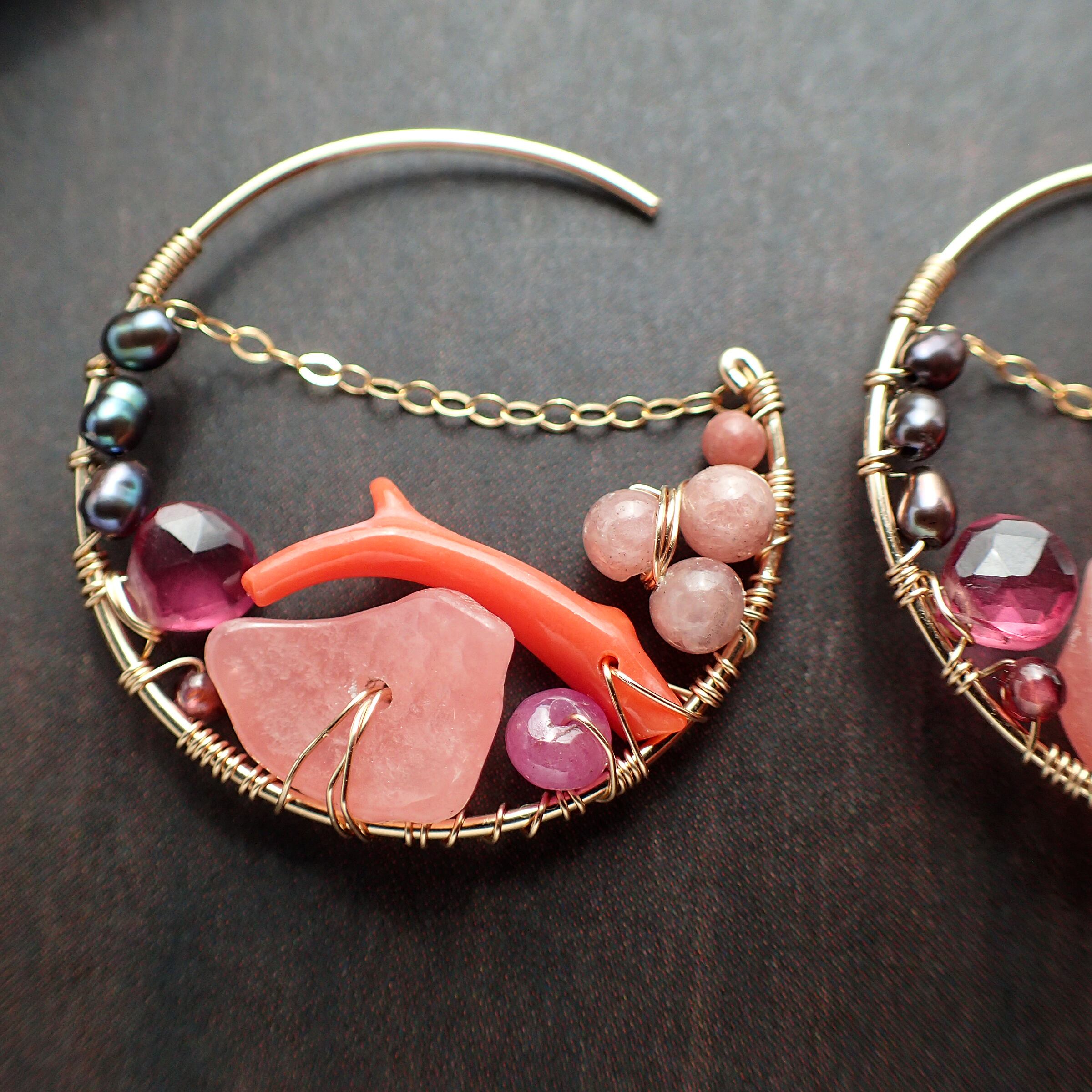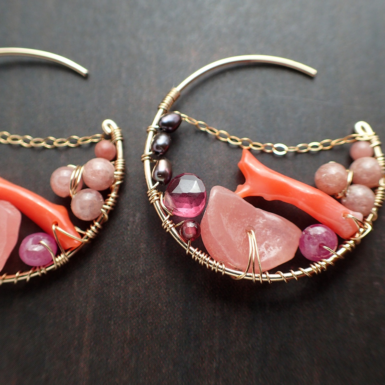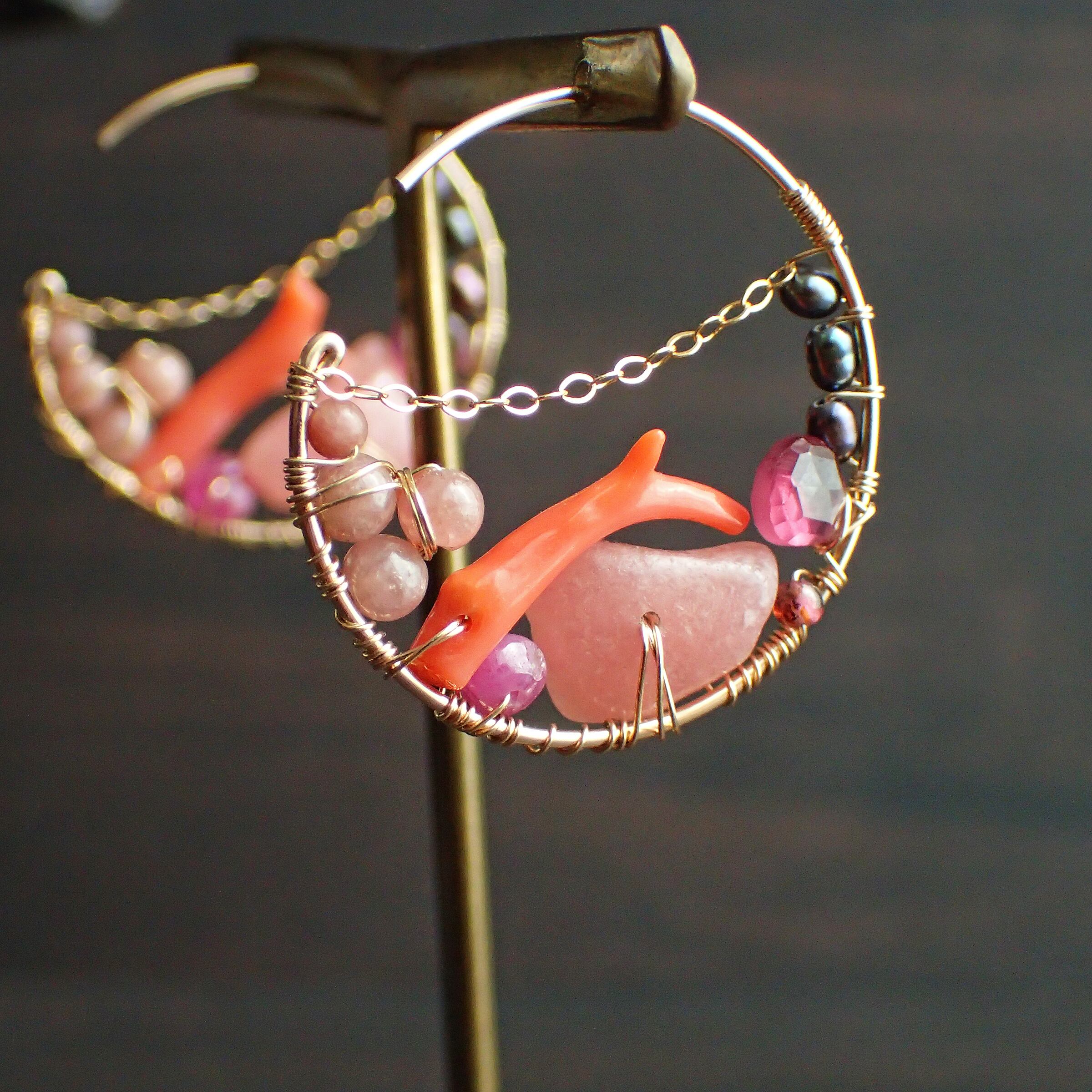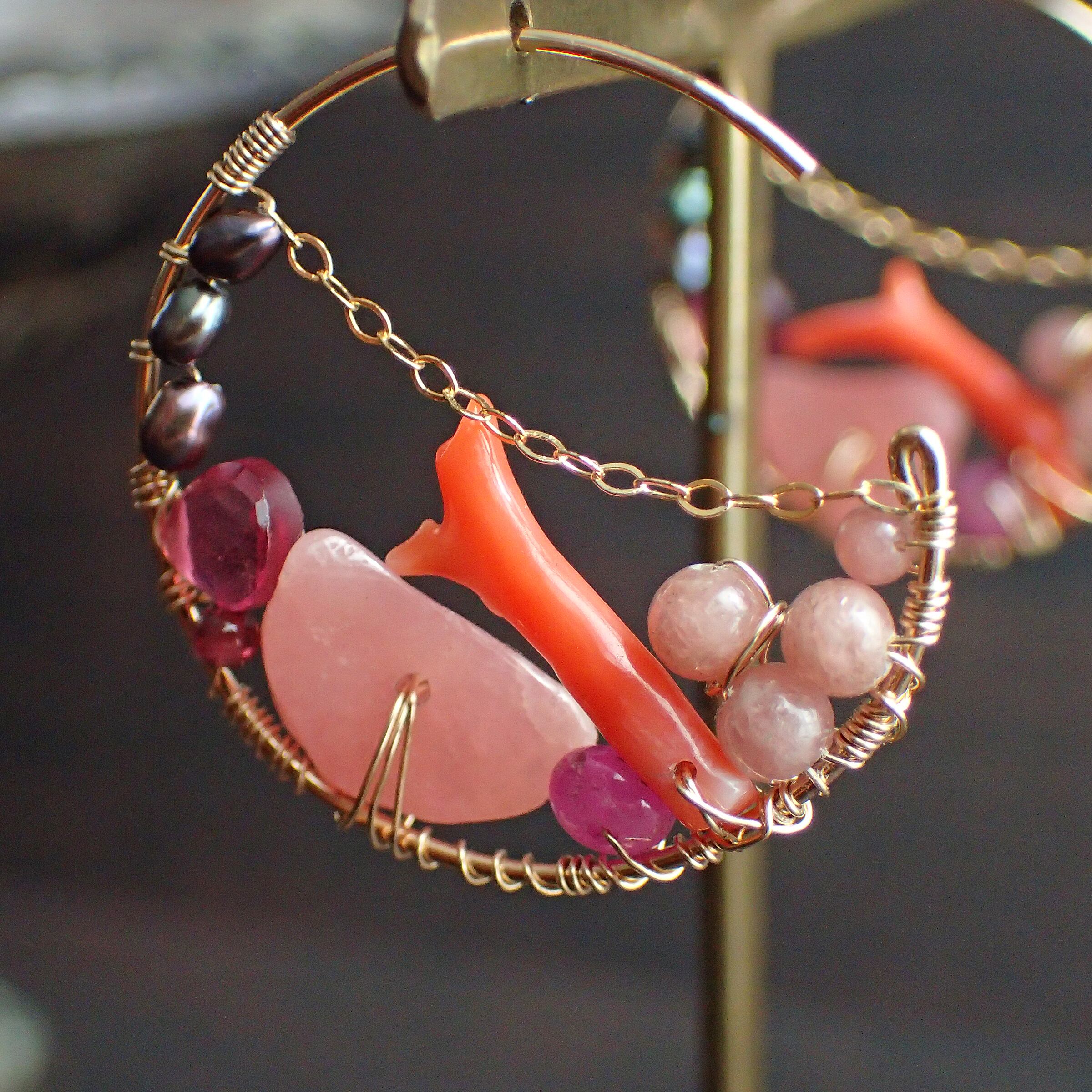 この美しいインカローズと艶やかな枝珊瑚を使用したフープピアスは、耳元に特別な華やかさを添えるアイテムです。