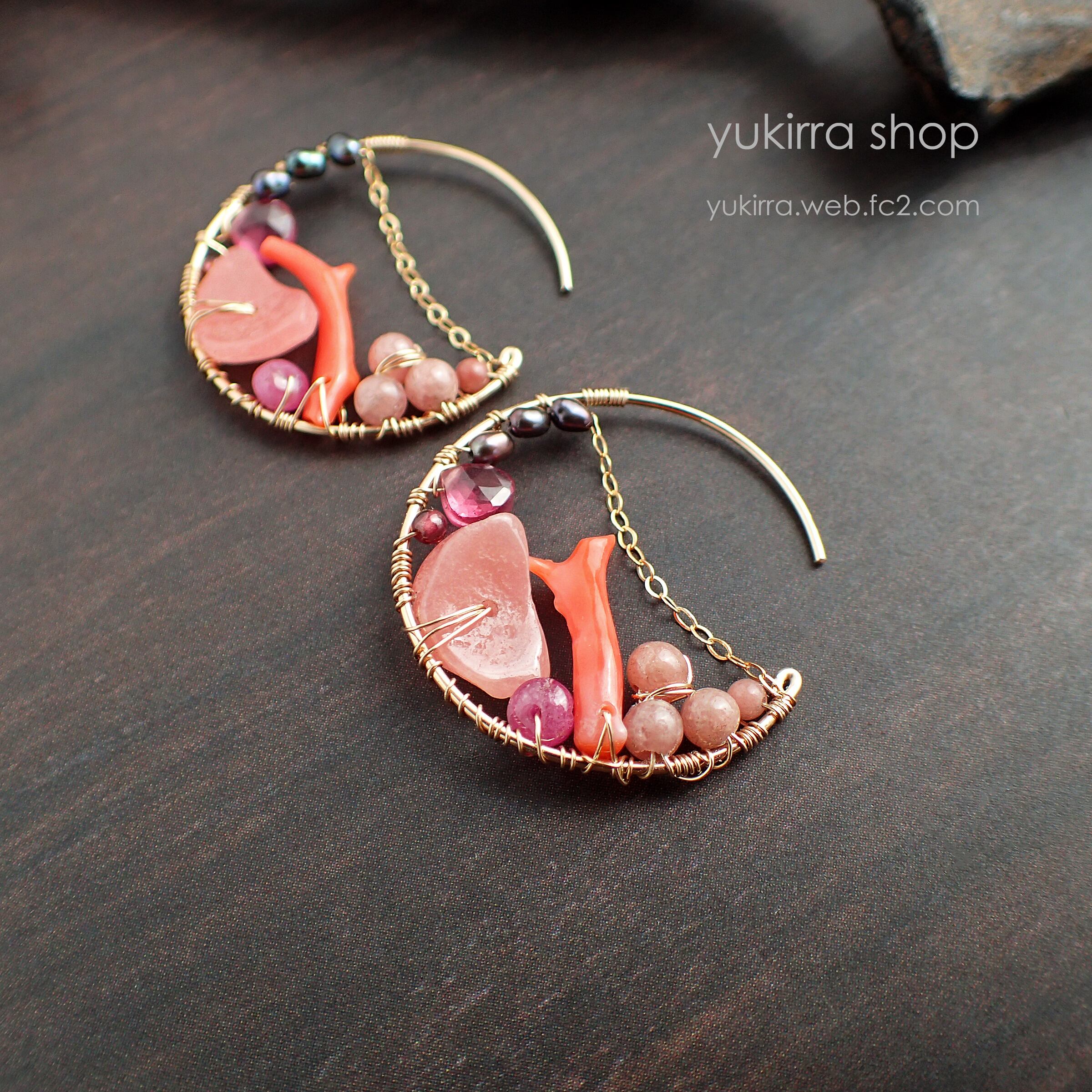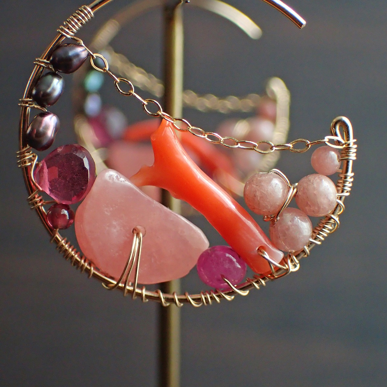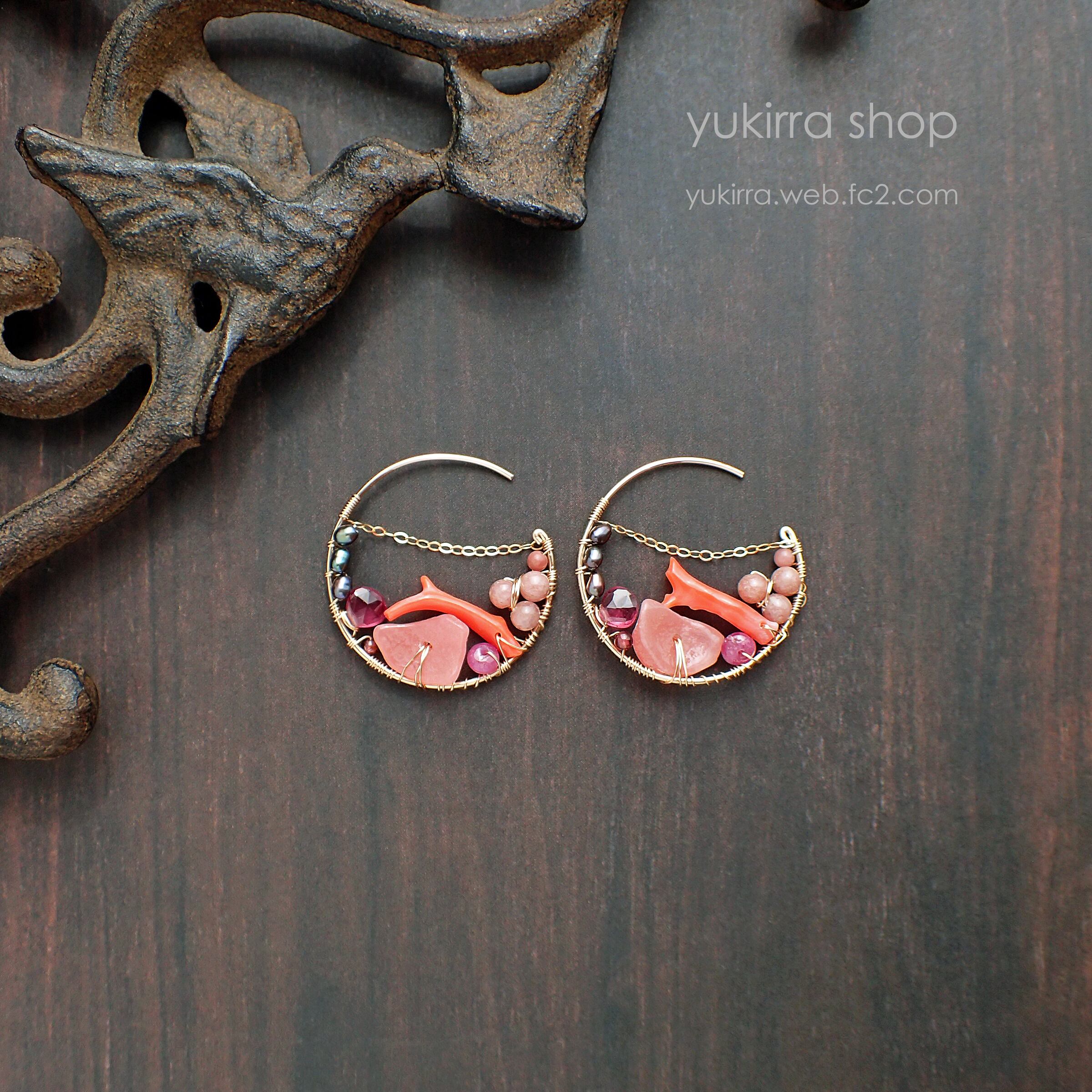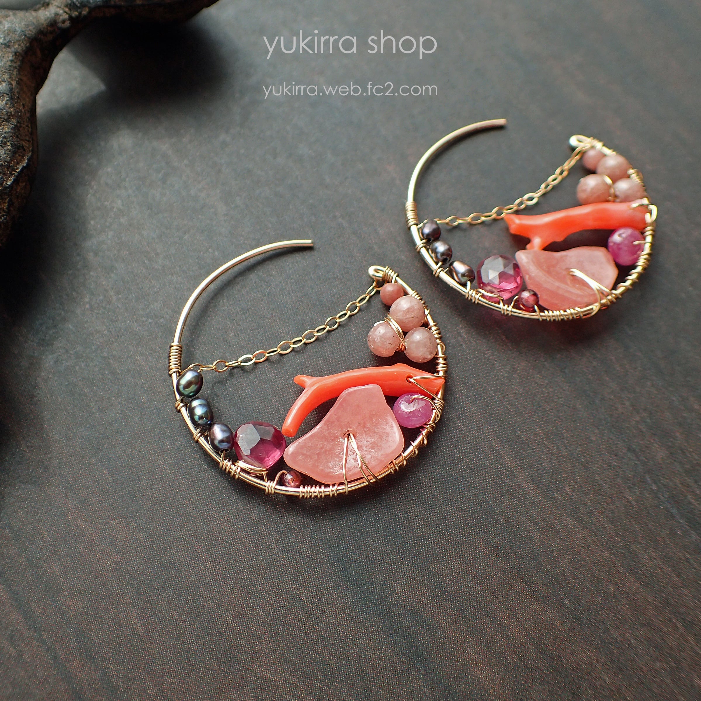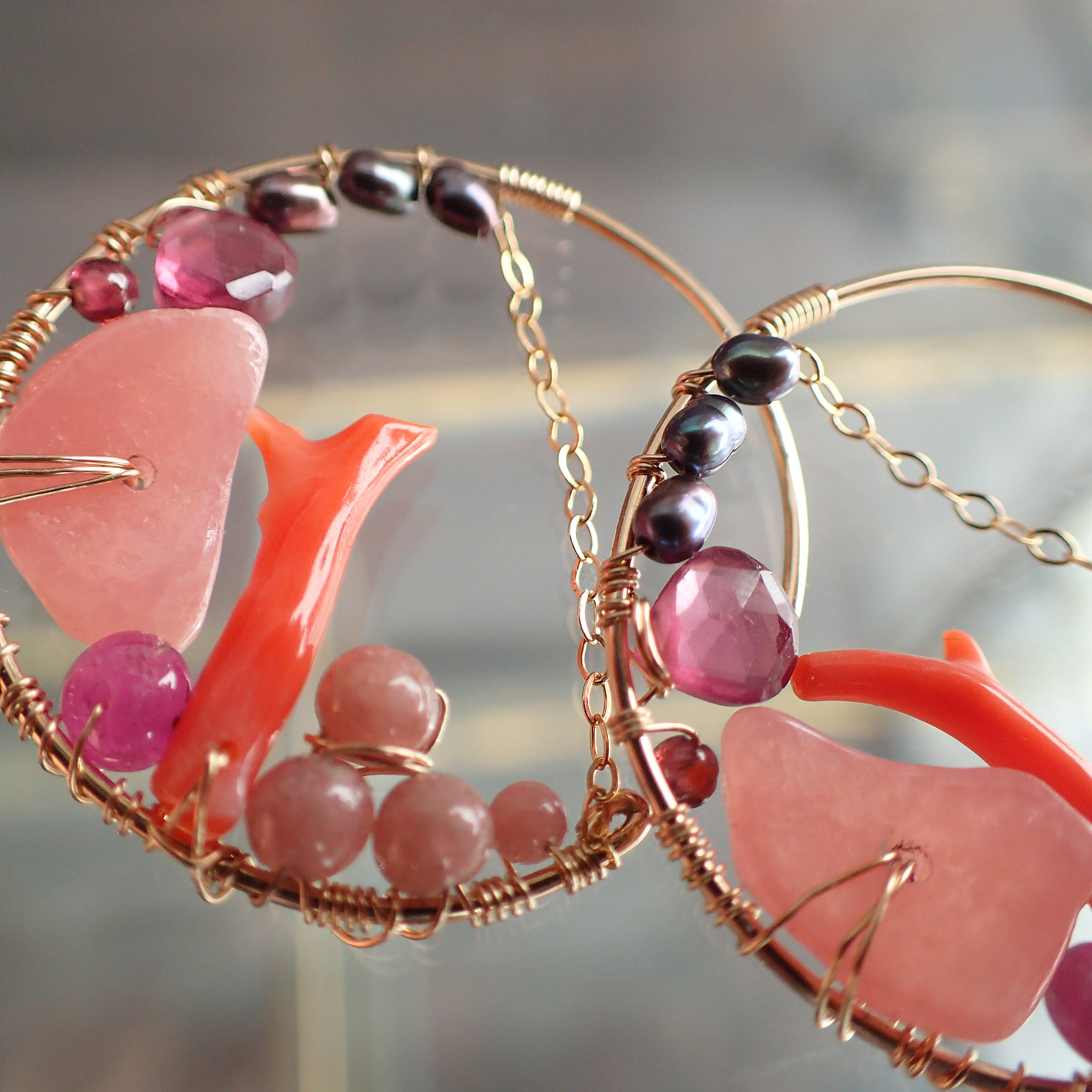 この美しいインカローズと艶やかな枝珊瑚を使用したフープピアスは、耳元に特別な華やかさを添えるアイテムです。