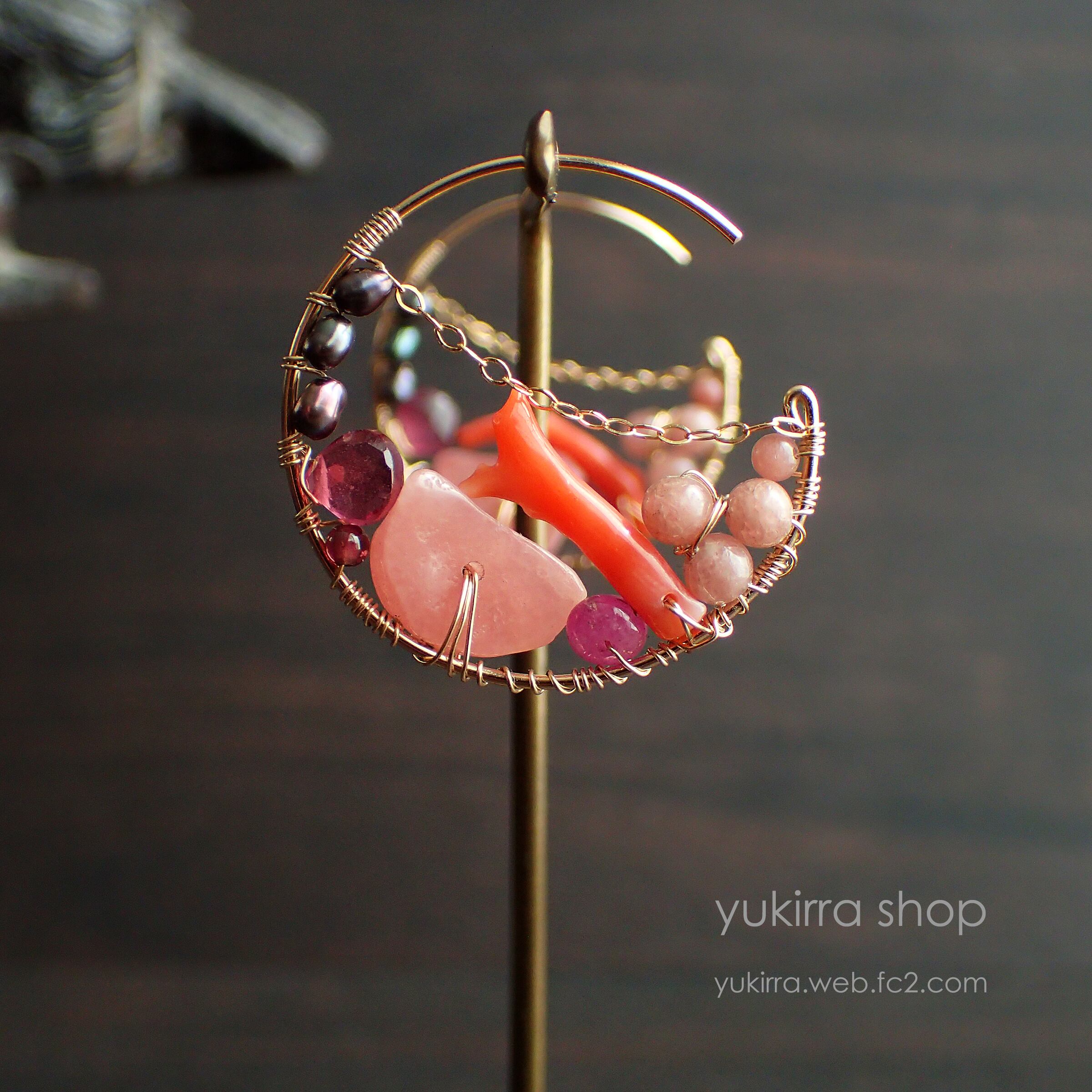 花びらのようなインカローズの柔らかなピンクと、深みのあるコーラルピンクの枝珊瑚、そして一粒のルビーの煌めきが絶妙に組み合わさり、美しい個性的なデザインが特徴です。