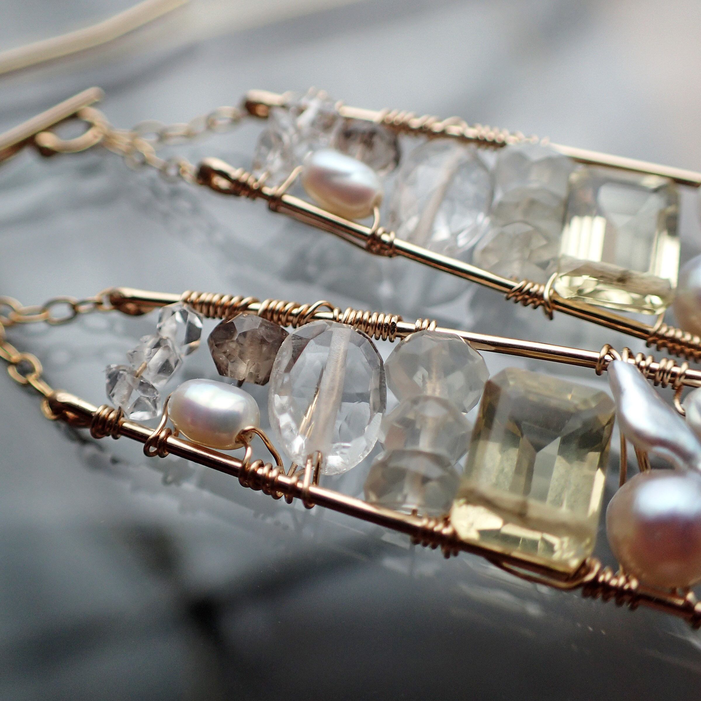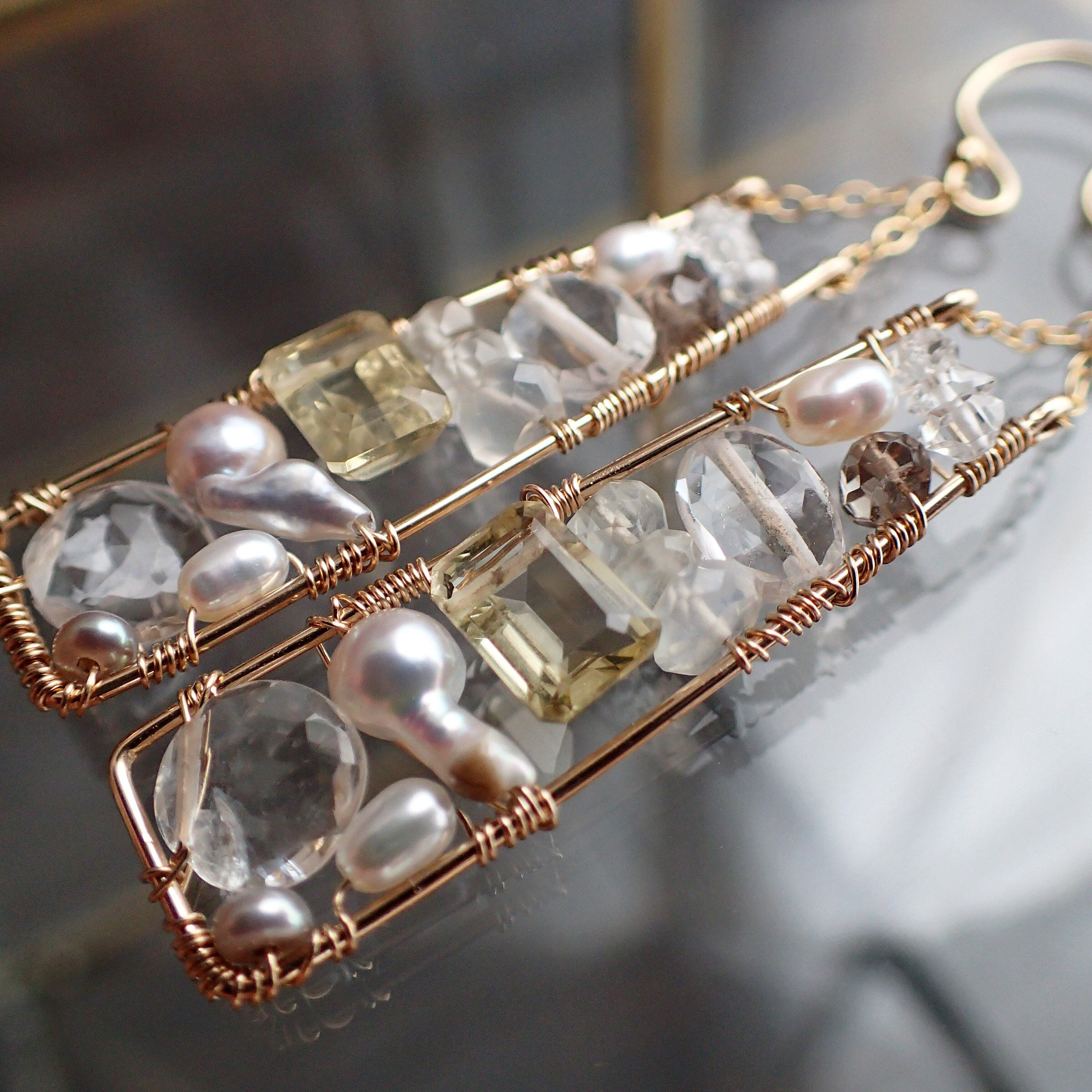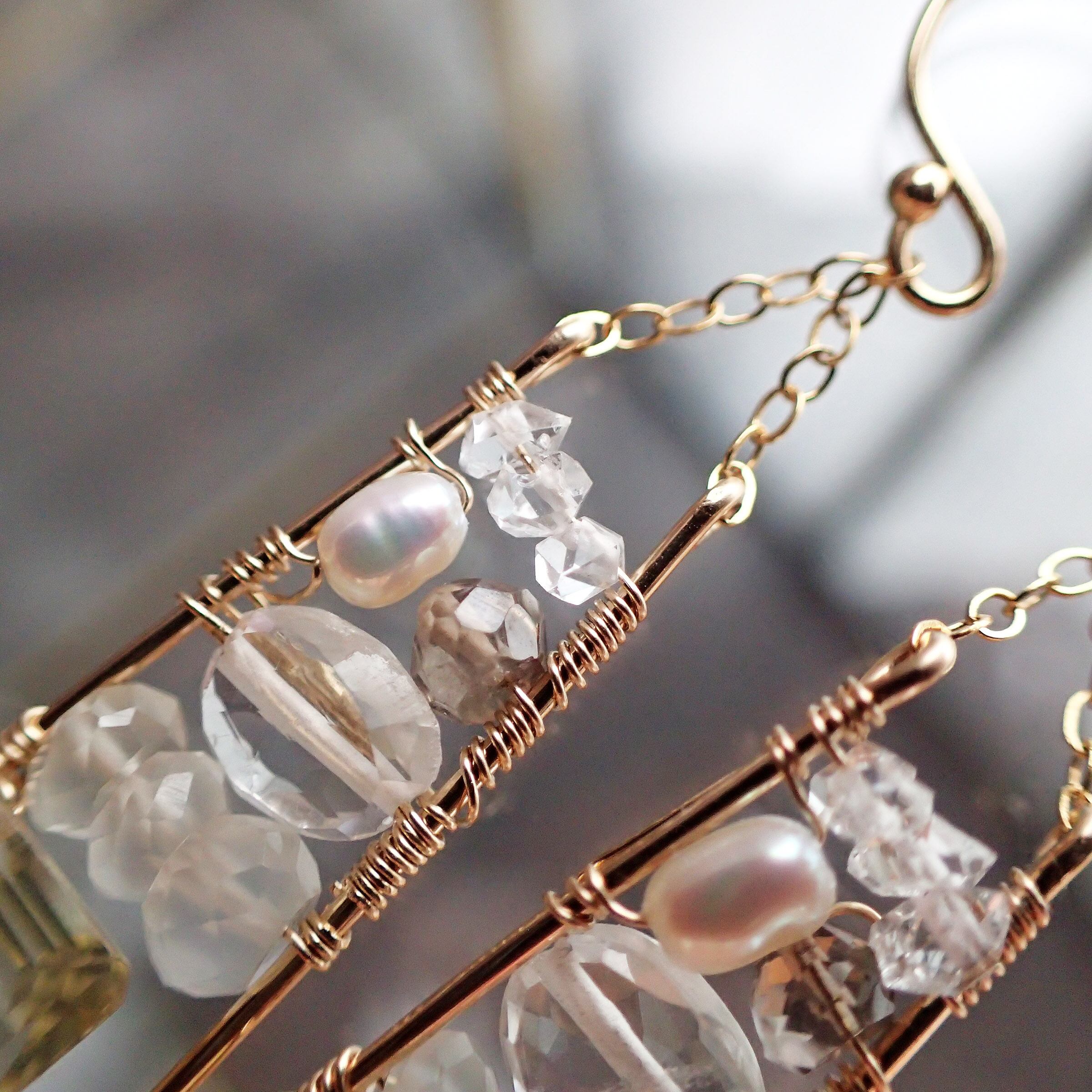 スクエアーカットのレモンクウォーツがキラキラと輝き、小さなハーキマーダイヤモンドとシルバーカラーのあこやバロックパールが絶妙に組み合わさり、まるで宝石をたっぷり注いだボトルのような個性的なデザインが魅力を醸し出します。