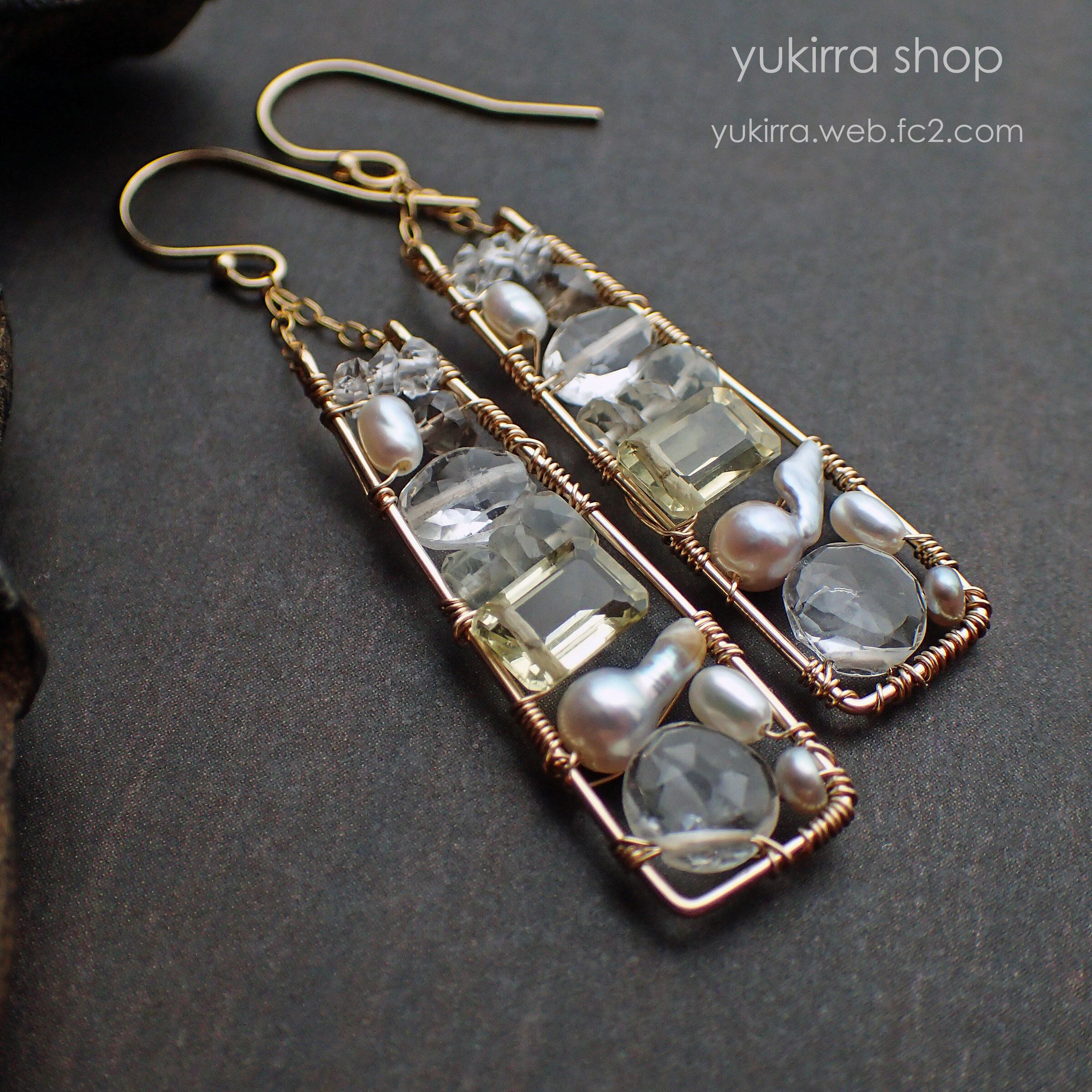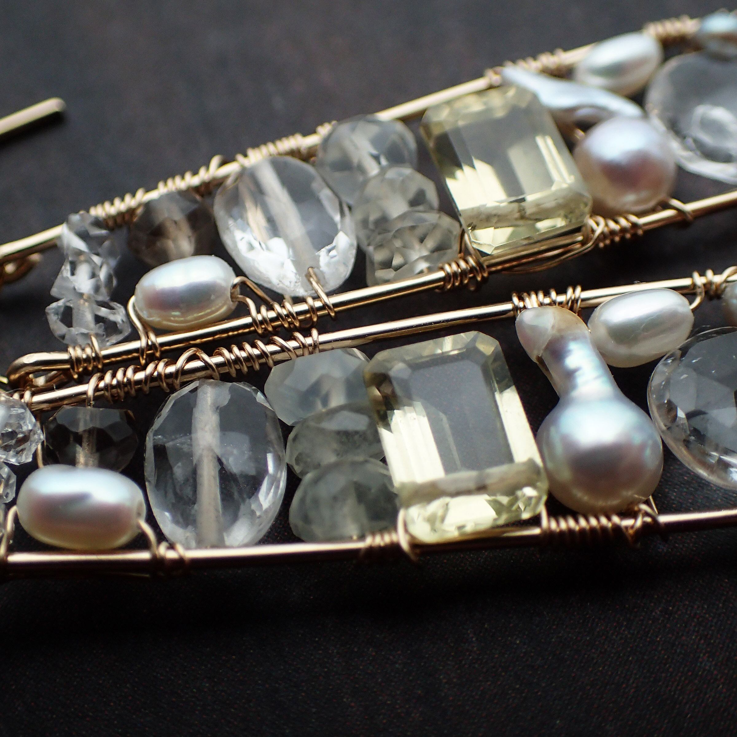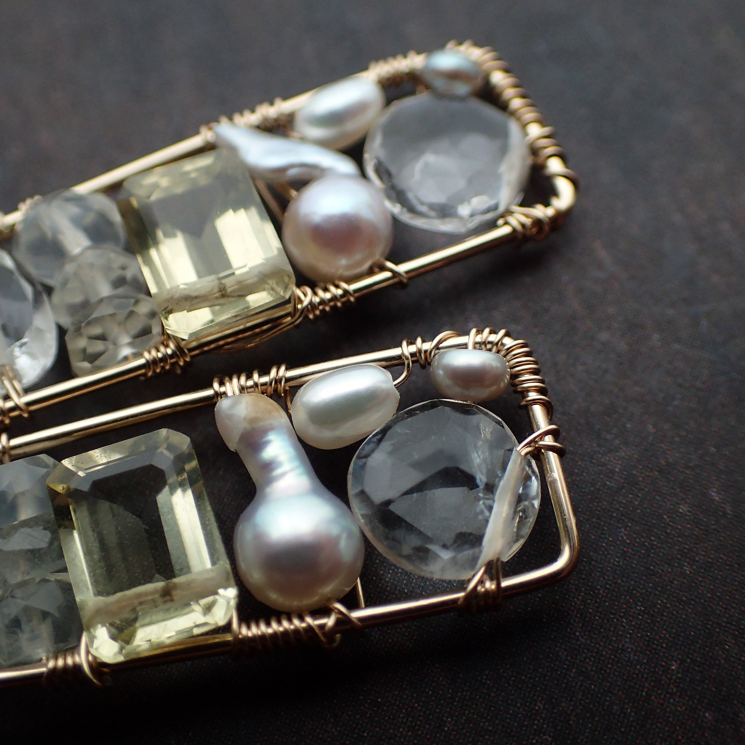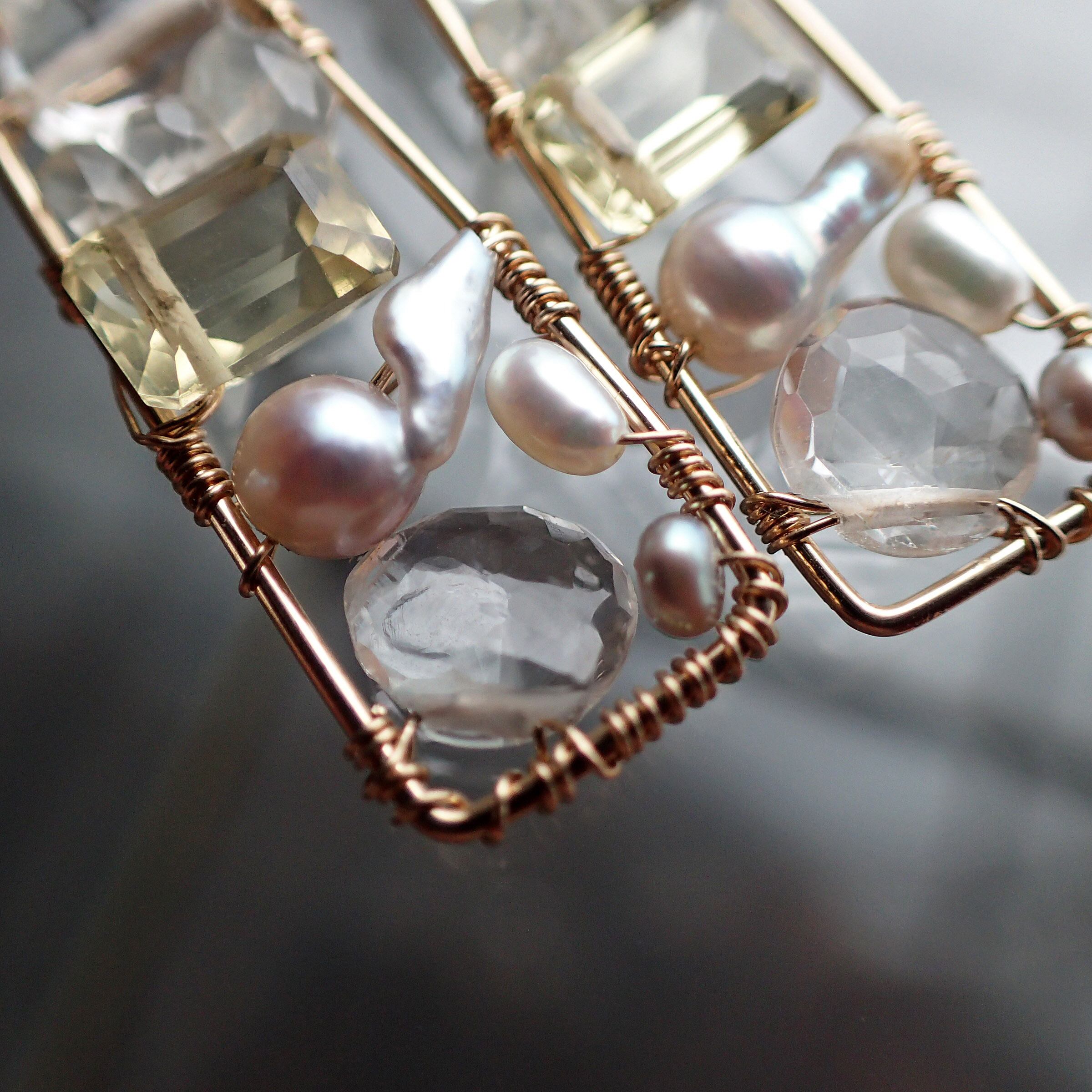 スクエアーカットのレモンクウォーツがキラキラと輝き、小さなハーキマーダイヤモンドとシルバーカラーのあこやバロックパールが絶妙に組み合わさり、まるで宝石をたっぷり注いだボトルのような個性的なデザインが魅力を醸し出します。