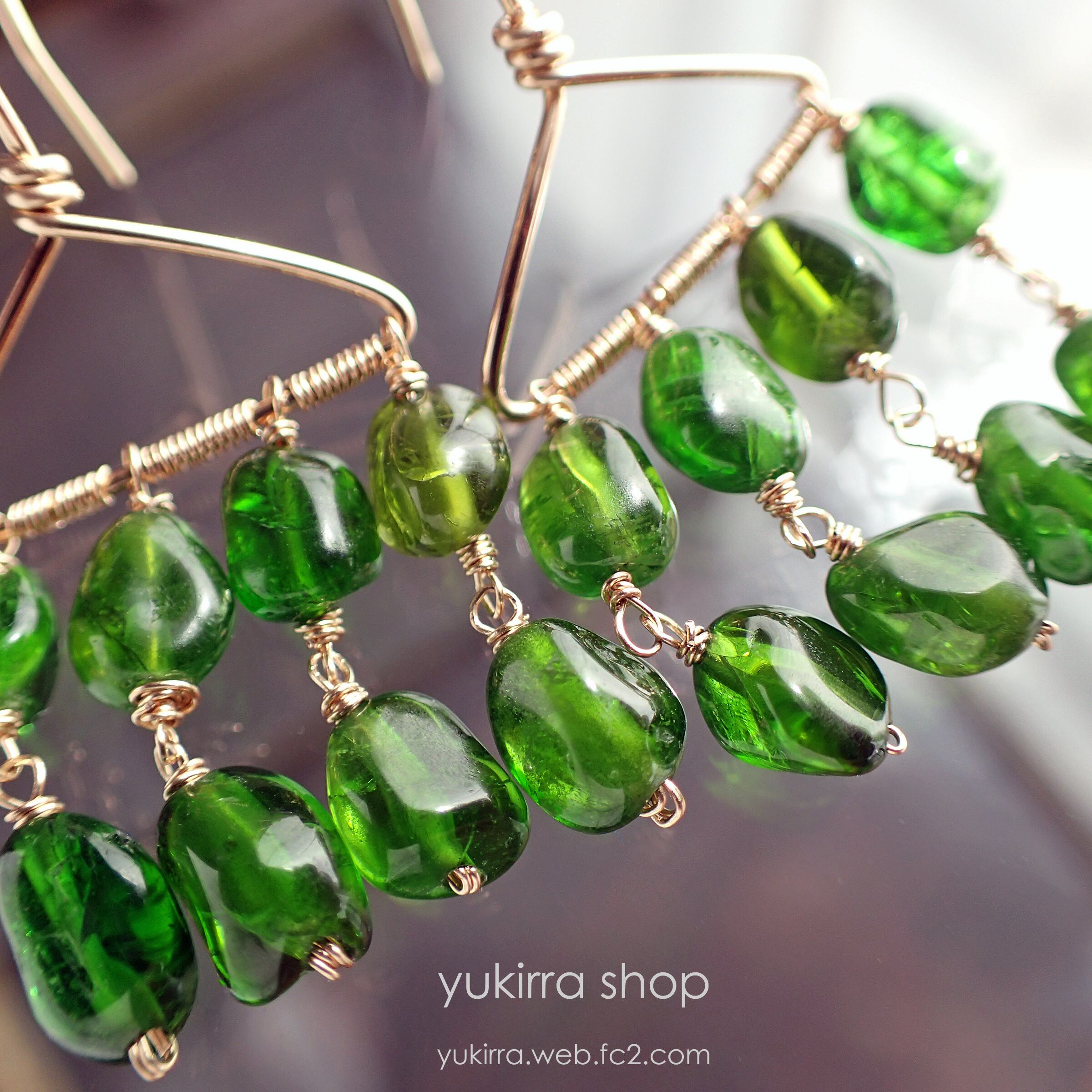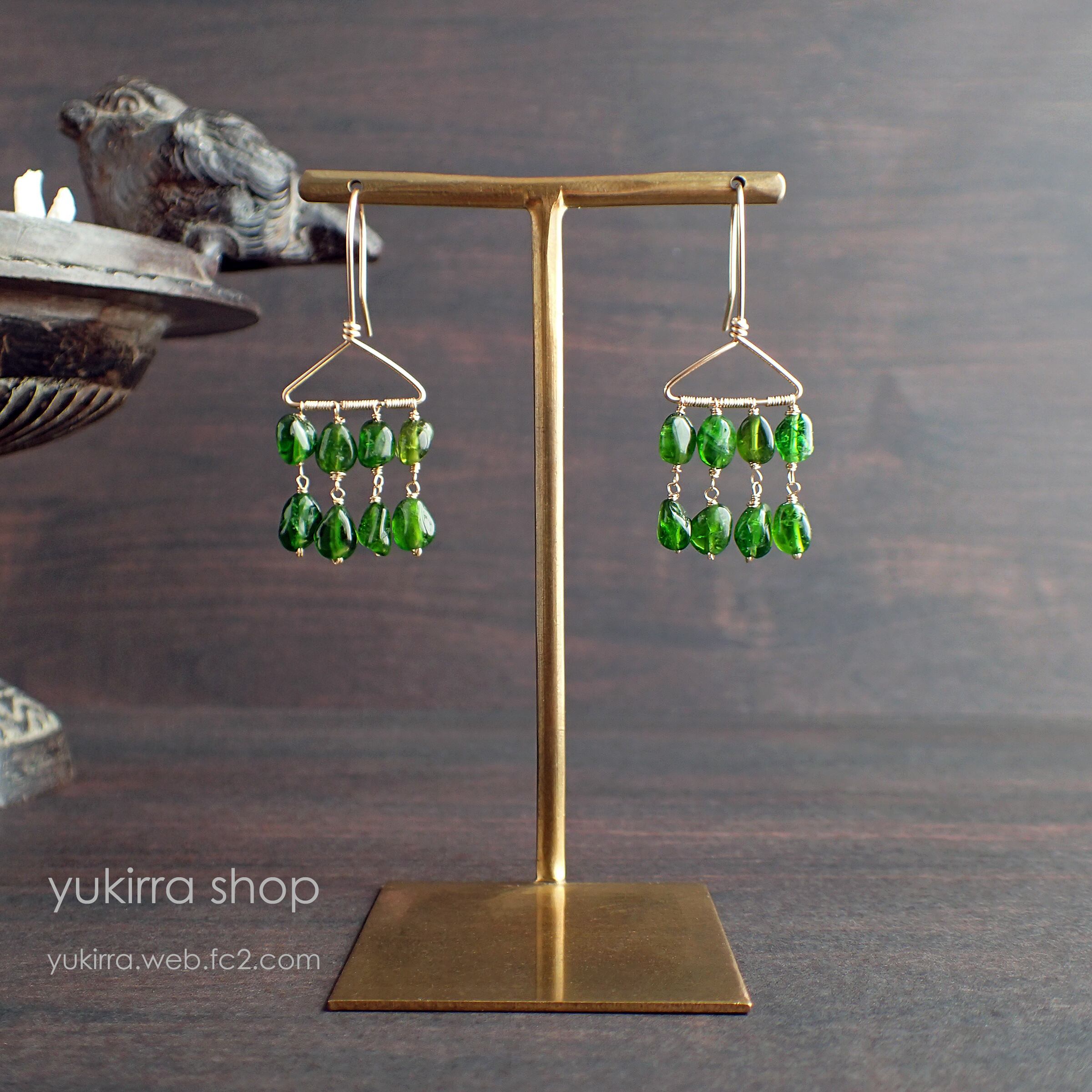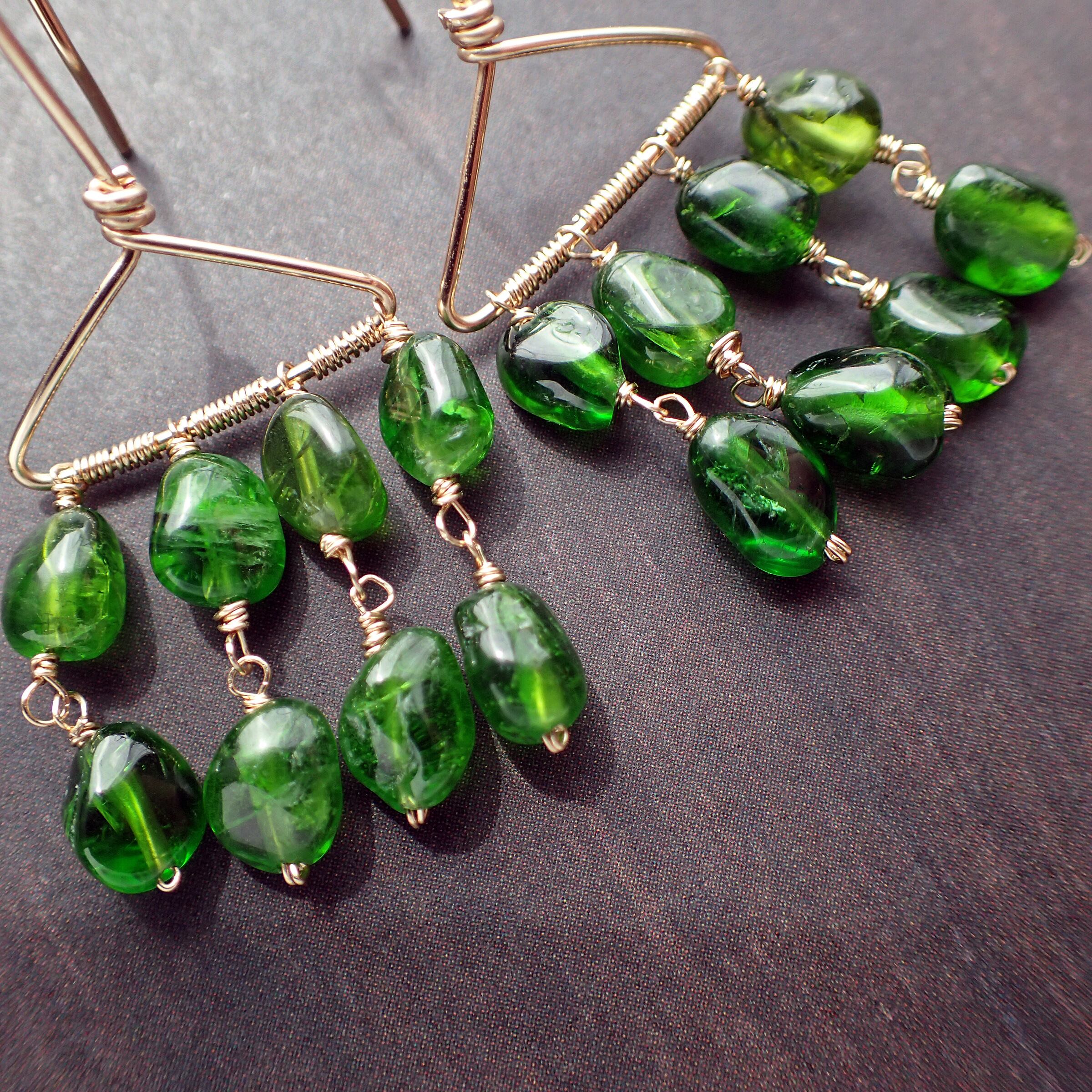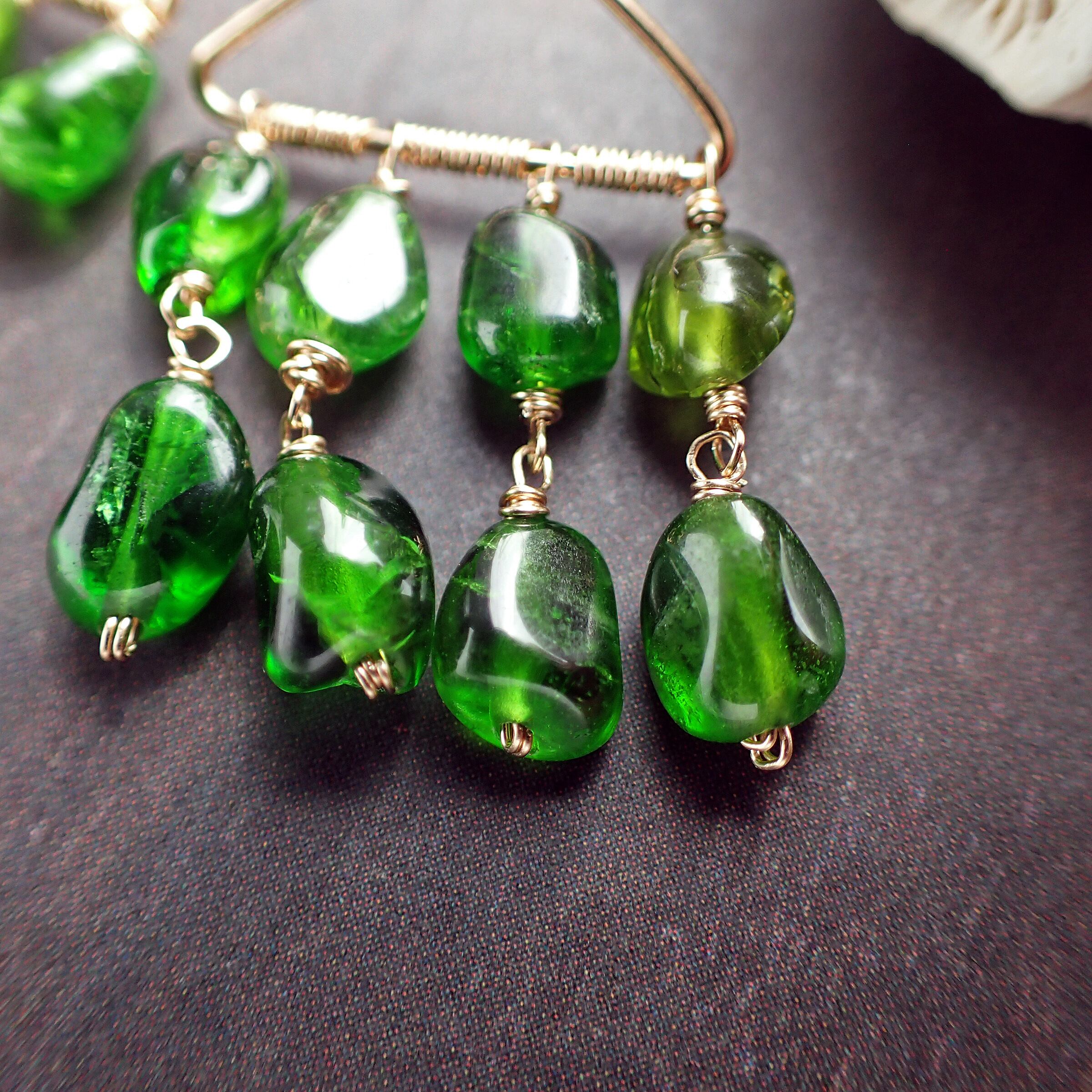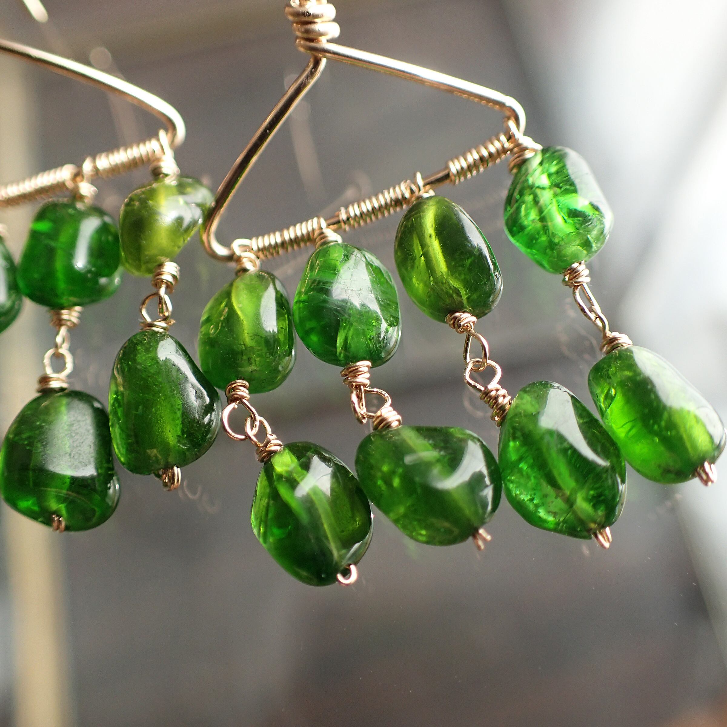 この美しいシャンデリアピアスは、艶やかでランダムなカットが施されたクロムダイオプサイトを使用した、特別なデザインのアイテムです。