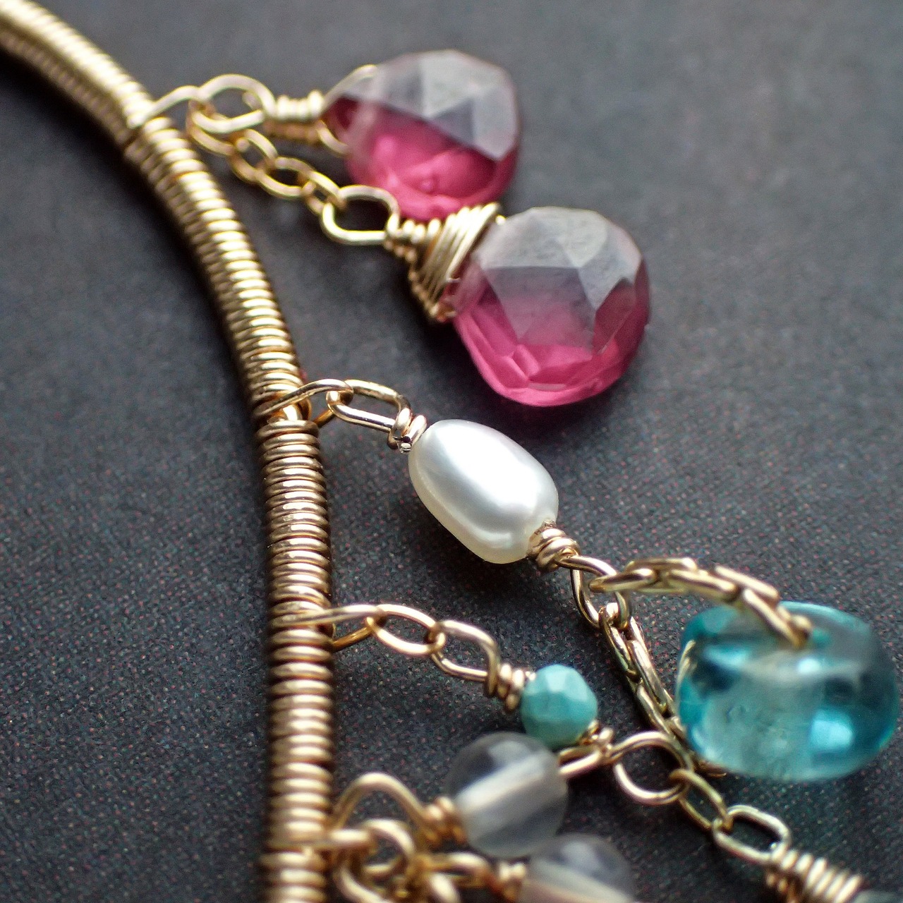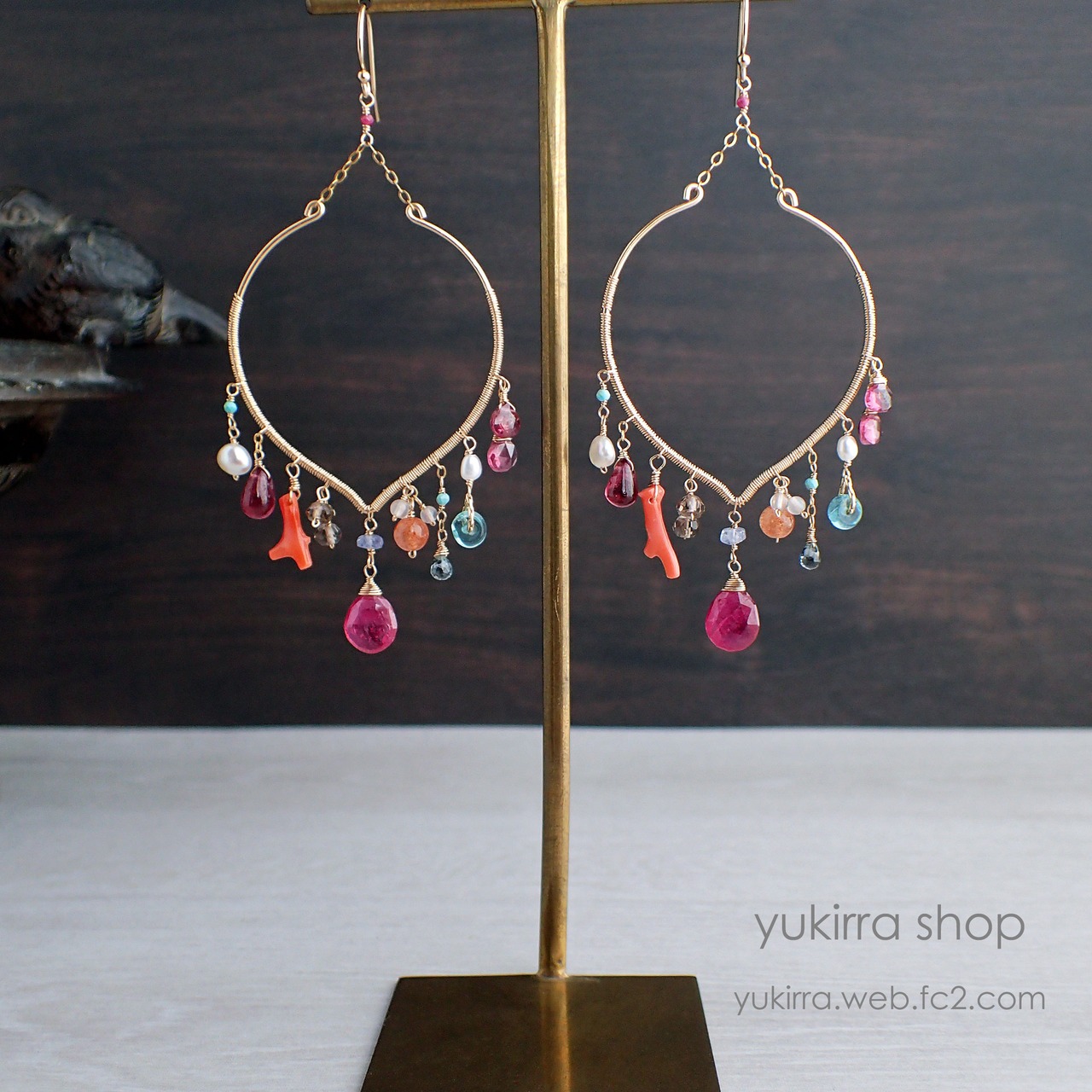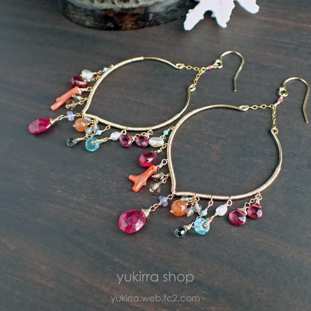 華やかな3種類のルビーやロードライトガーネットの鮮やかな色合い、繊細な淡水パールやアパタイト、トルコ石などが絶妙に組み合わさり、耳元を優雅に飾ります。