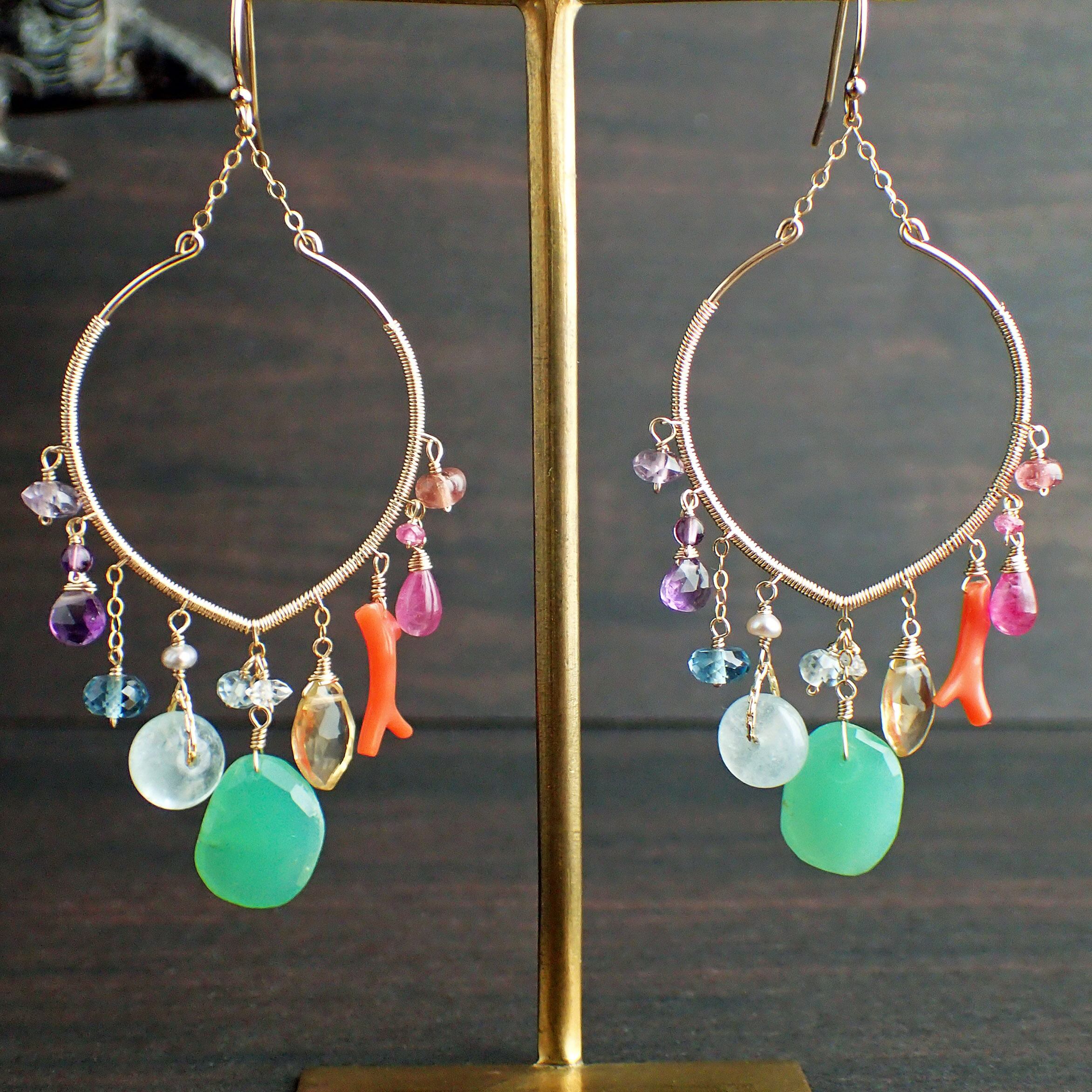 # クリソプレーズ&ジェムストーンの虹色シャンデリアピアス