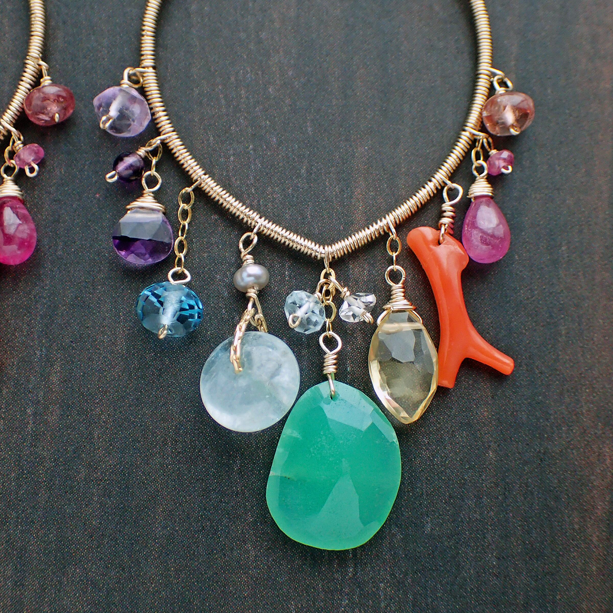 この美しい虹色のシャンデリアピアスは、鮮やかなクリソプレーズとさまざまなジェムストーンを巧みに組み合わせた特別なデザインのアイテムです。