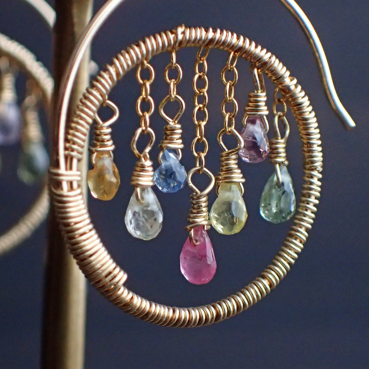 この美しい虹色のサークル・シャンデリアピアスは、ファンシーカラーサファイアを使用した特別なデザインのアイテムです。