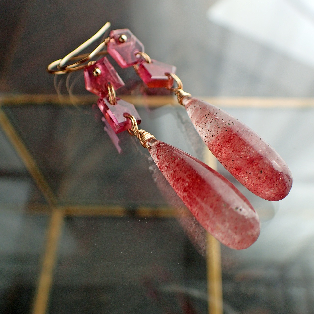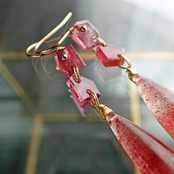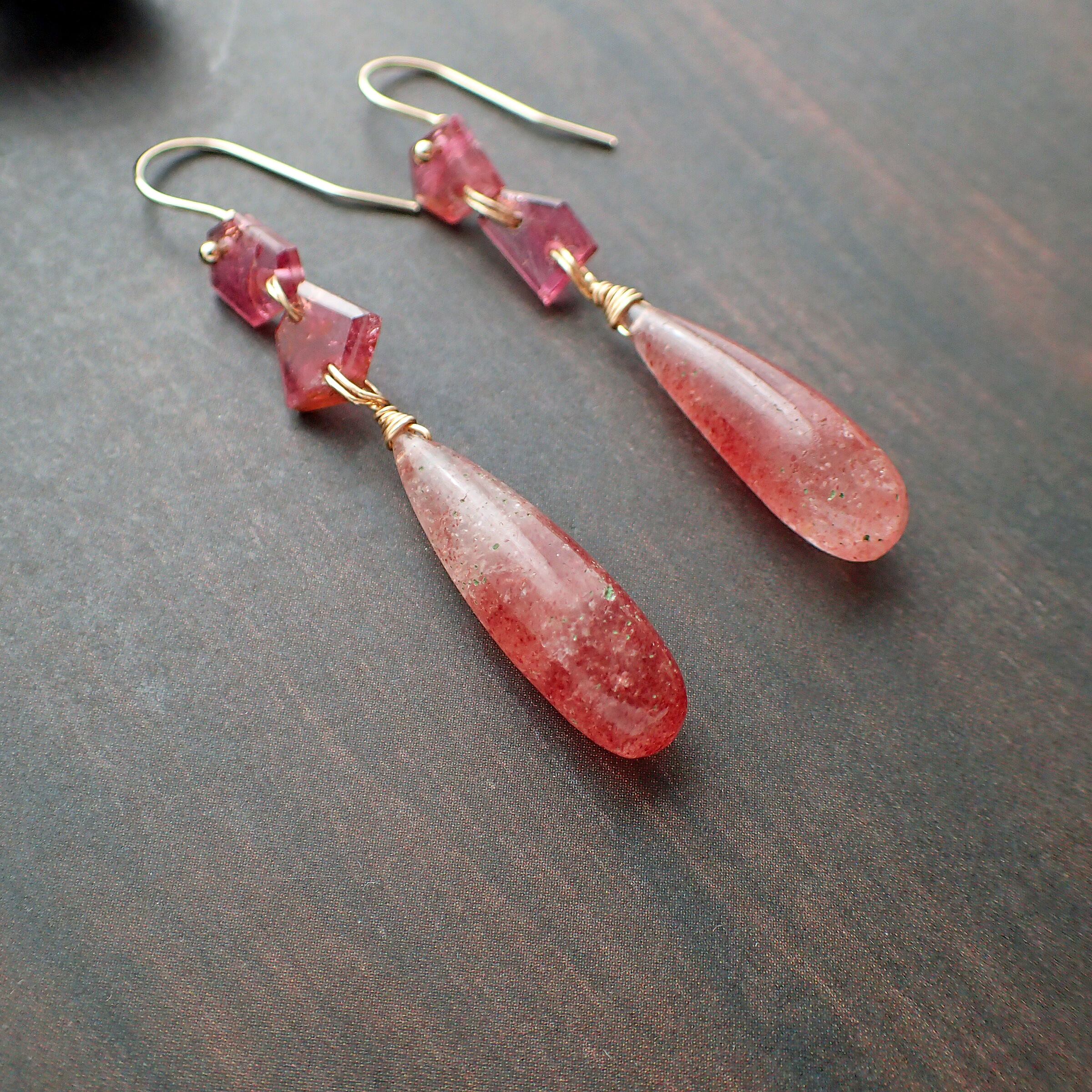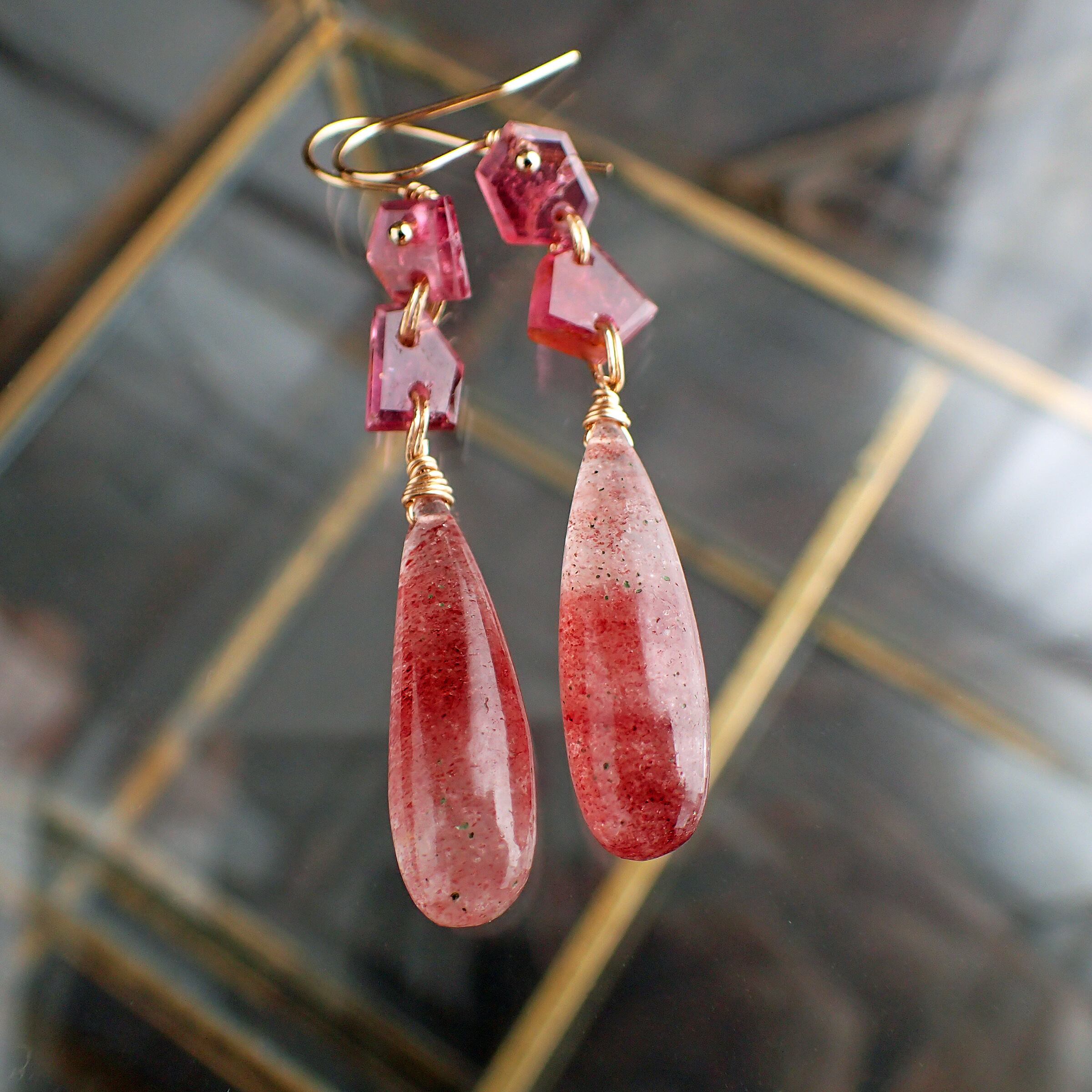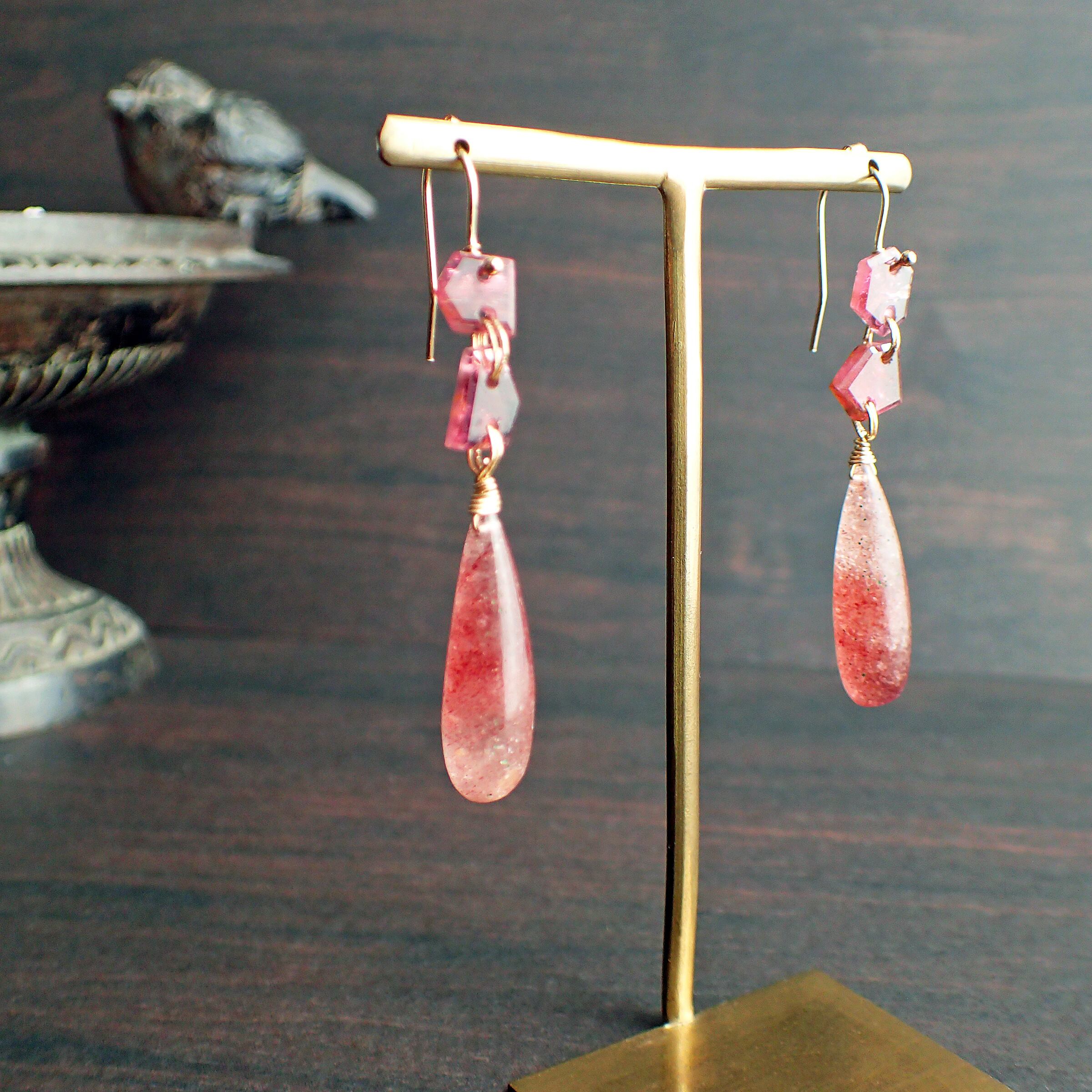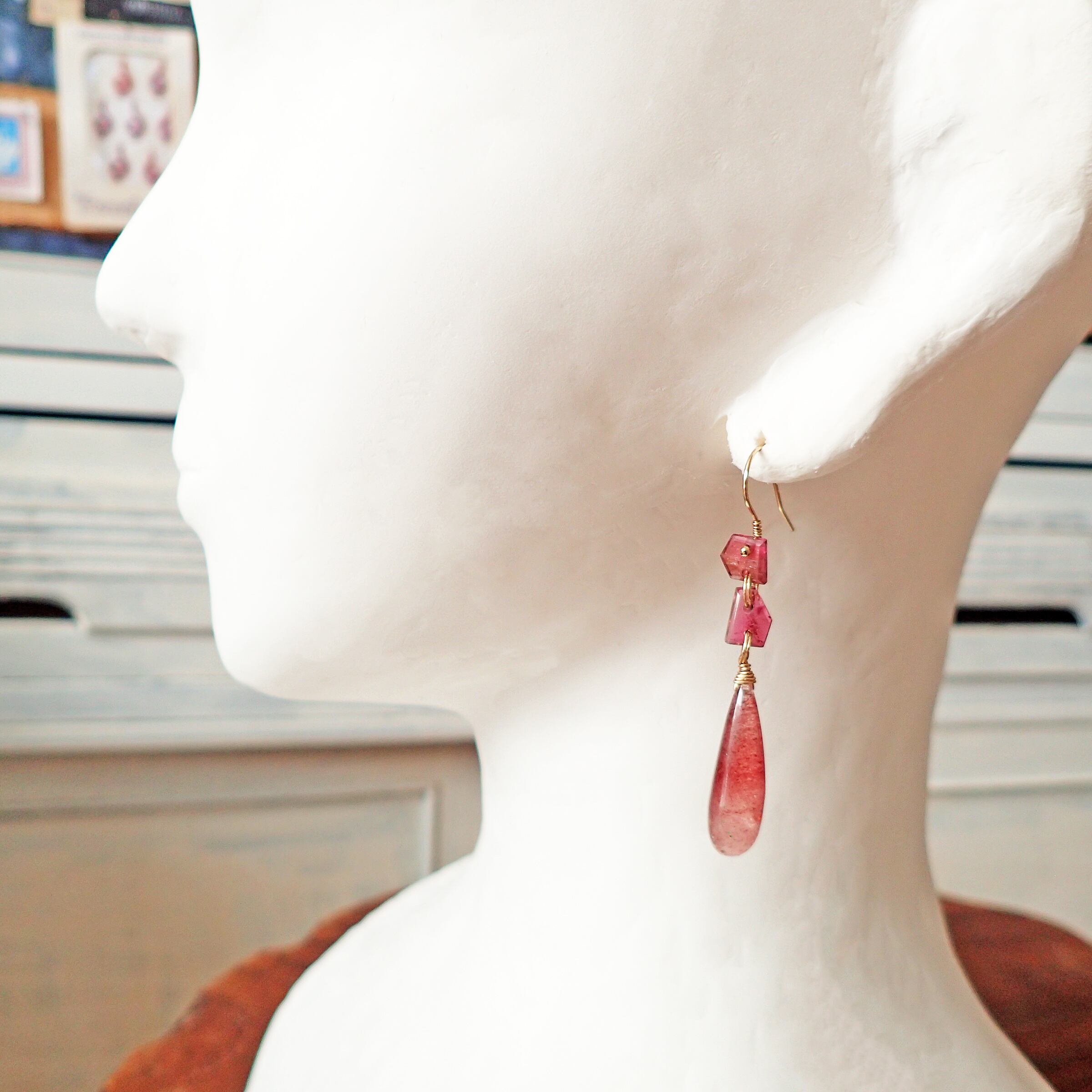 この特別なロングピアスは、甘美なストロベリークウォーツと鮮やかなピンクトルマリンを使用したデザインのアイテムです。