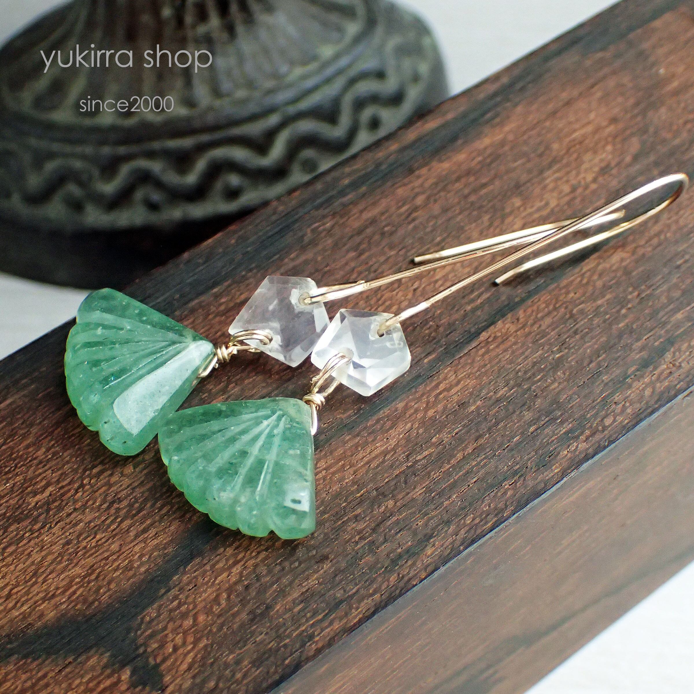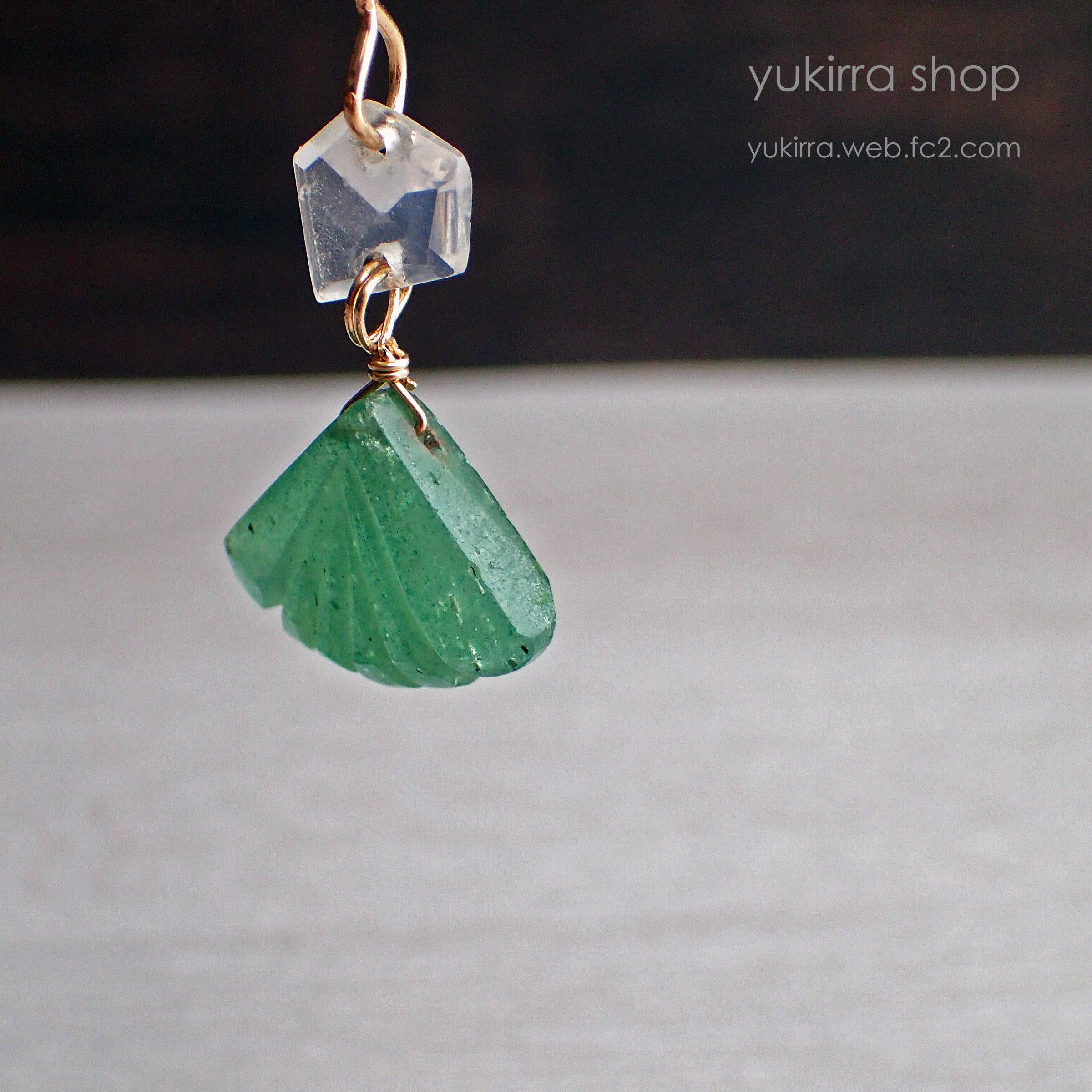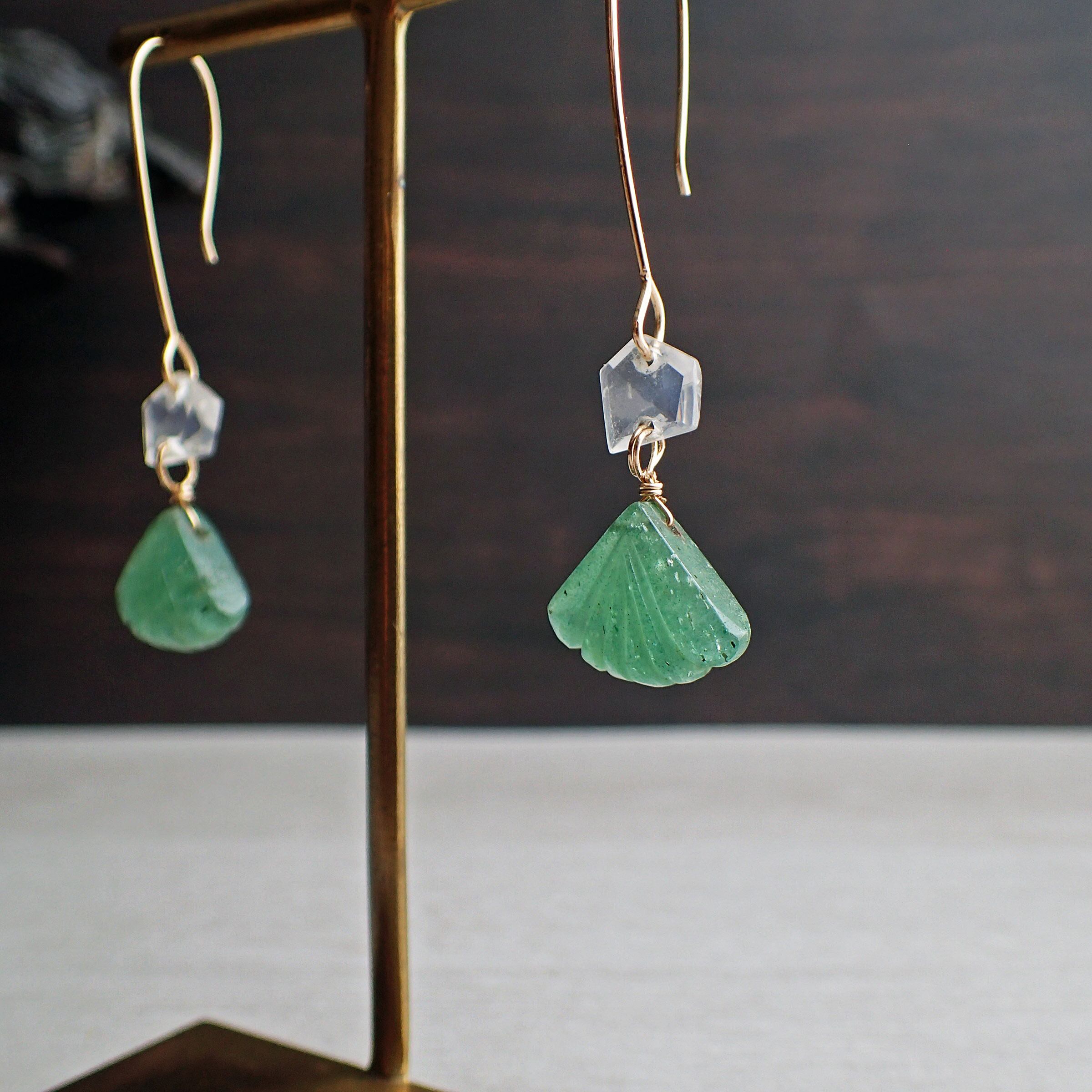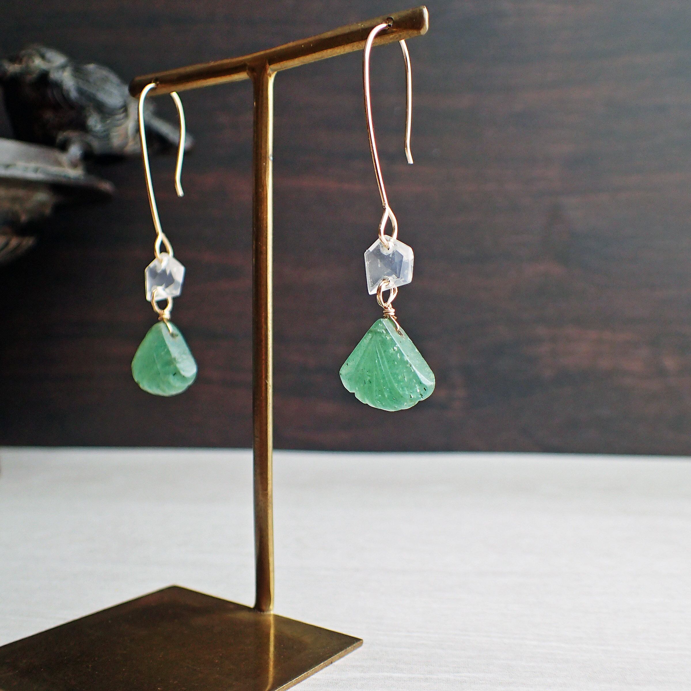 この美しいグリーンアベチュリンとスコロライトを使用したロングピアスは、自然の恵みを感じさせるデザインで、耳元にさわやかな印象を与えます。