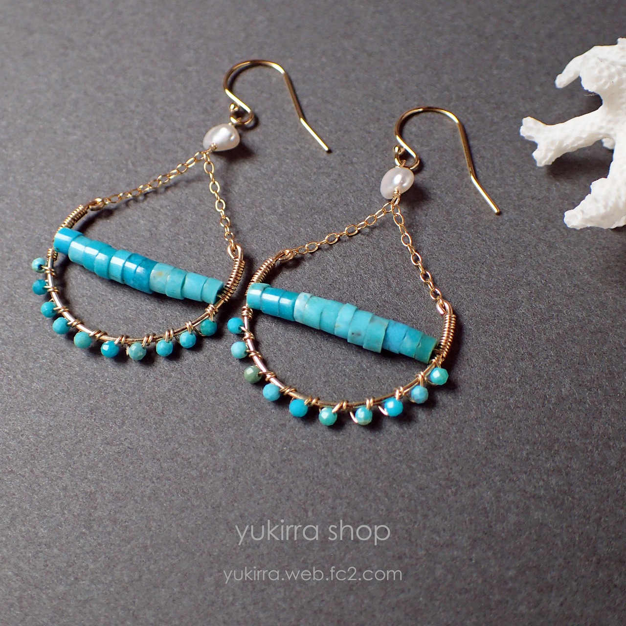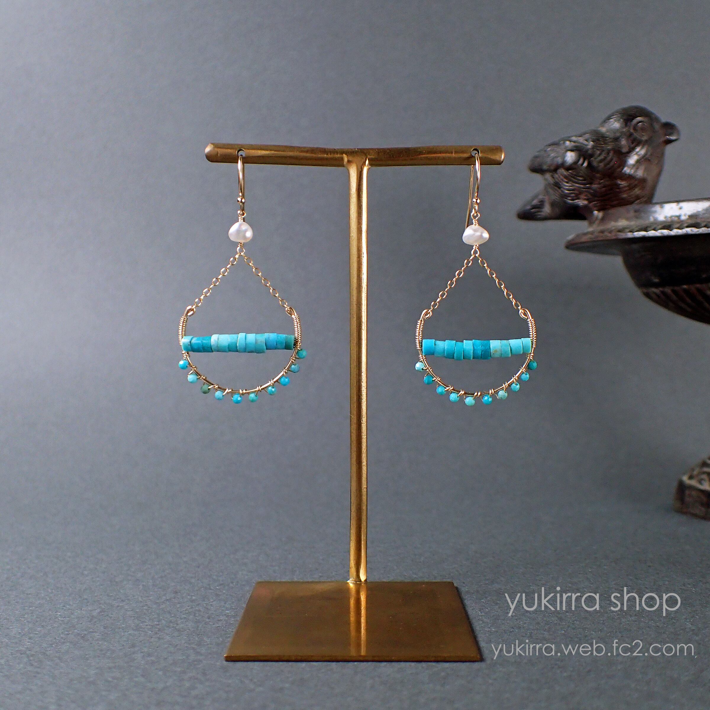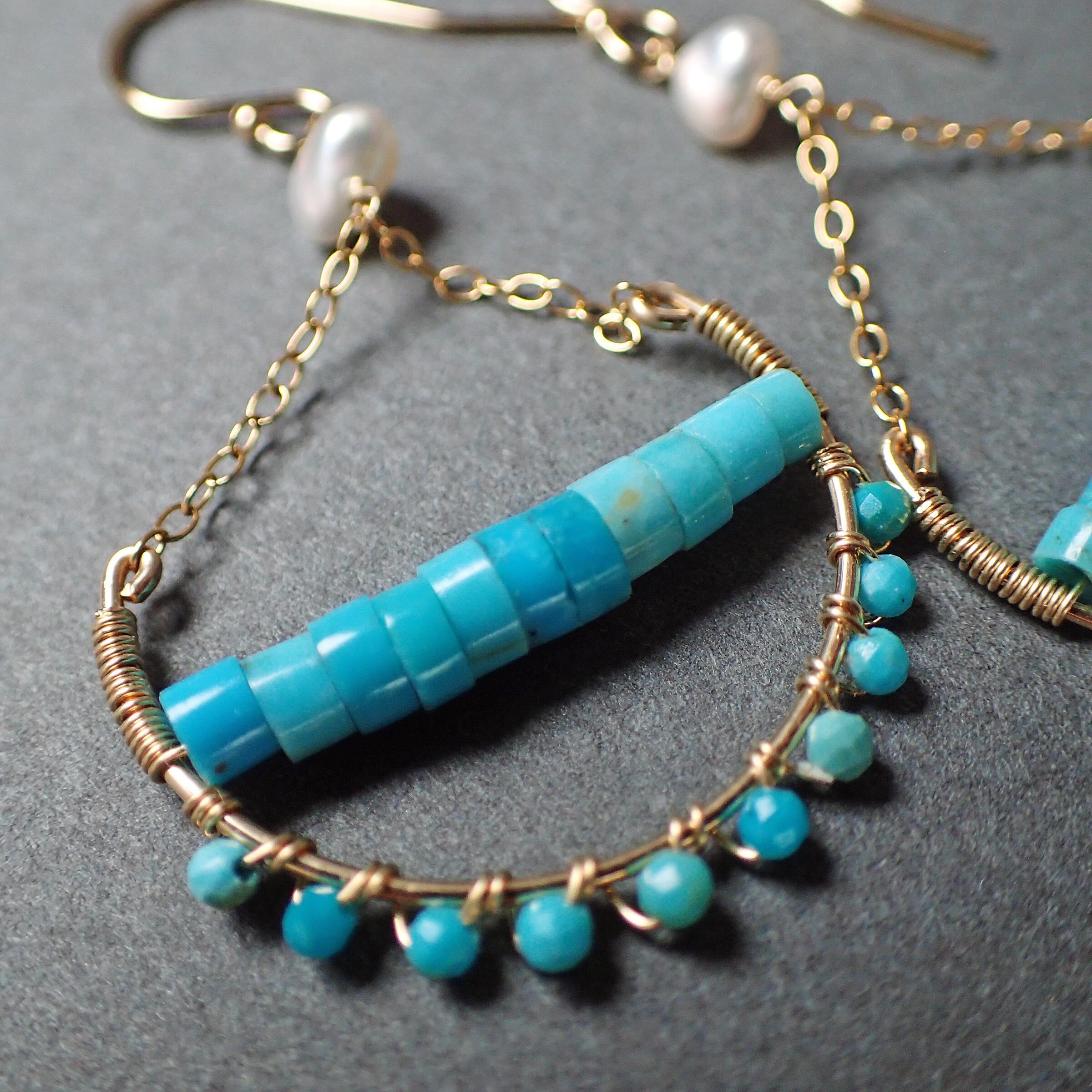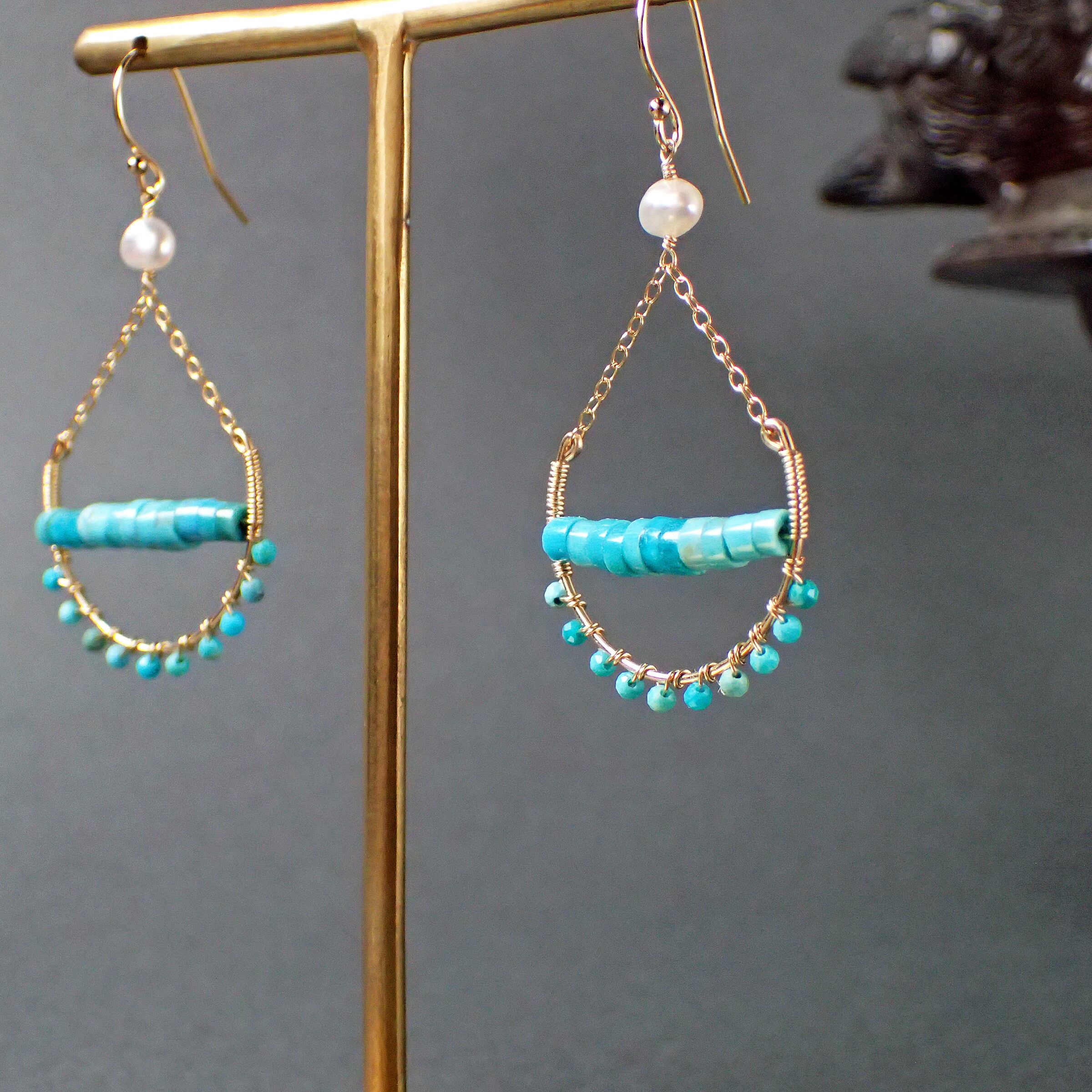 この上品なトルコ石とあこやケシパールを使用したシャンデリアピアスは、耳元に独特の美しさを加え、柔らかな輝きを放ちます。