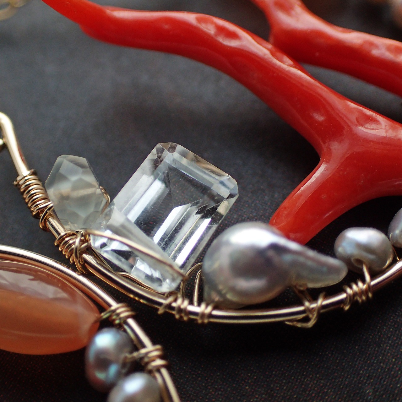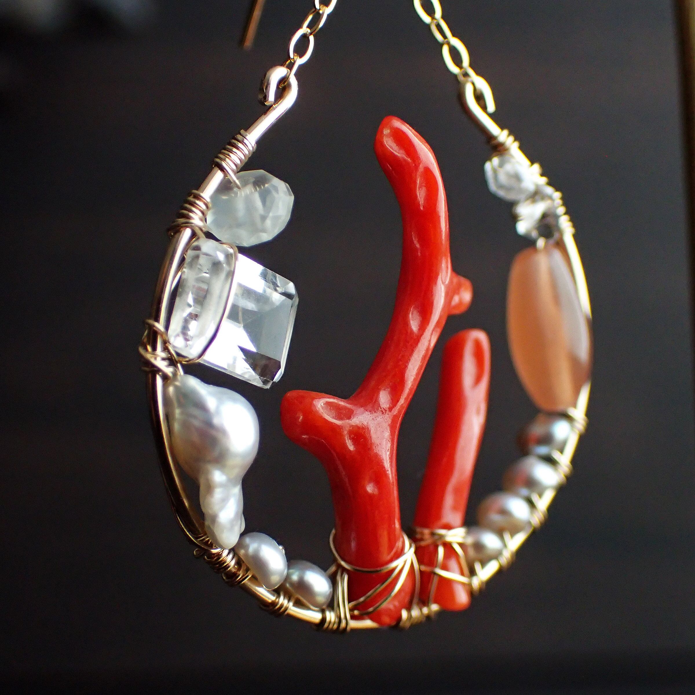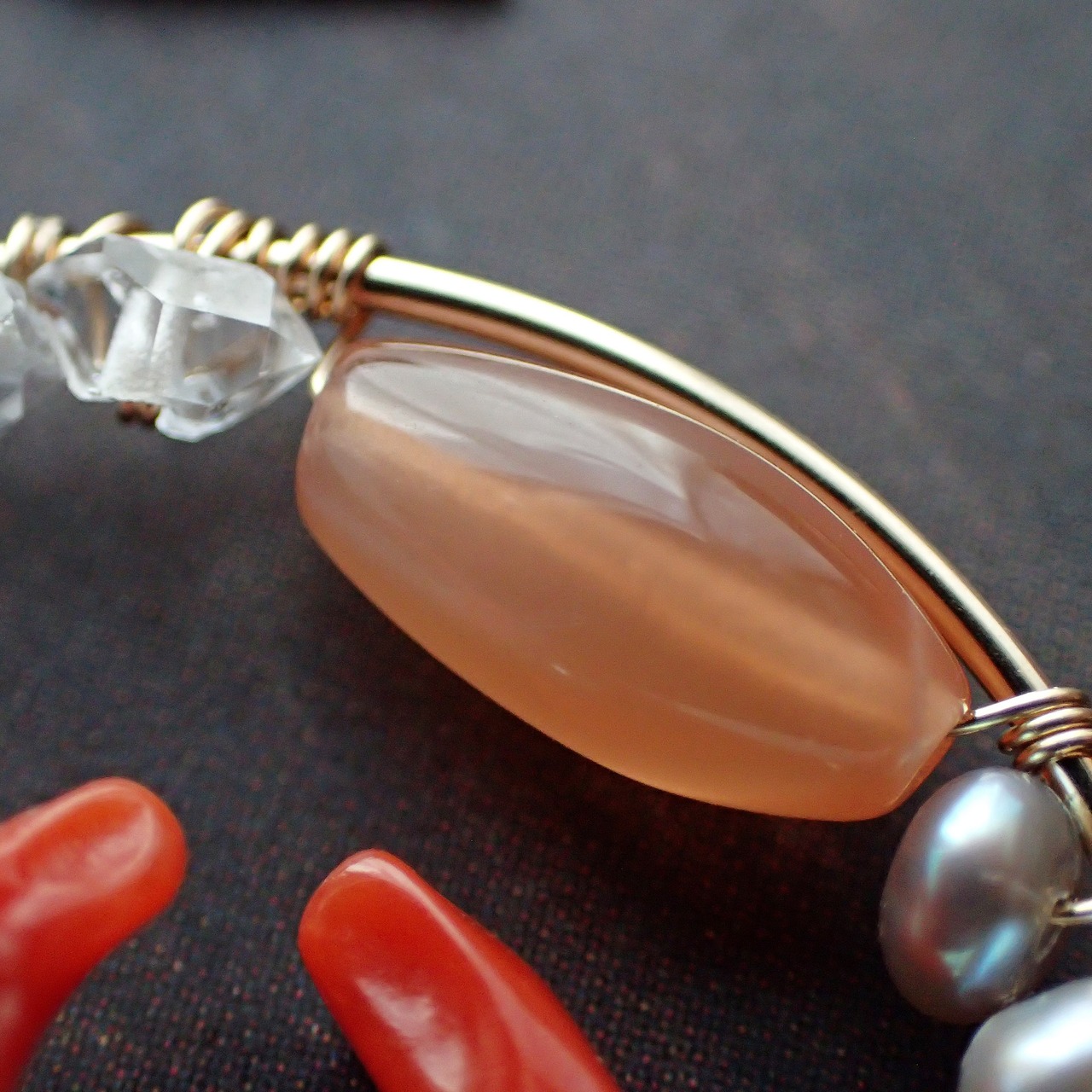 珊瑚・ハーキマーダイヤモンド・セイロンムーンストーン・オレンジムーンストーン・ホワイトトパーズ・あこやパール・淡水パール・K14GF