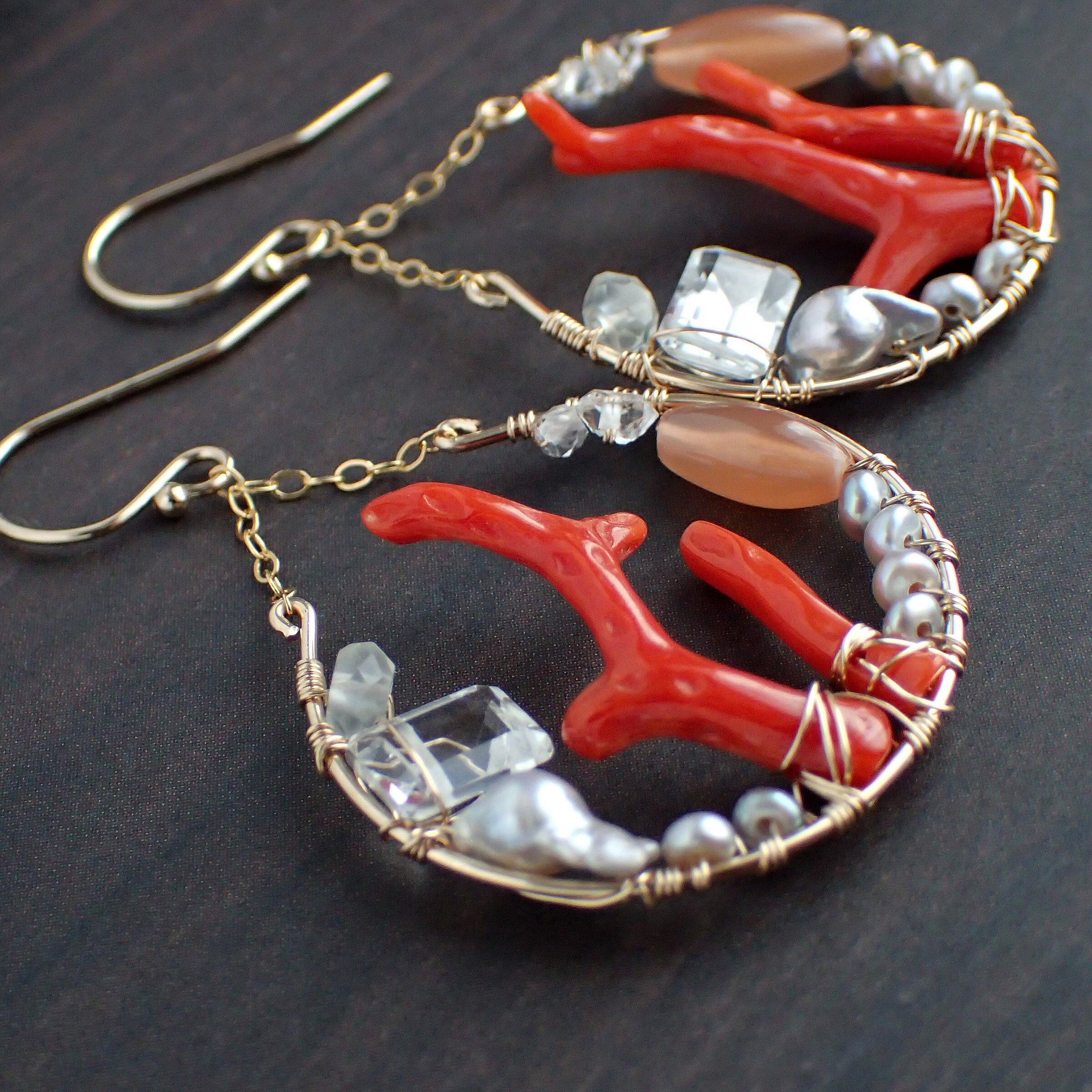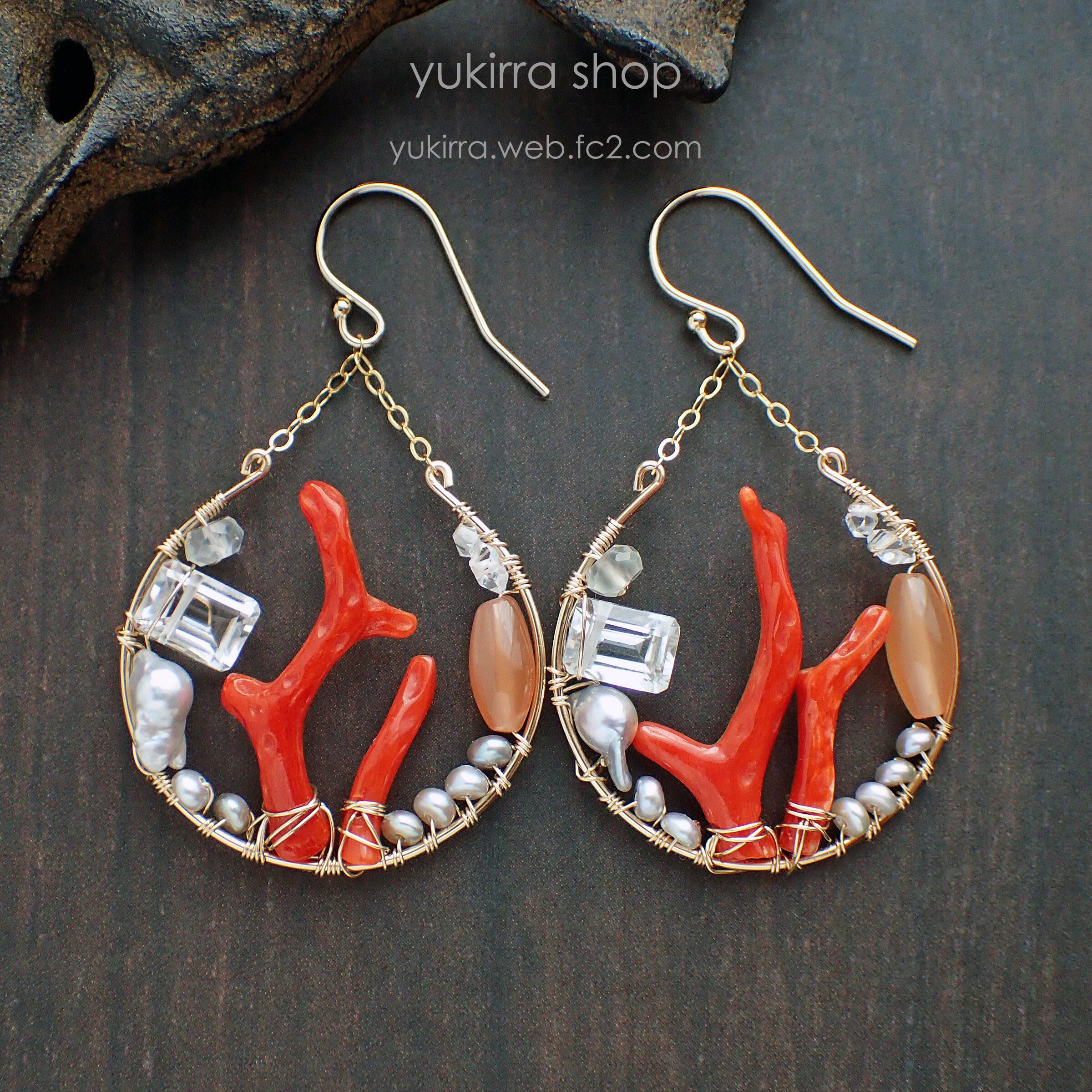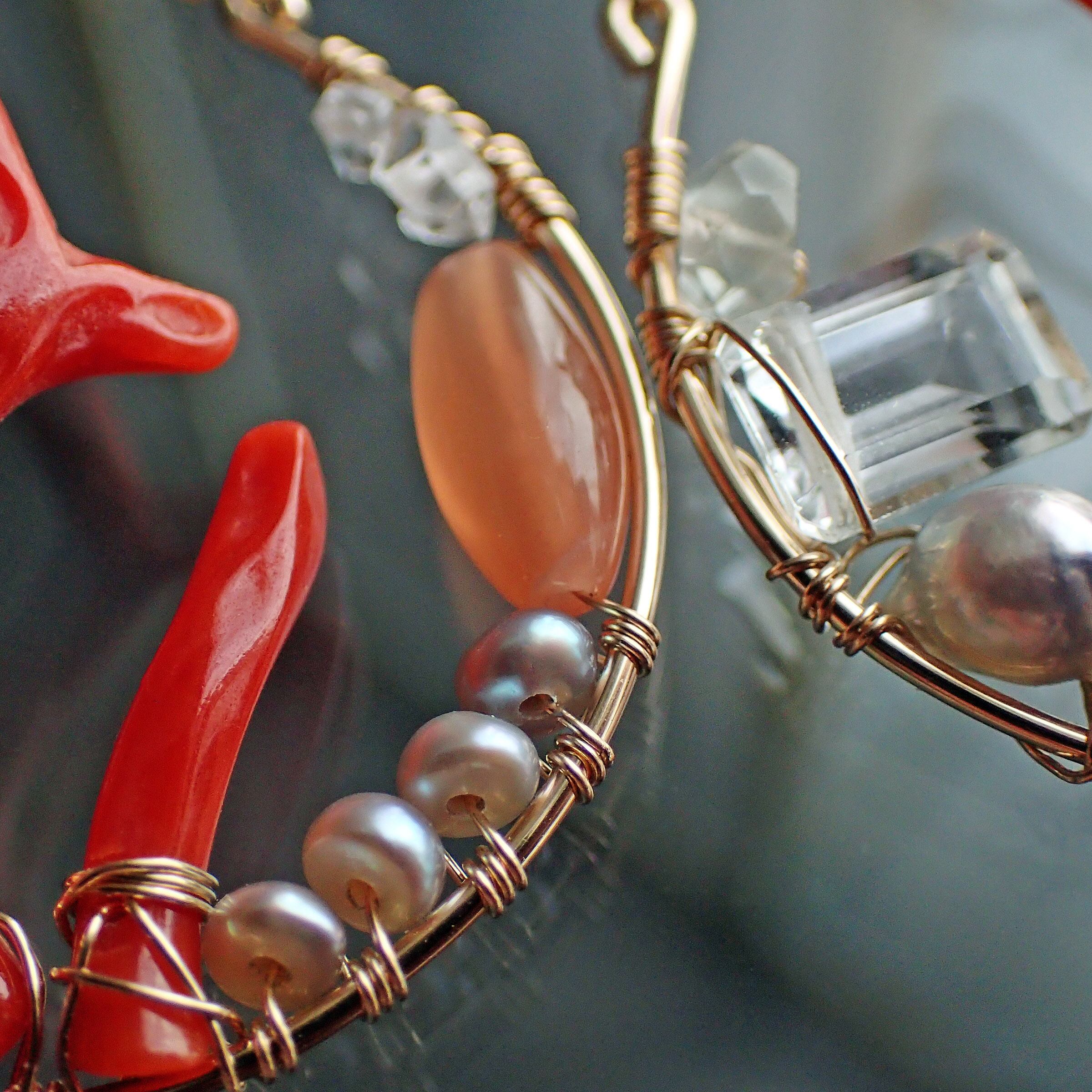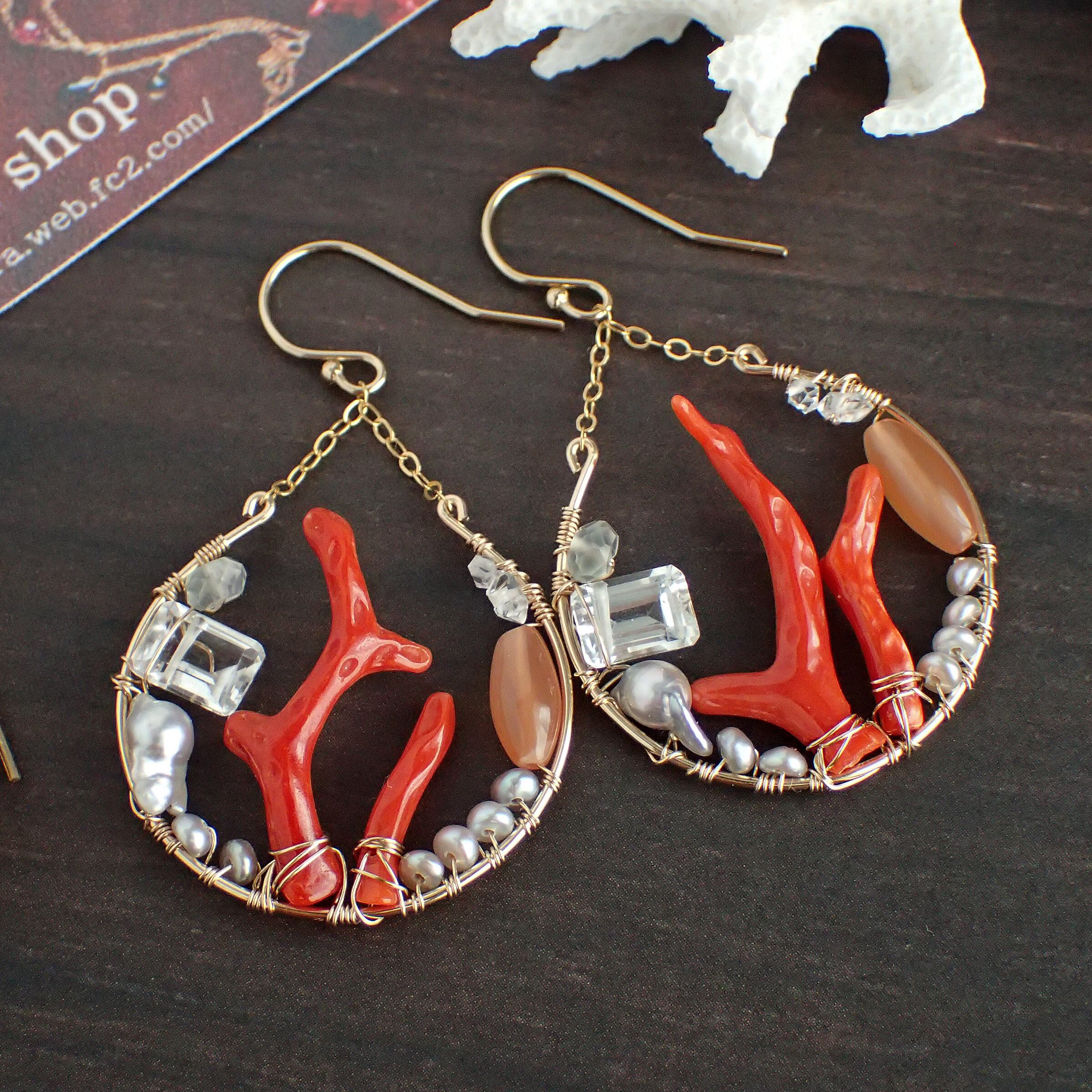 珊瑚・ハーキマーダイヤモンド・セイロンムーンストーン・オレンジムーンストーン・ホワイトトパーズ・あこやパール・淡水パール・K14GF