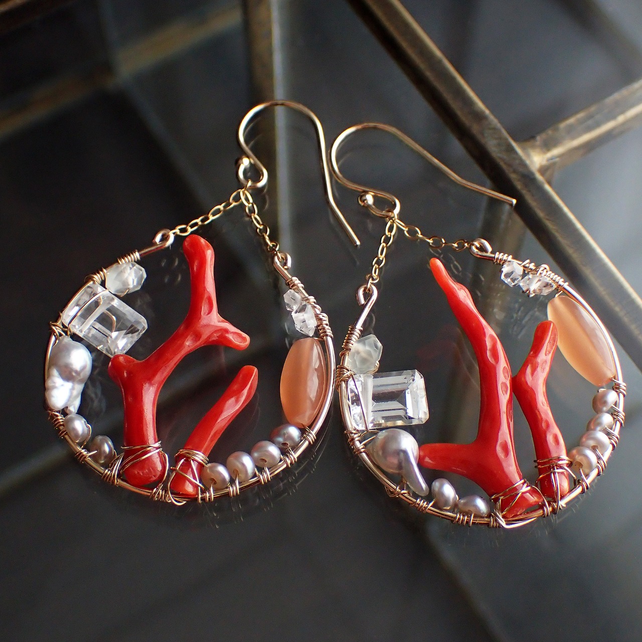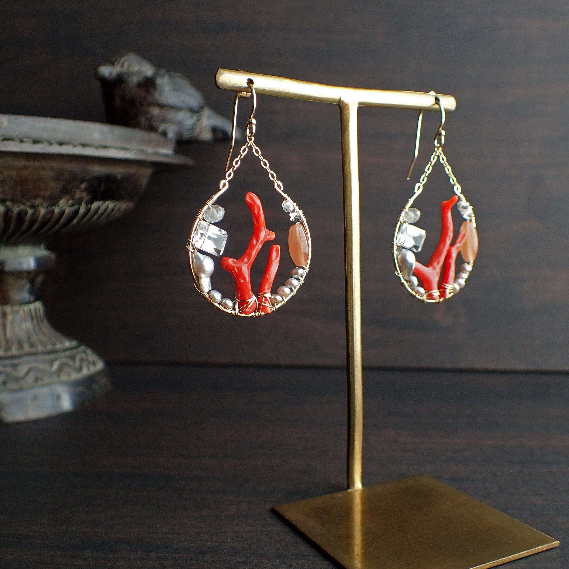 この魅力的な血色の枝珊瑚とジェムストーンを使用したピアスは、まるでワイングラスの中に美しい宝石が注がれているようなデザインです。