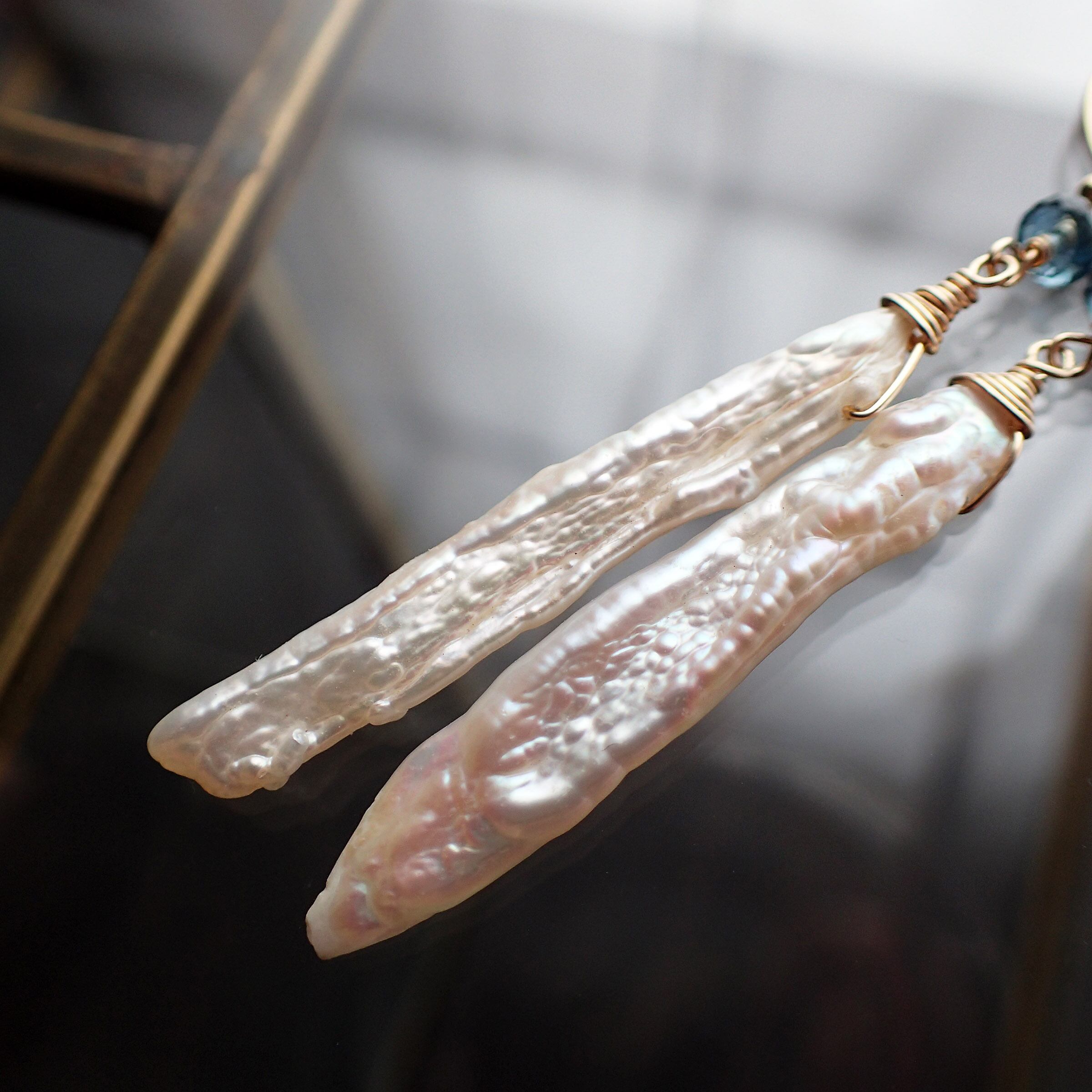 この美しい淡水バロックパールとロンドンブルートパーズを使用したロングピアスは、自然の魅力と洗練されたデザインが融合した華やかなアイテムです。