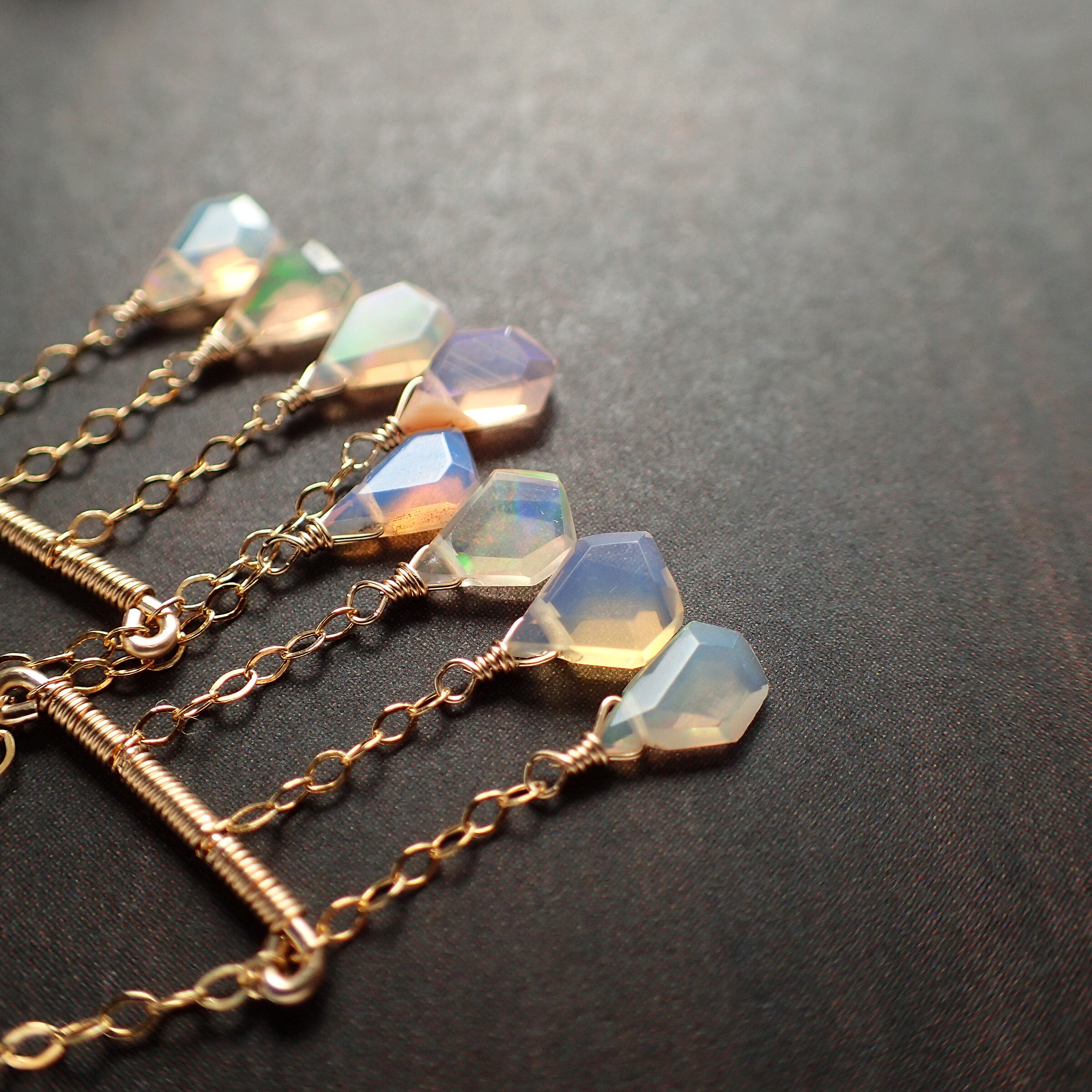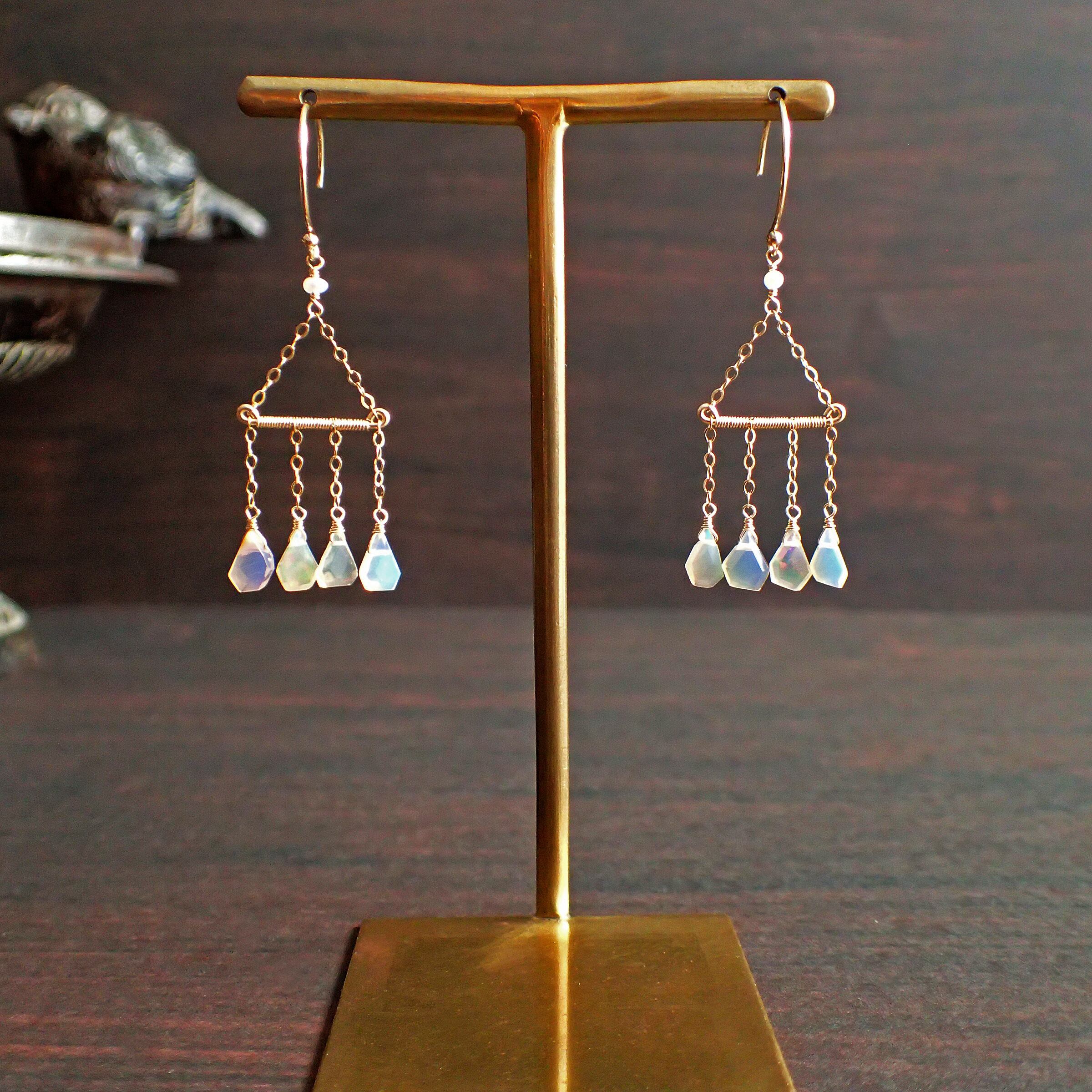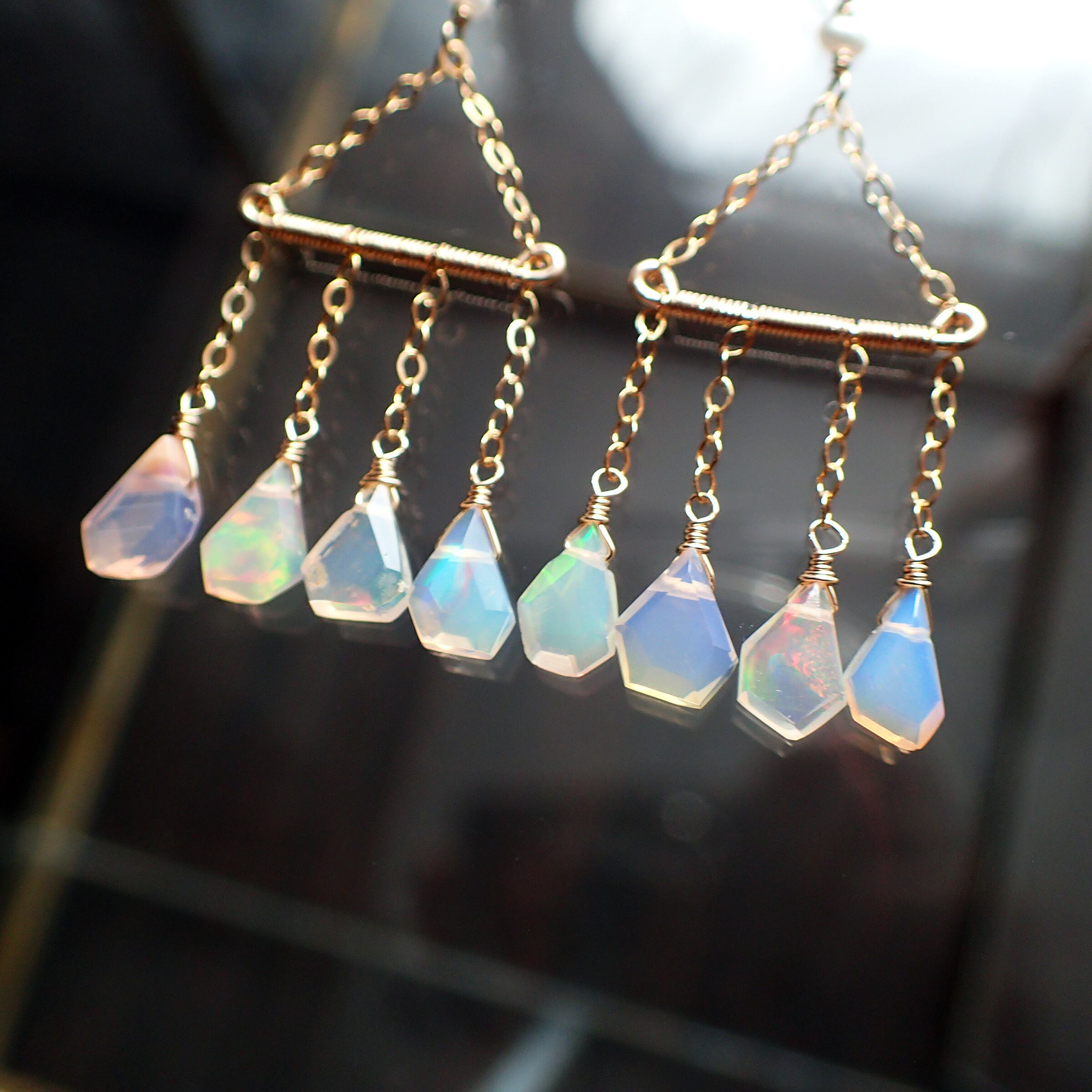この魅力的なオパールのプチシャンデリアピアスは、光の当たり方や見る角度によって美しい色の揺らぎを楽しむことができます。