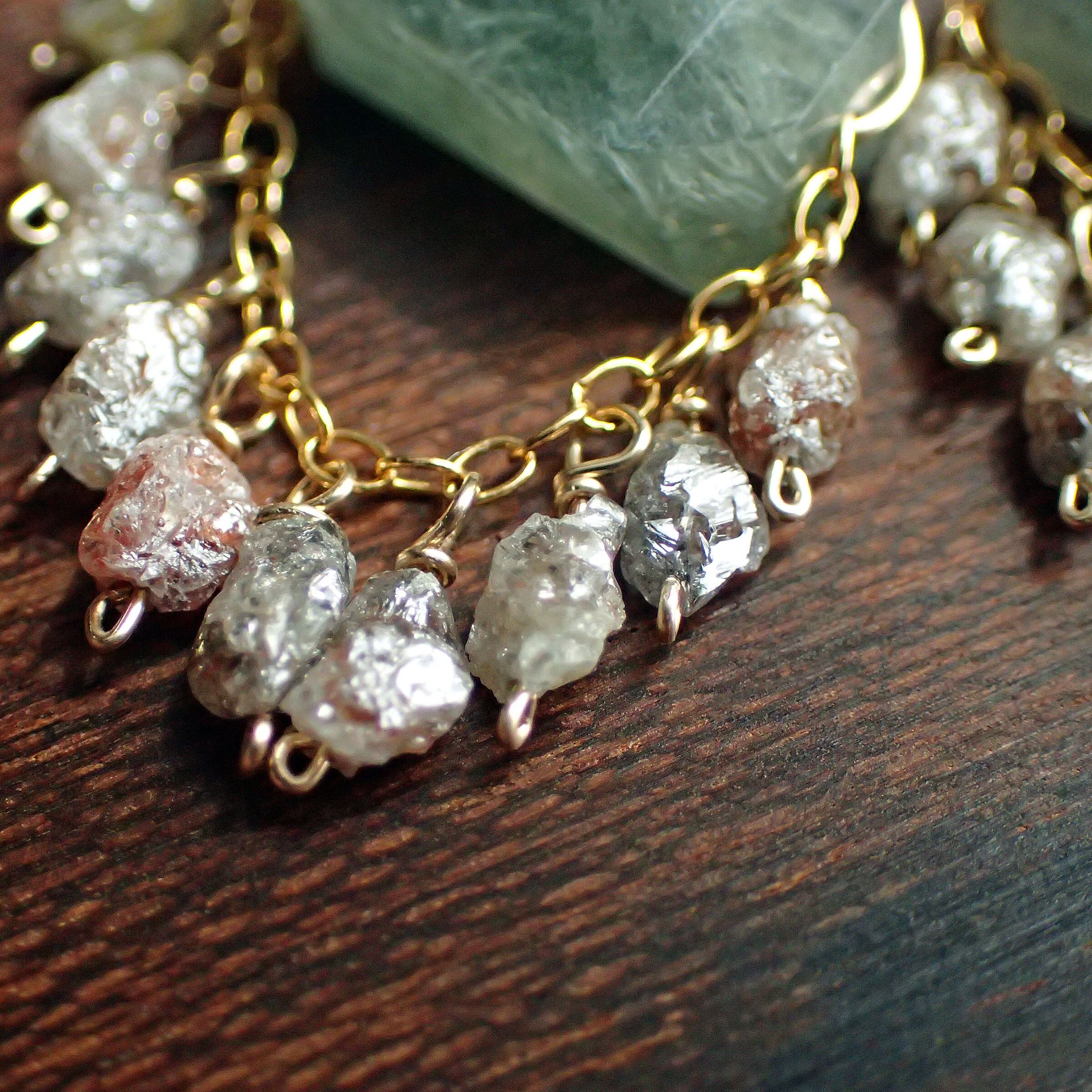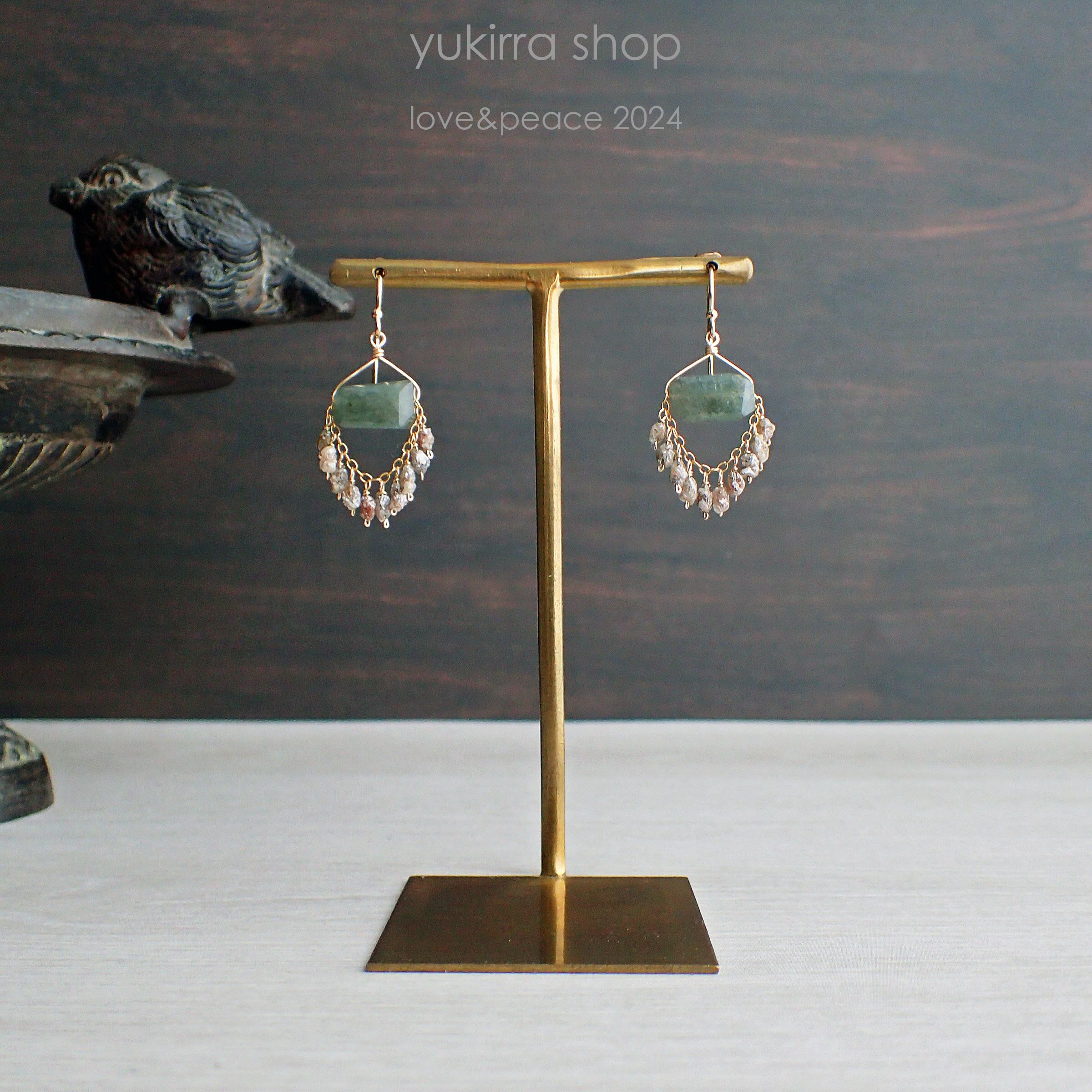 この渋美しいモスアクアマリンとラフダイヤモンドのシャンデリアピアスは、自然の力強さと繊細さを感じさせるデザインが魅力のアイテムです。