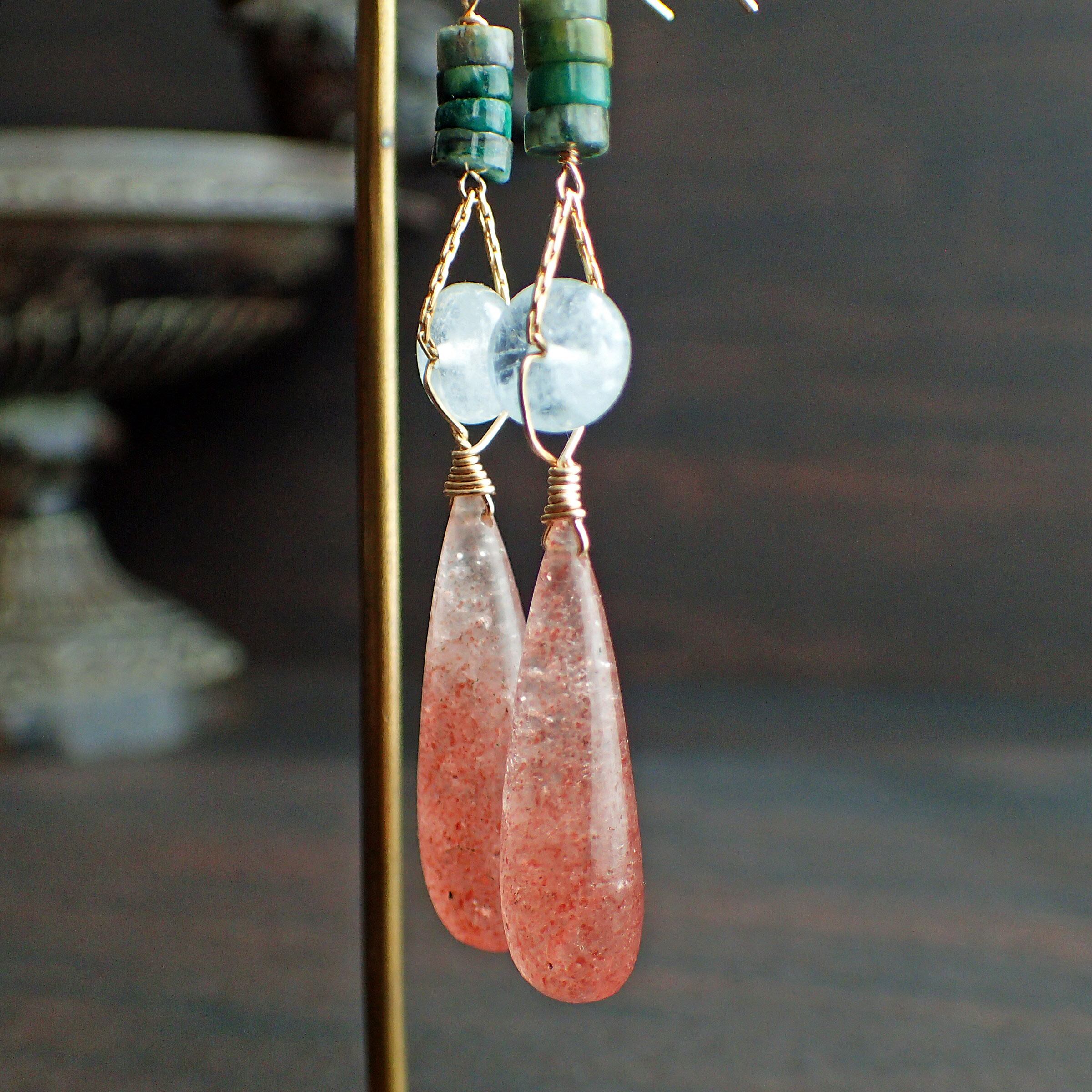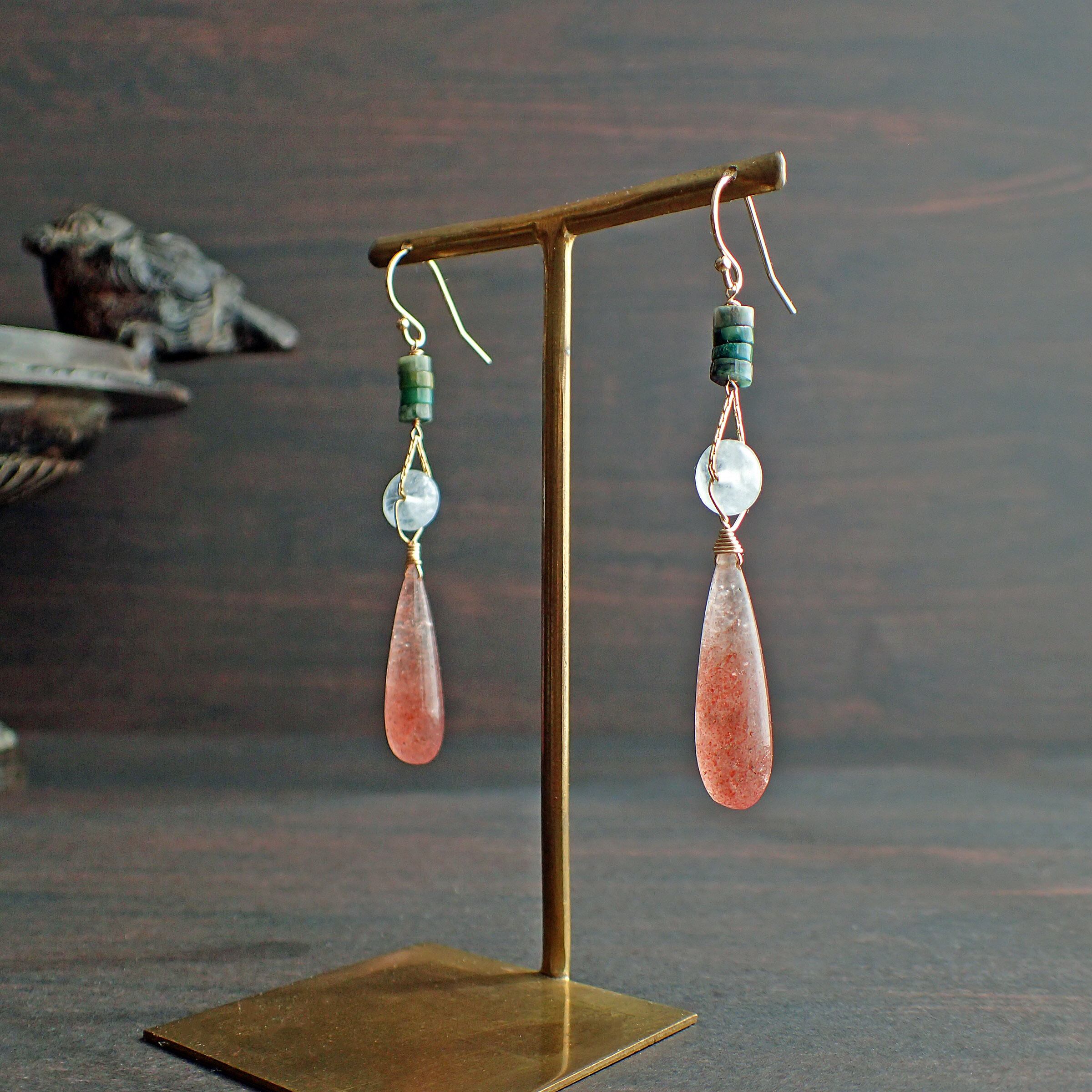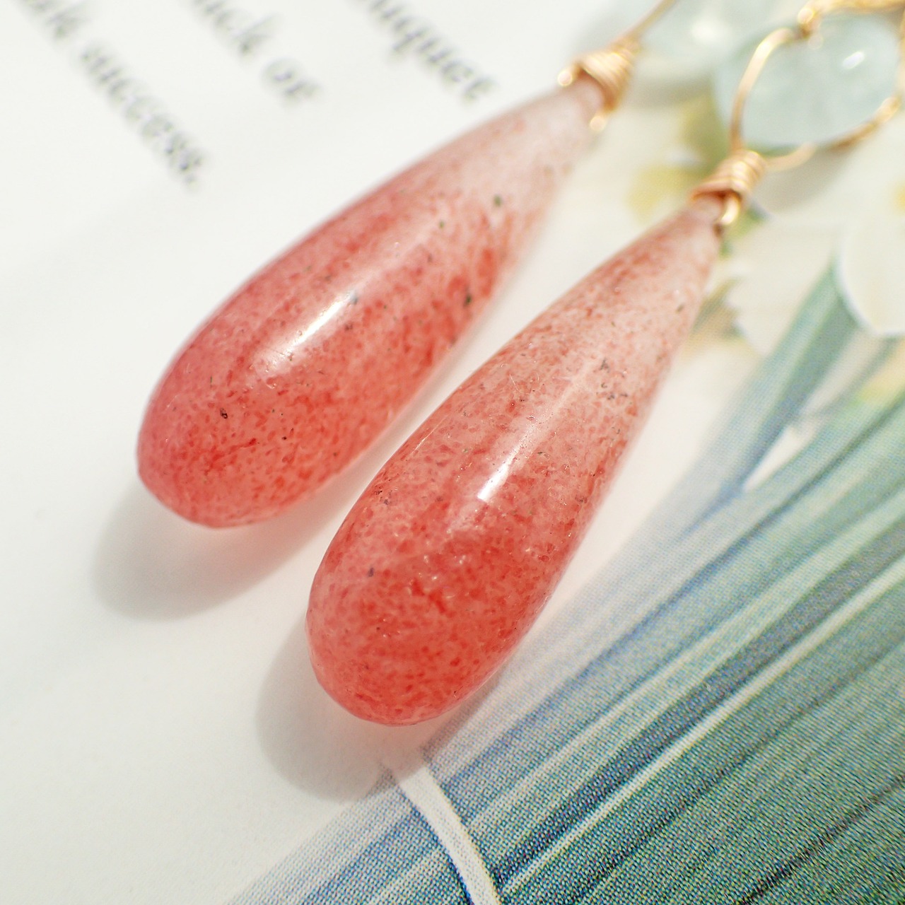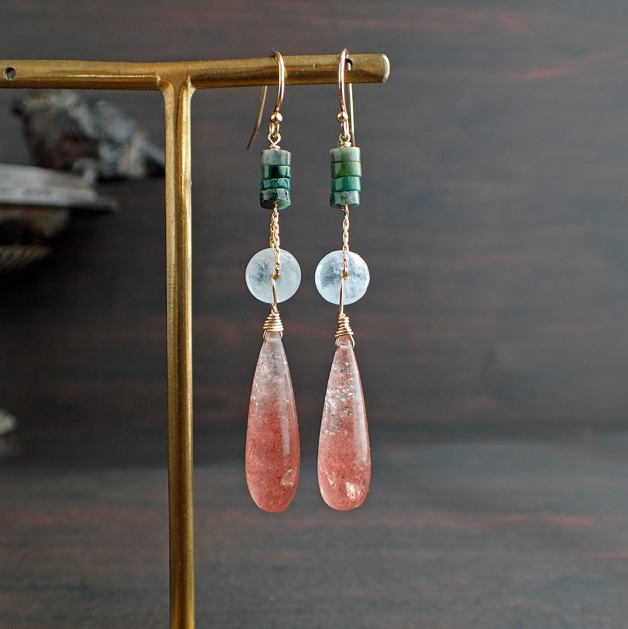 この美しいストロベリークウォーツとアクアマリンのロングピアスは、自然の魅力を引き立てるデザインが特長です。