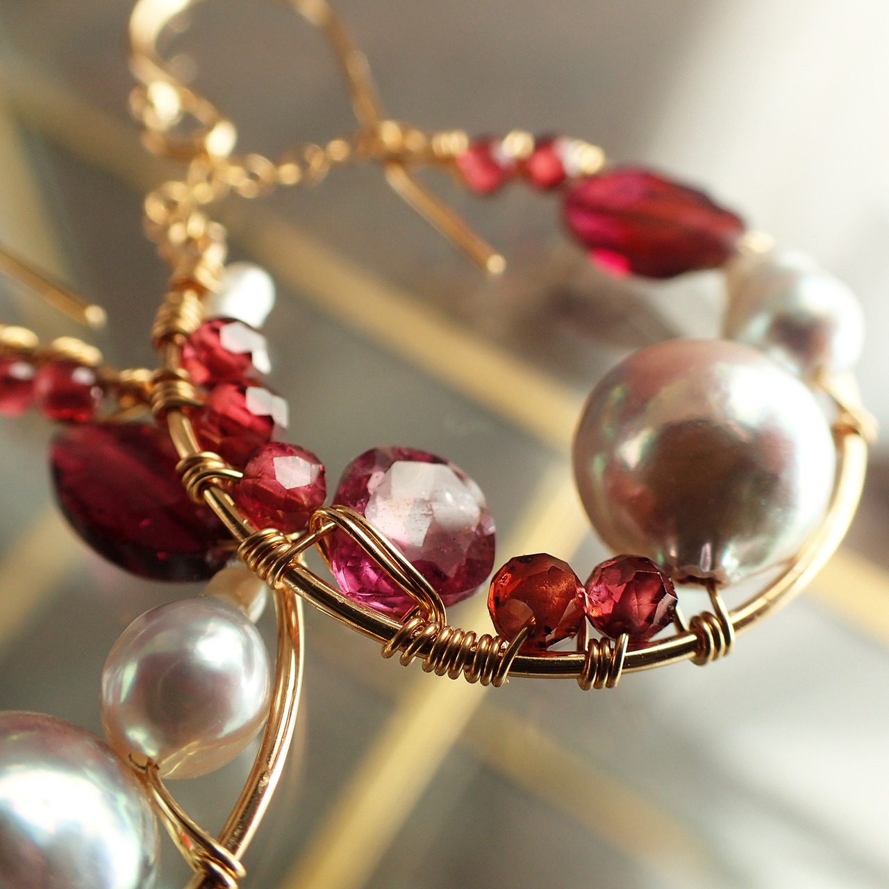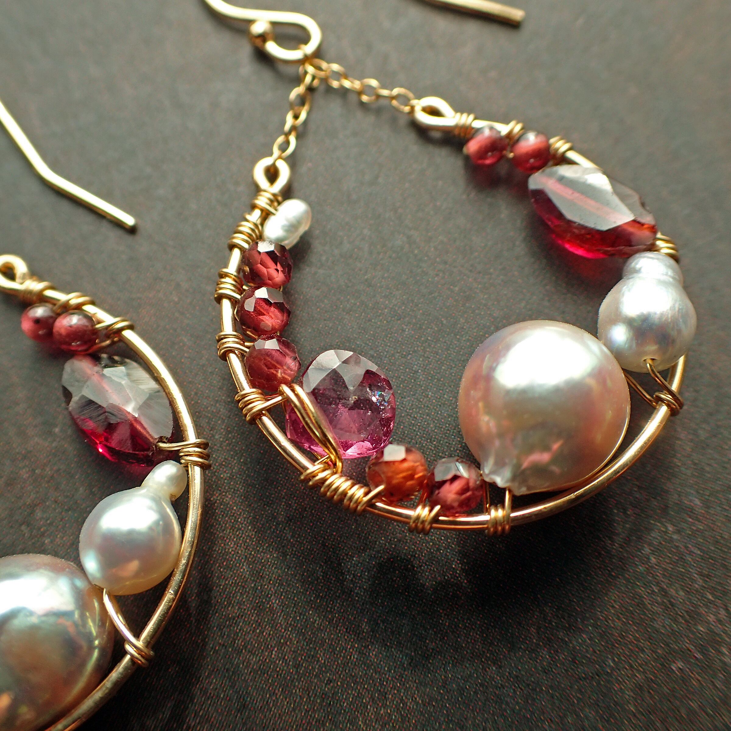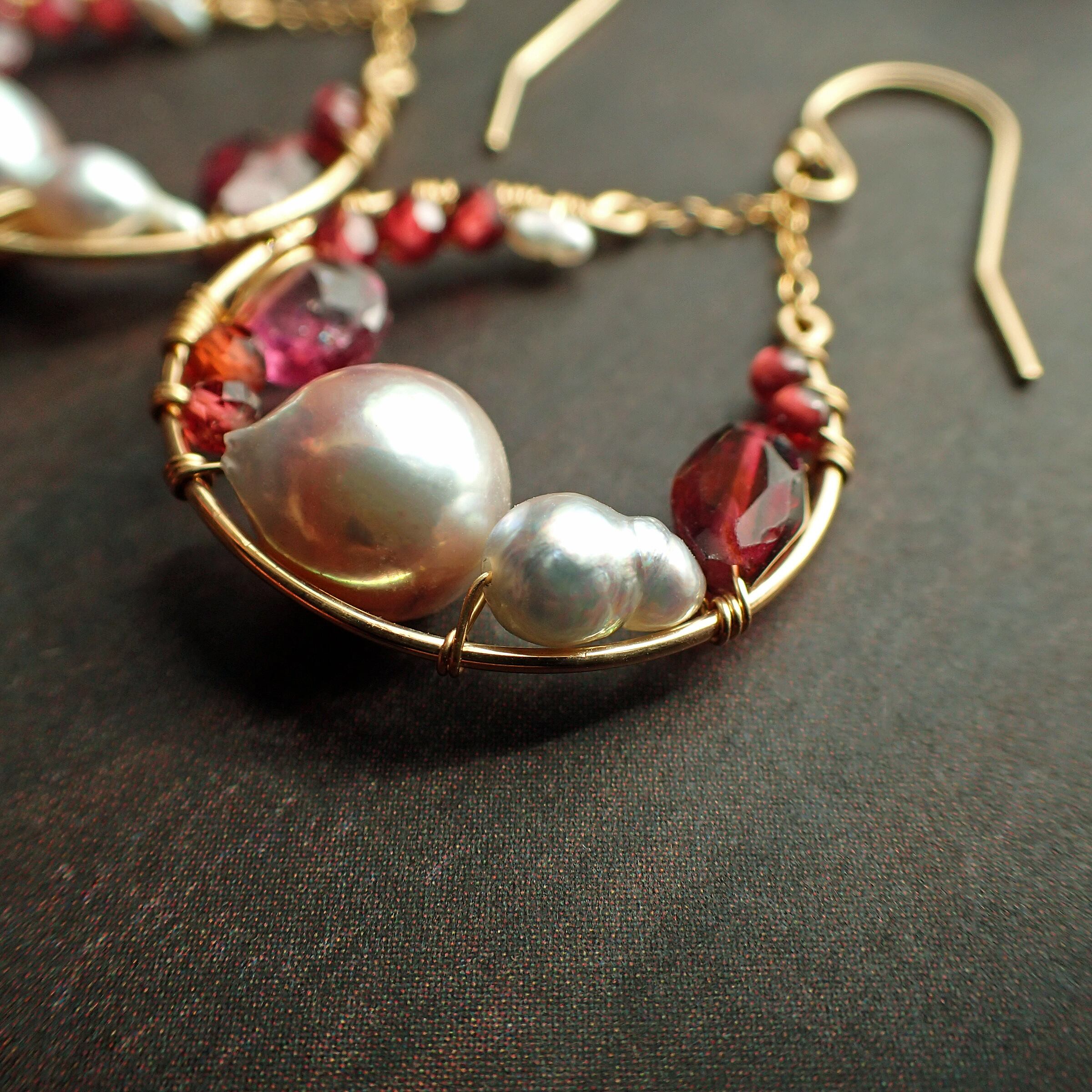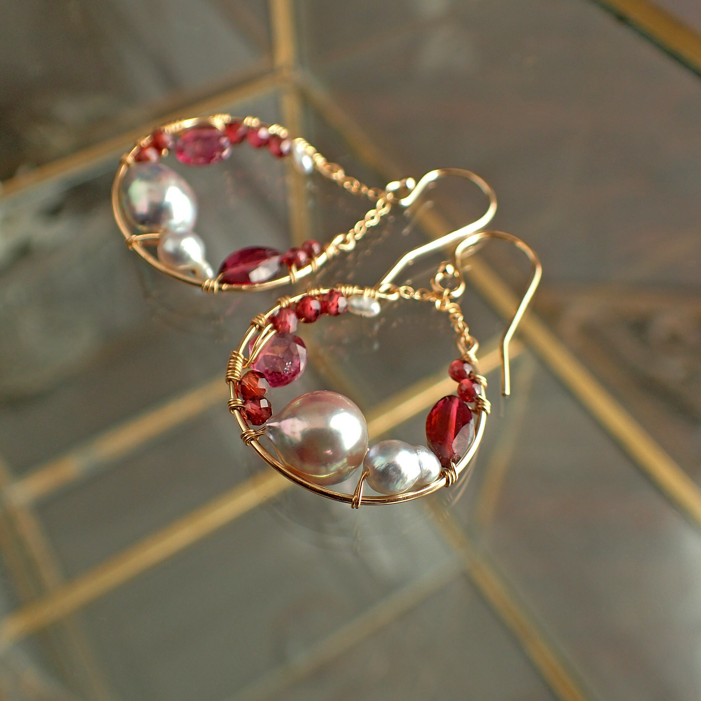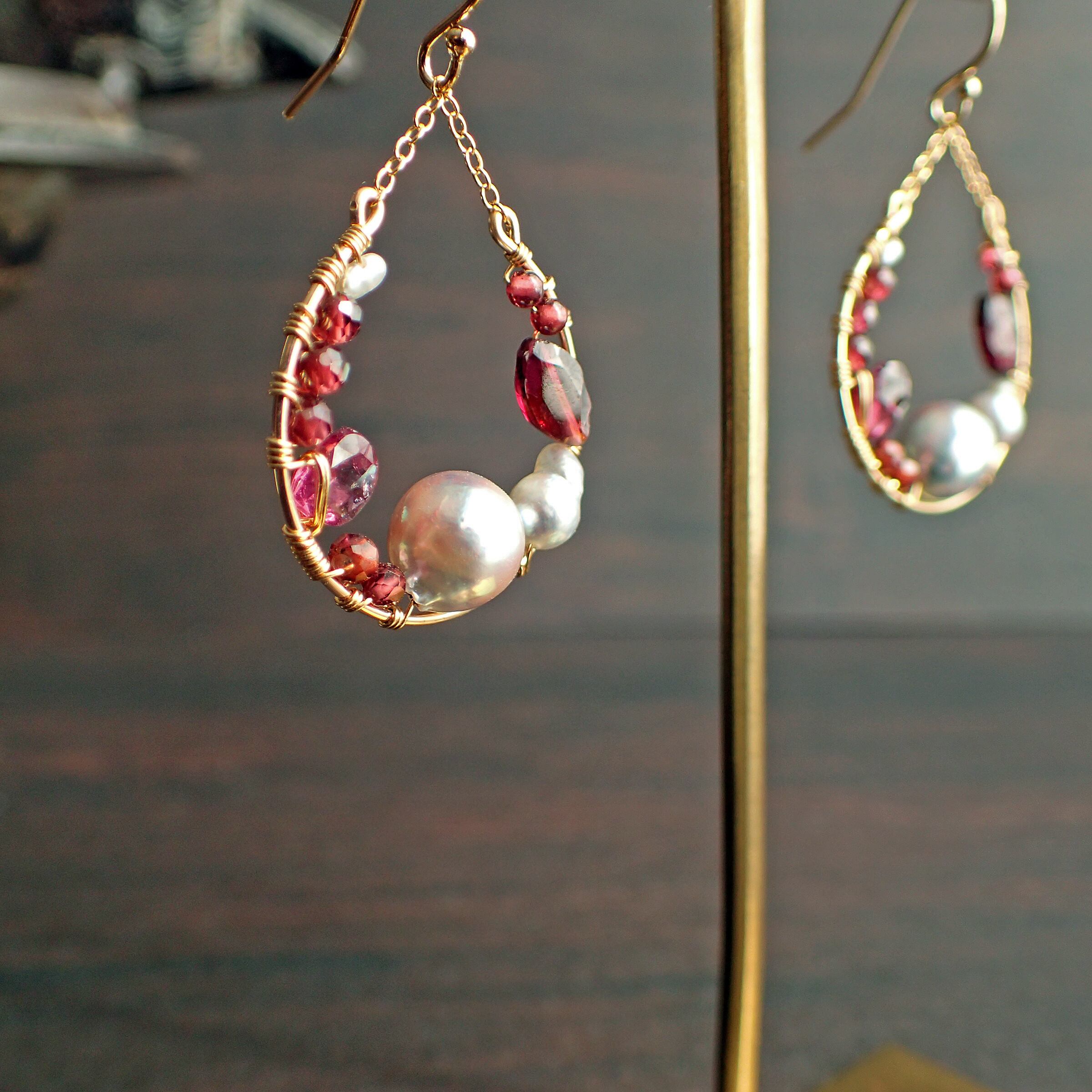 この素敵なあこやバロックパールとガーネットを使用したワイングラスピアスは、ジェムストーンやパールがまるでワイングラスに注がれているかのようなユニークなデザインが特長です。