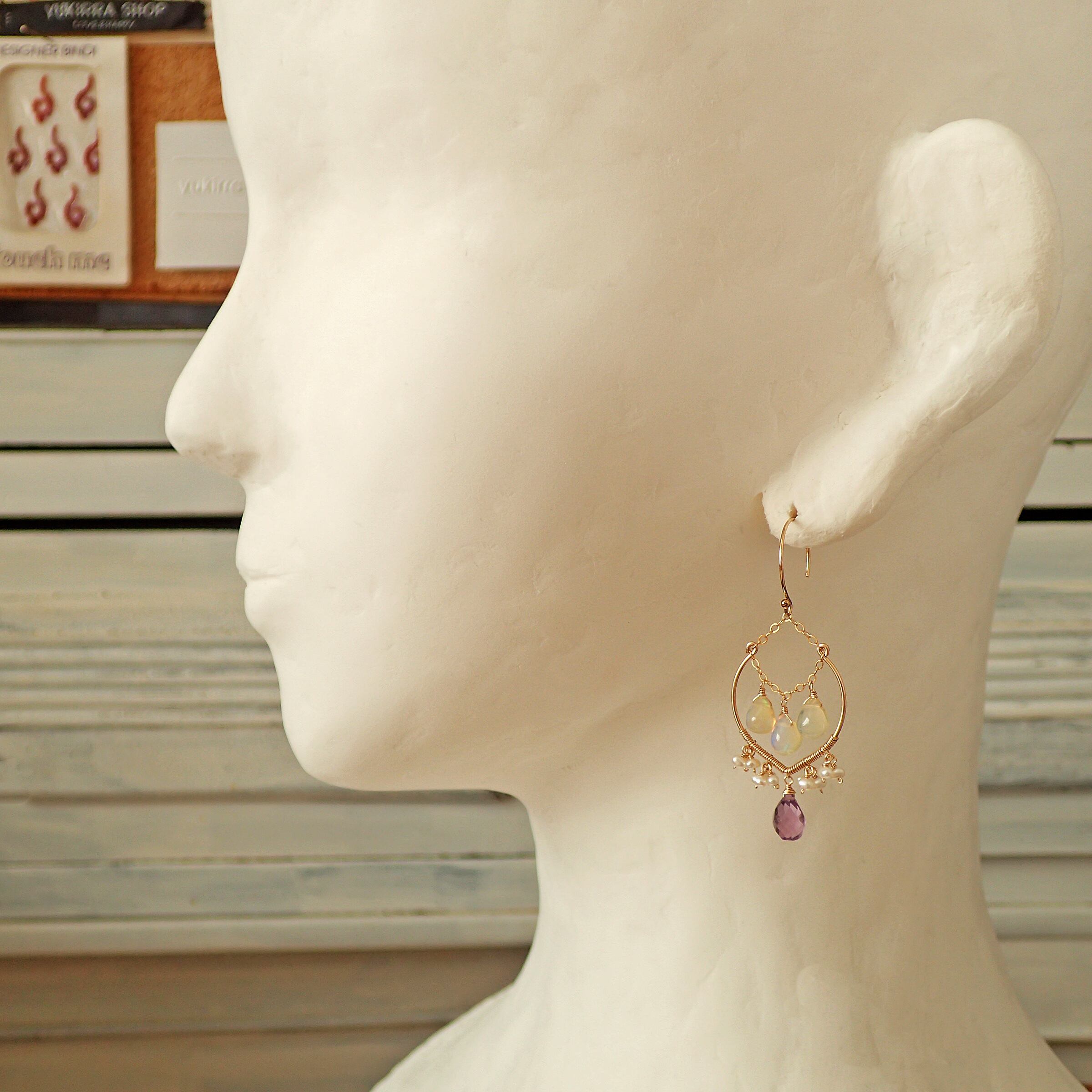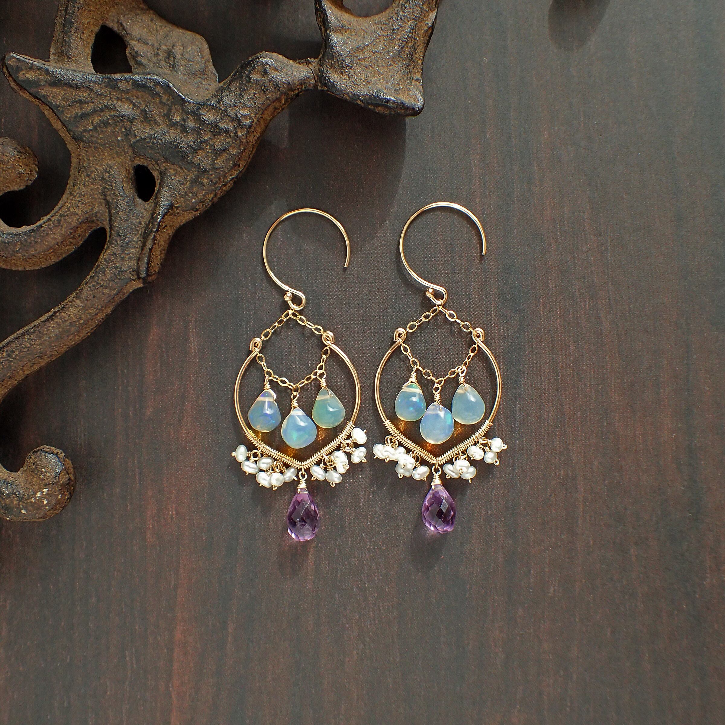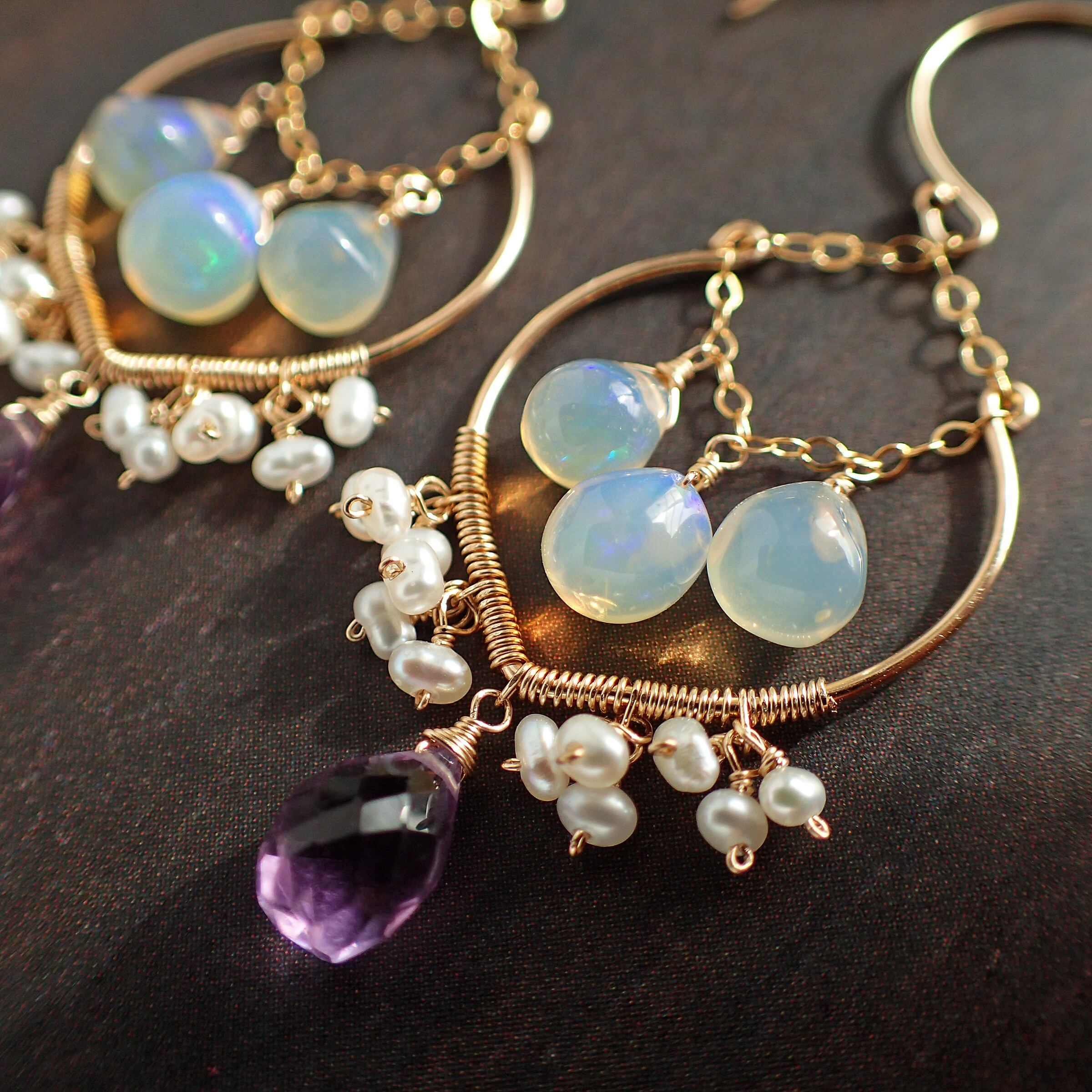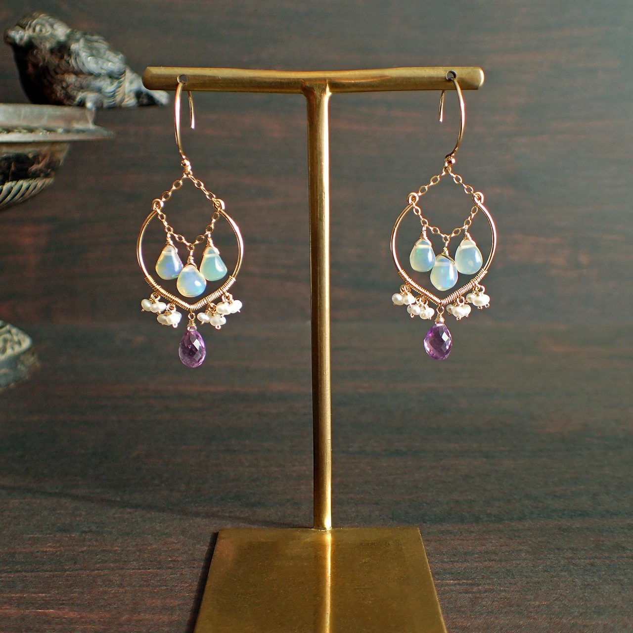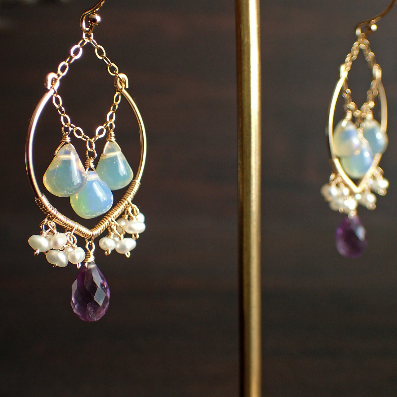 この繊細で美しいシャンデリアピアスは、神秘的なオパールと魅力的なアメジストを使用した特別なデザインが特長です。