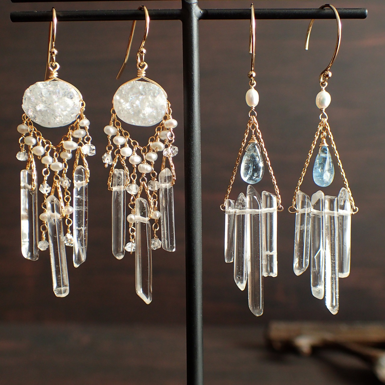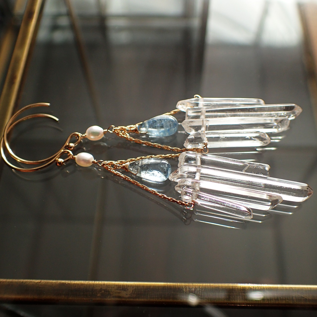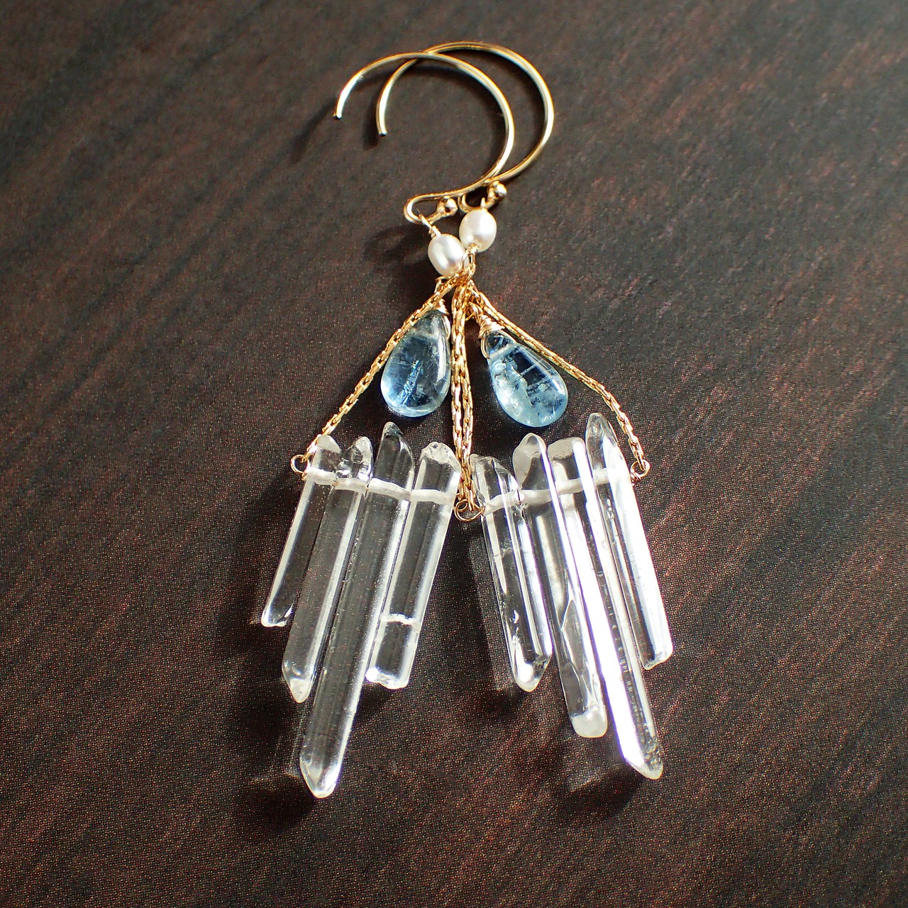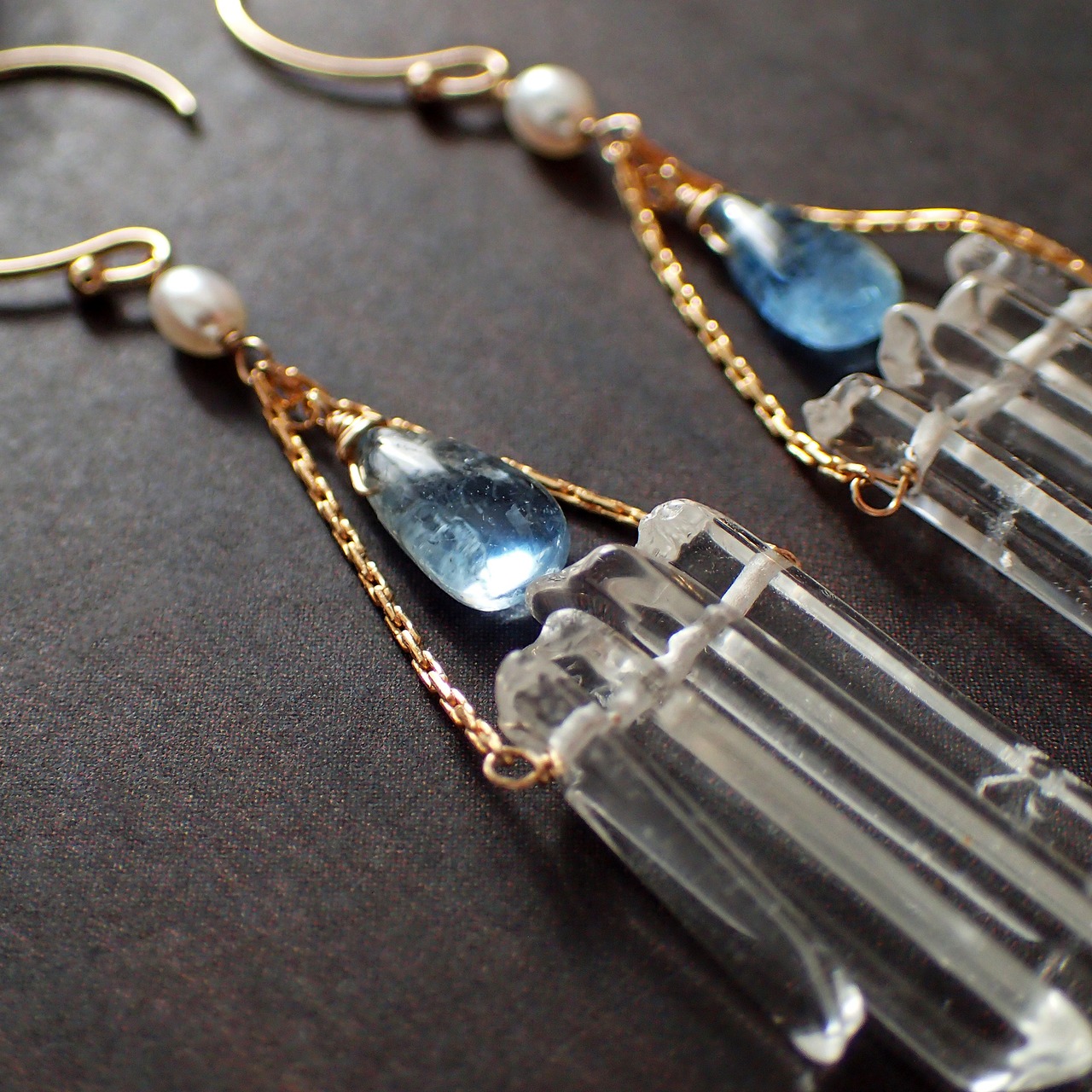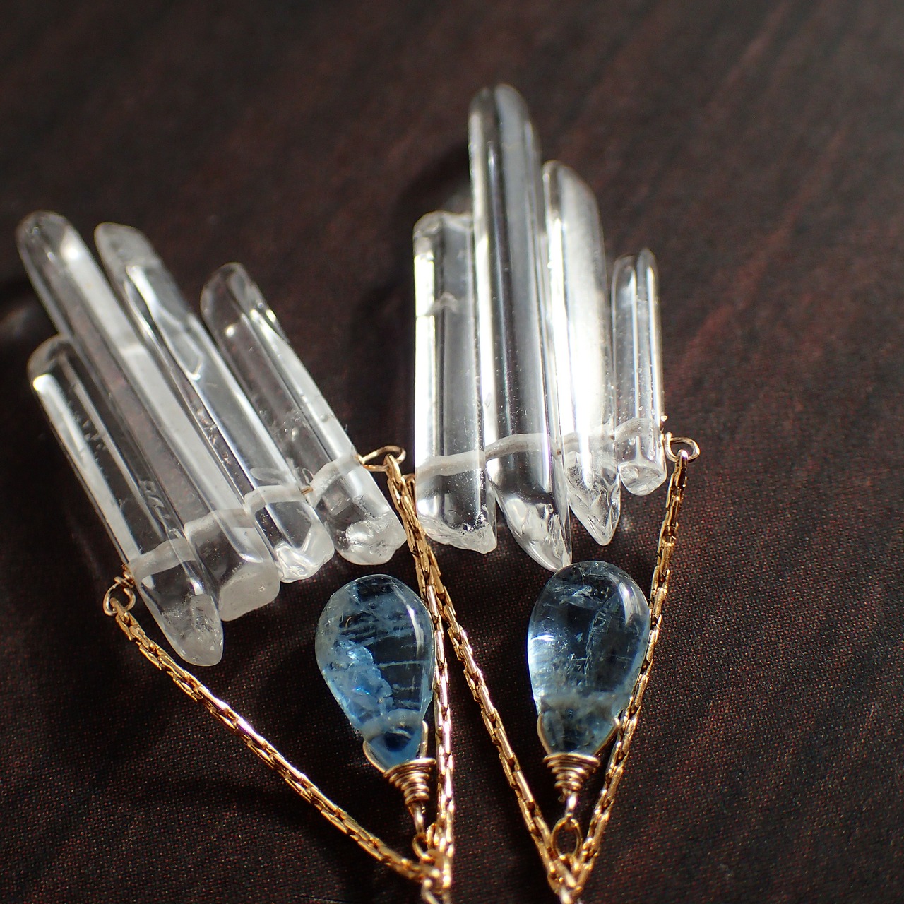 # 氷柱と雨粒のシャンデリアピアス(水晶&アクアマリン)