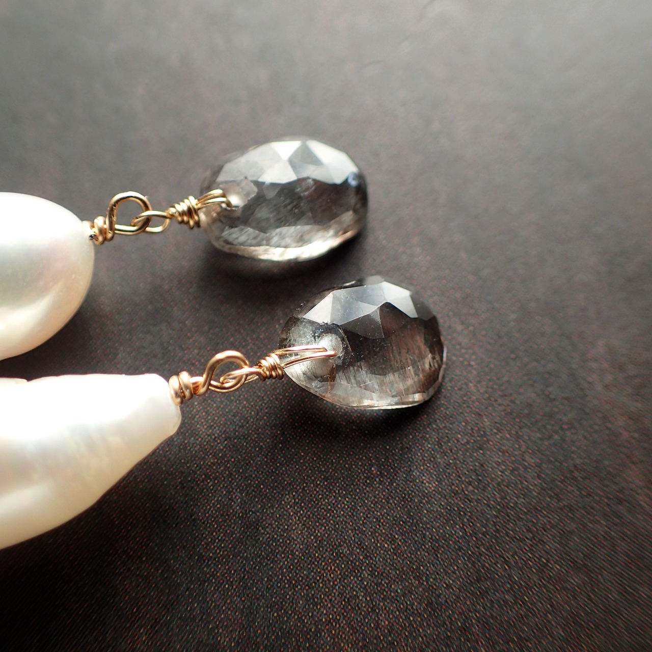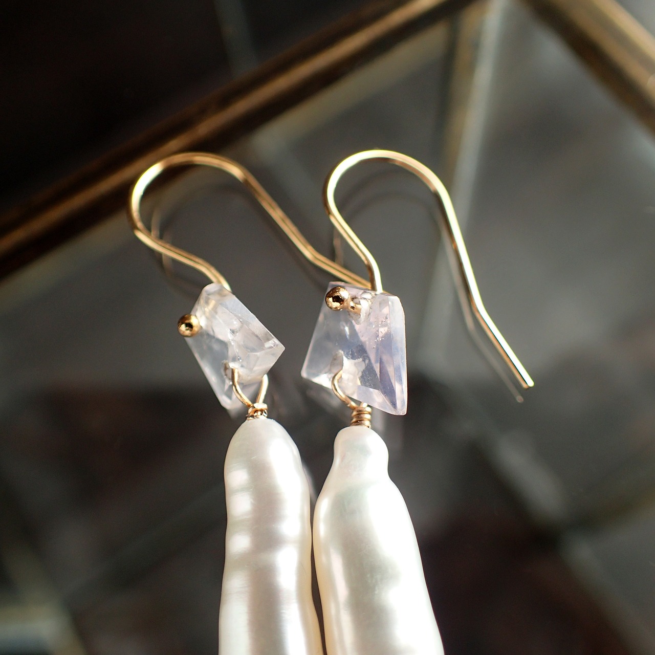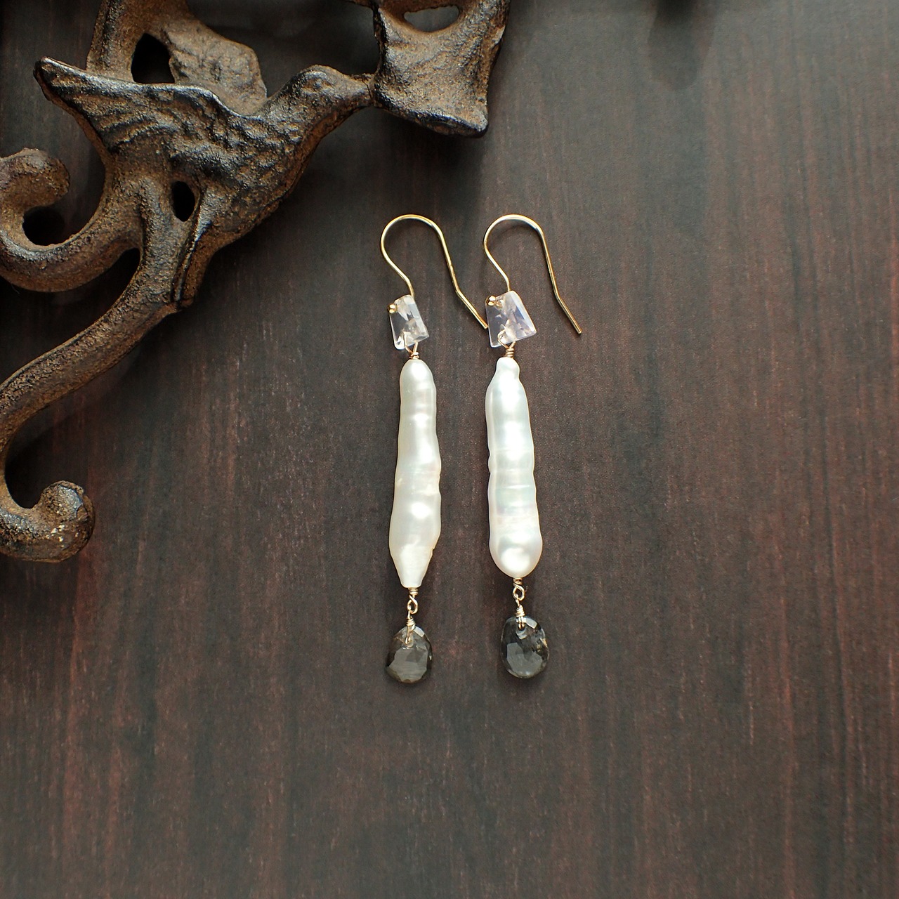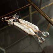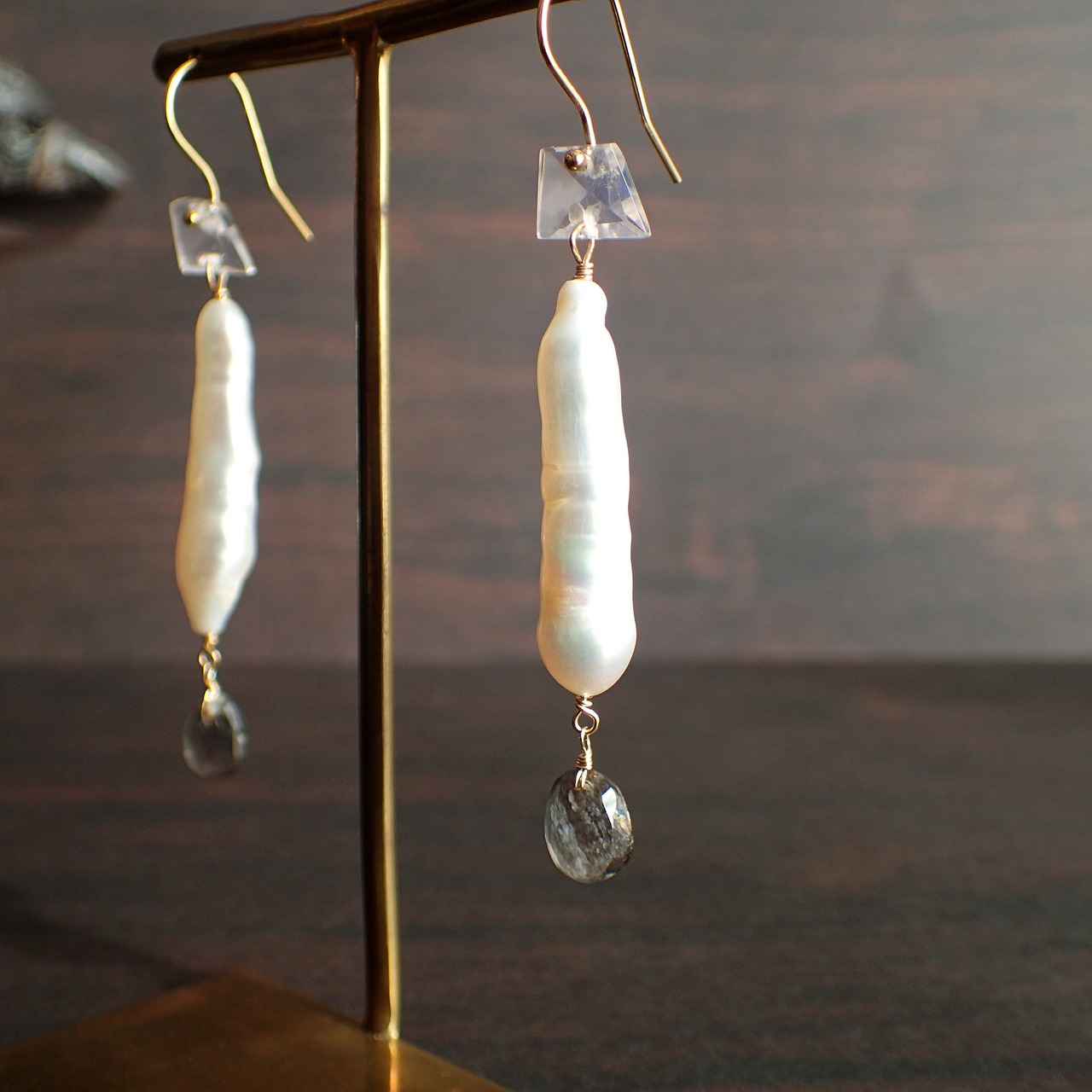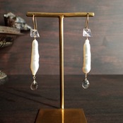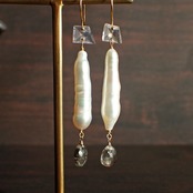 冬の奇跡のような樹氷を思わせるバロックパールが耳元で揺れ、地球の自然を思わせる美しいモスアクアマリンと共に、あなたの魅力を引き立てます。