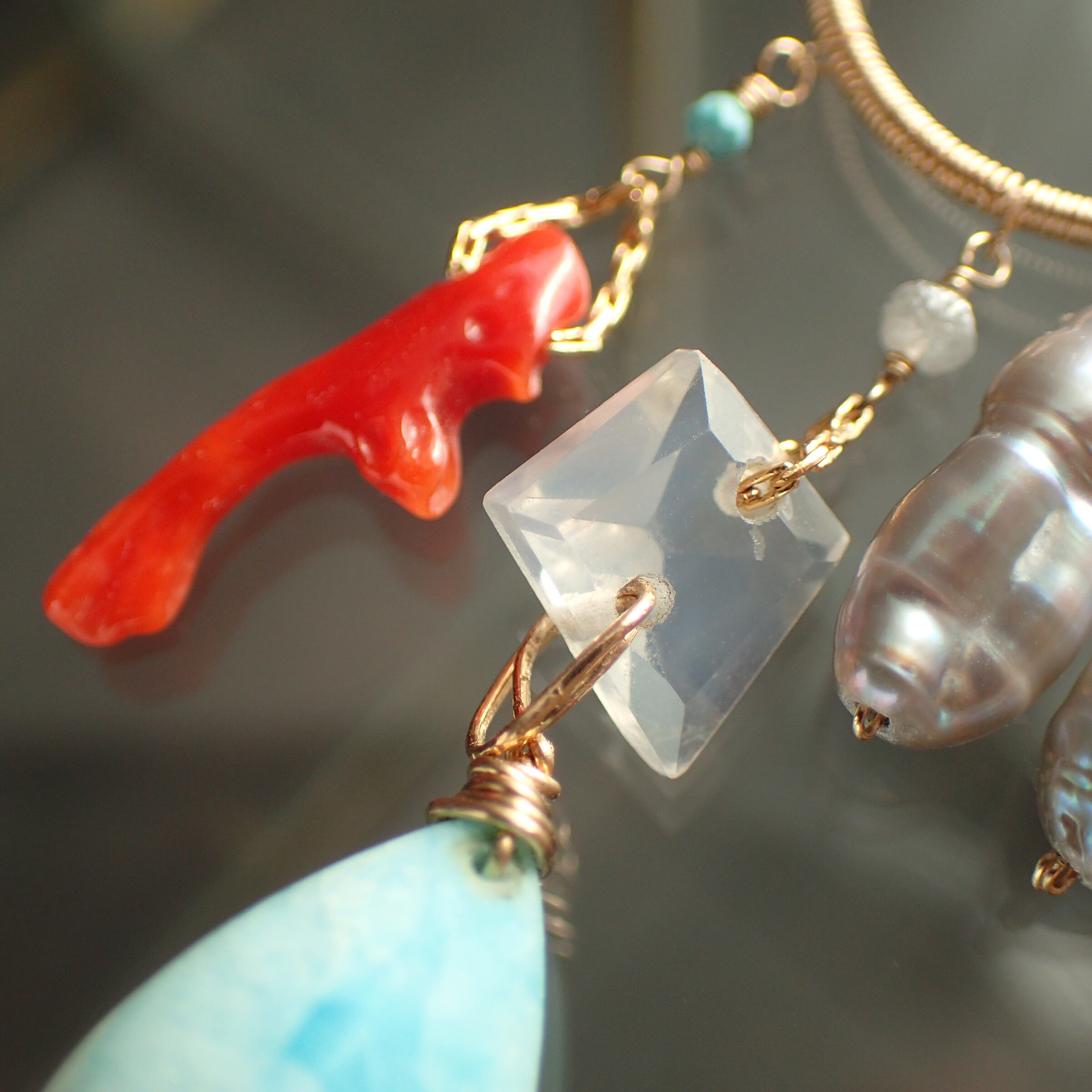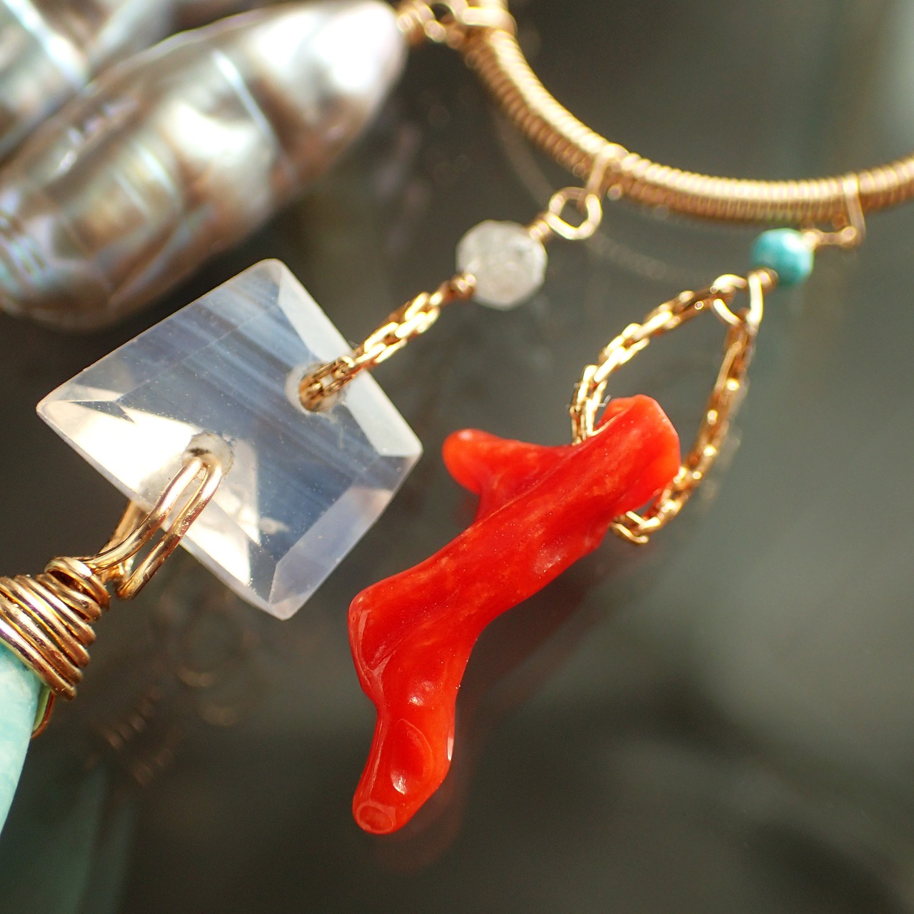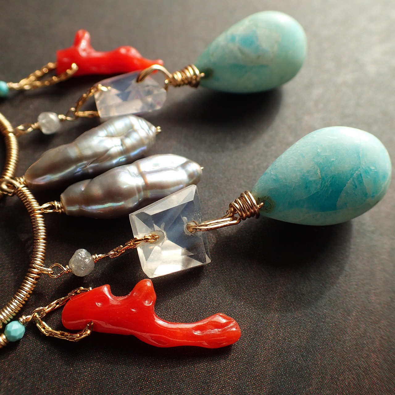 K14GF・アマゾナイト・枝珊瑚・淡水パール・ラフダイヤモンド・トルコ石・スコロライト