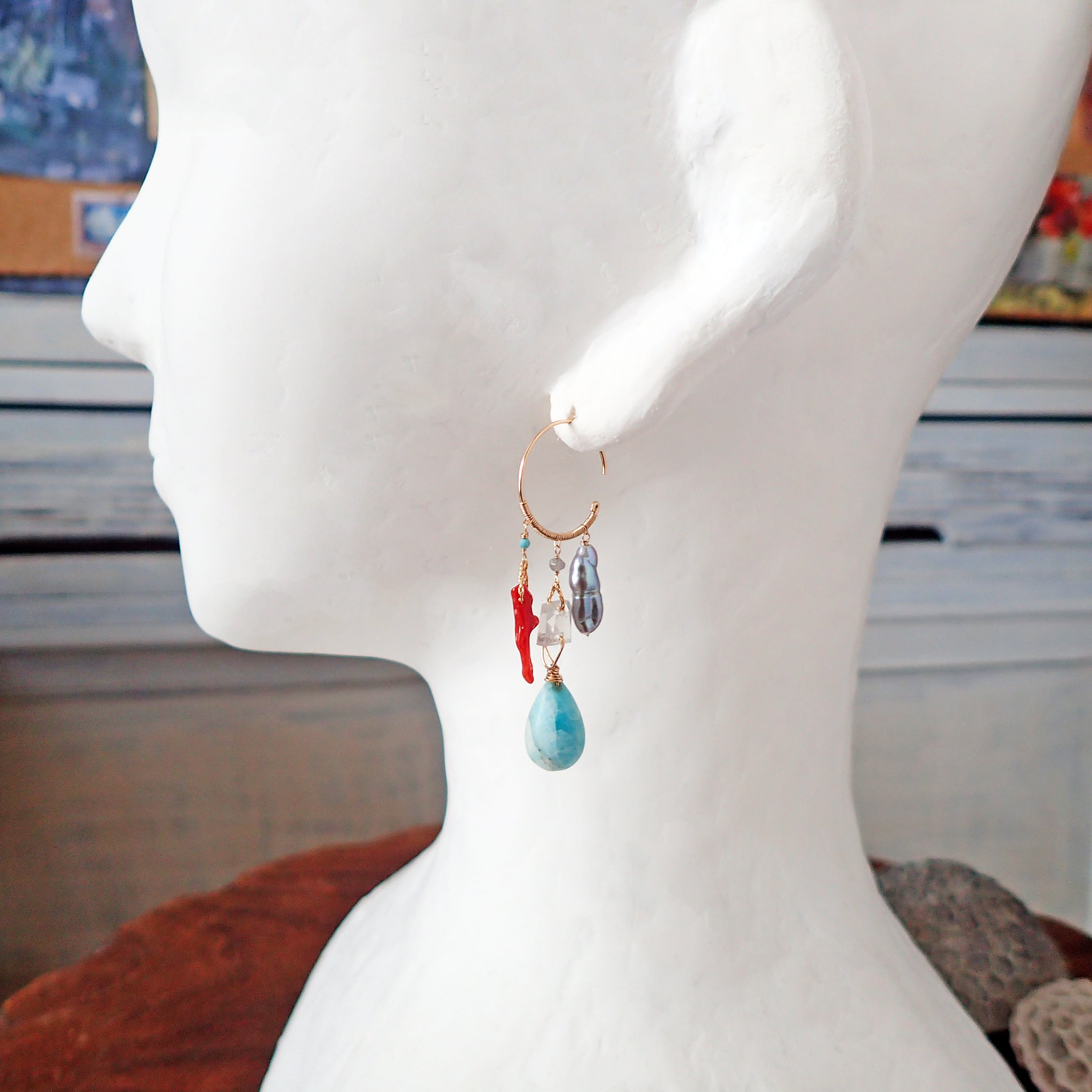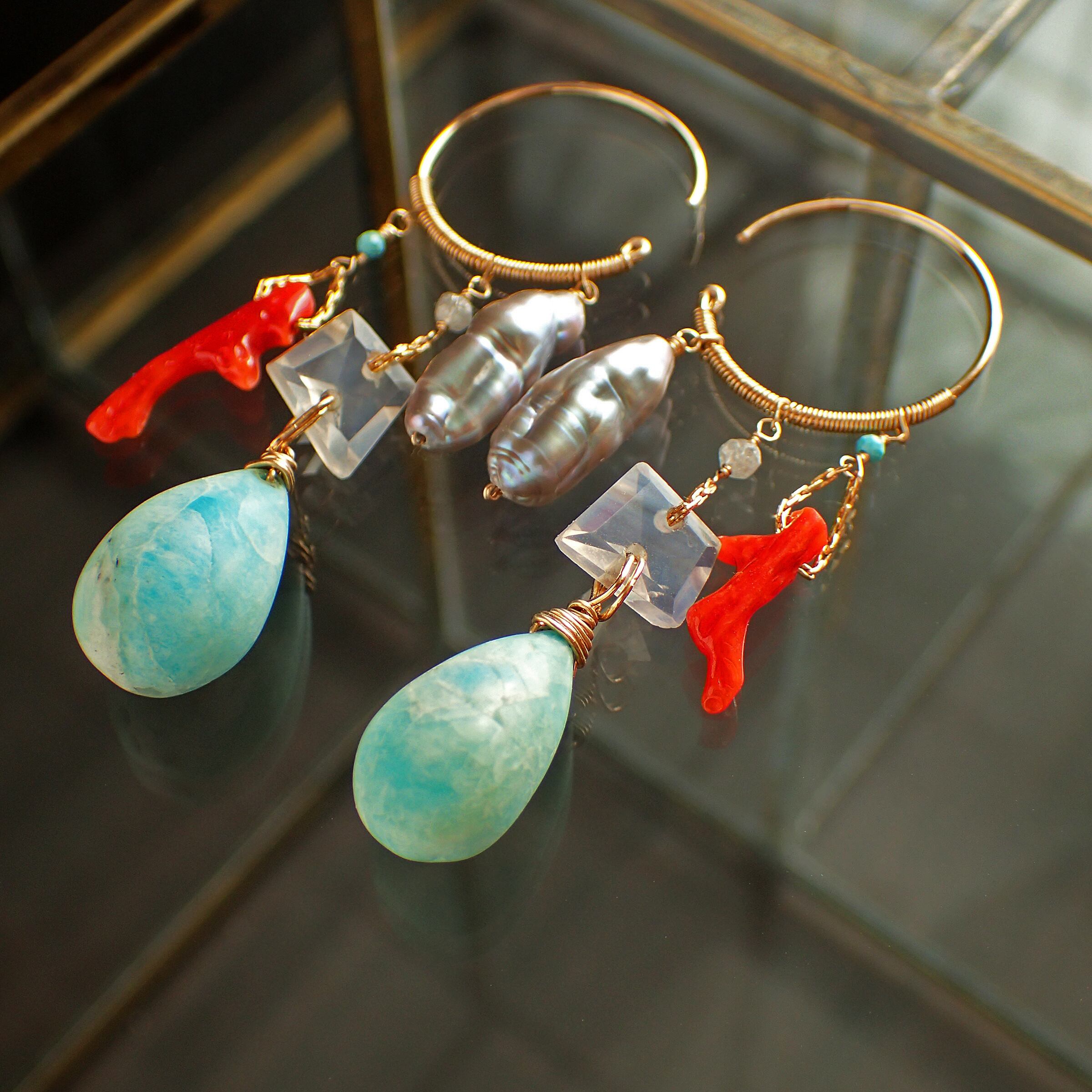 アマゾナイトのつや消し加工の柔らかなブルーと、枝珊瑚の温かみ、淡水パールの繊細さが調和し、シンプルなスタイルに特別なアクセントを与えます。