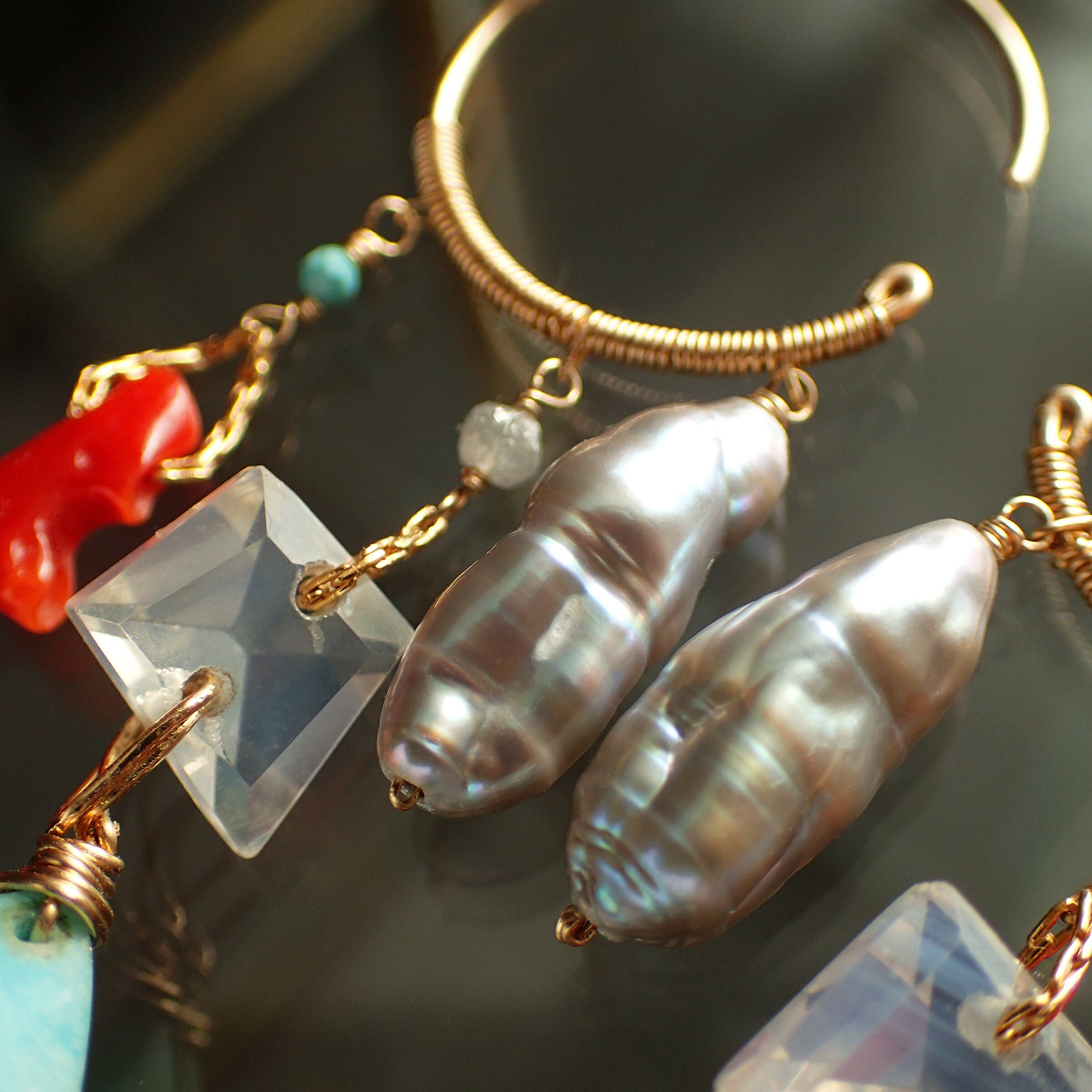 また、淡水パールは光を受けて優雅に輝き、ラフダイヤモンドと極小粒でカットの入っているトルコ石、乳白色がかった優しげなスコロライトが一層の魅力を加えています。