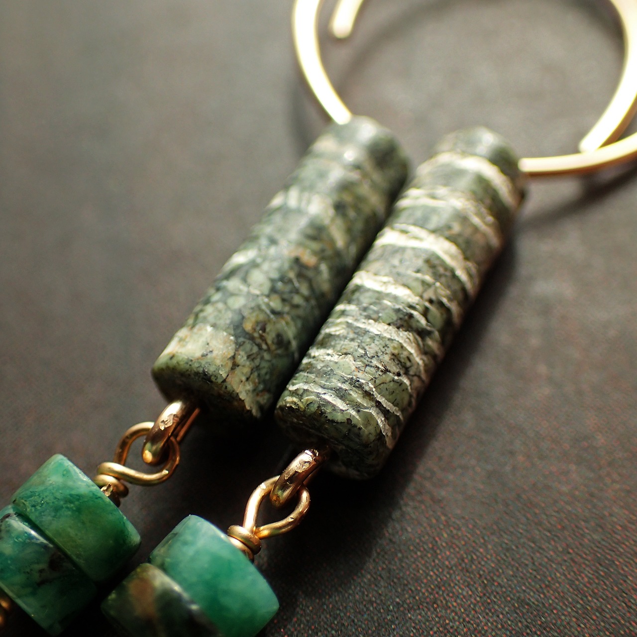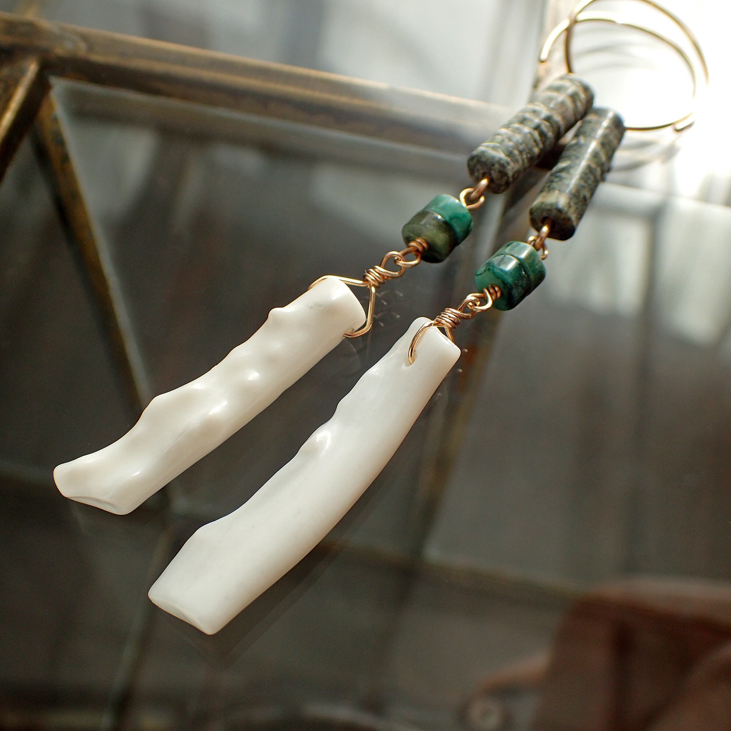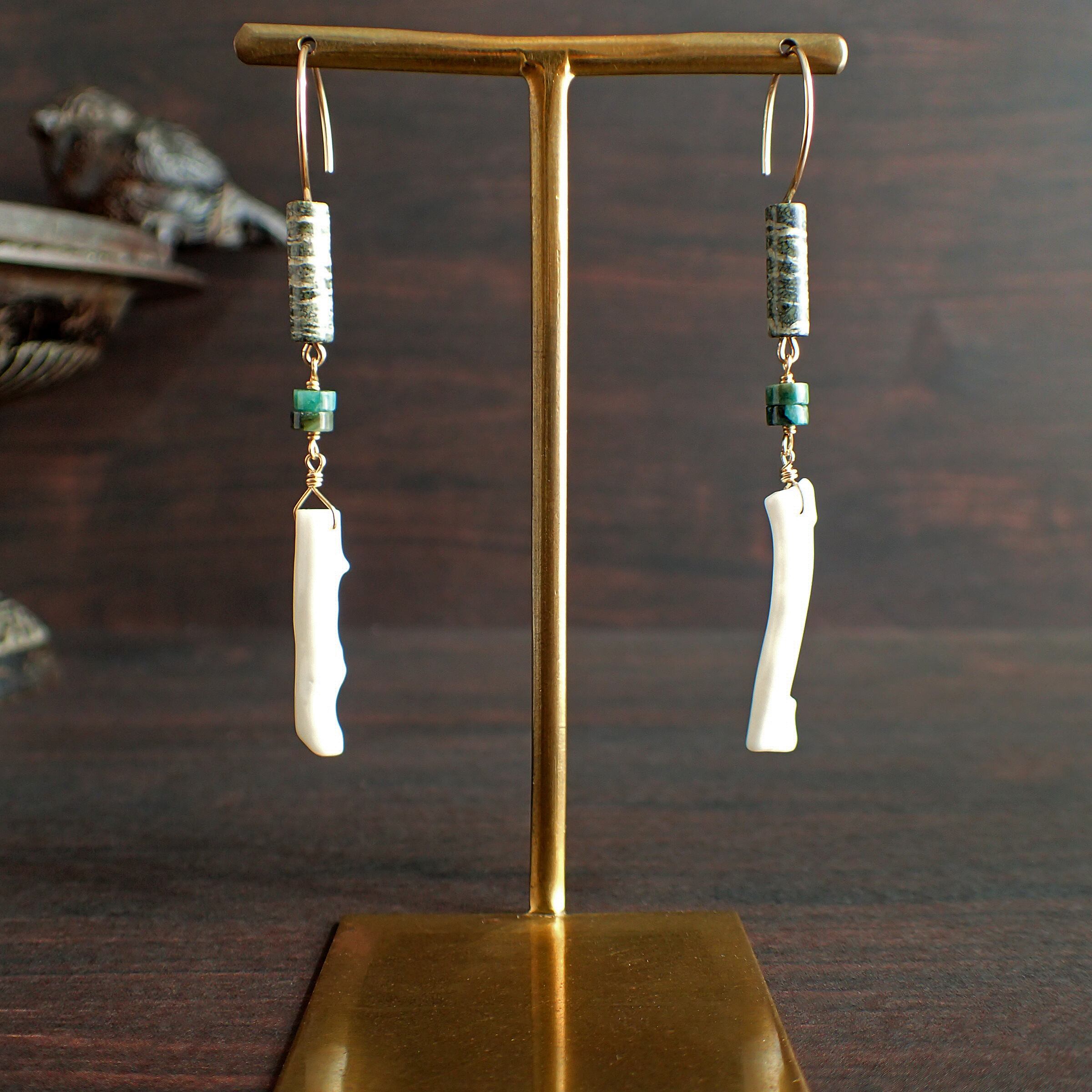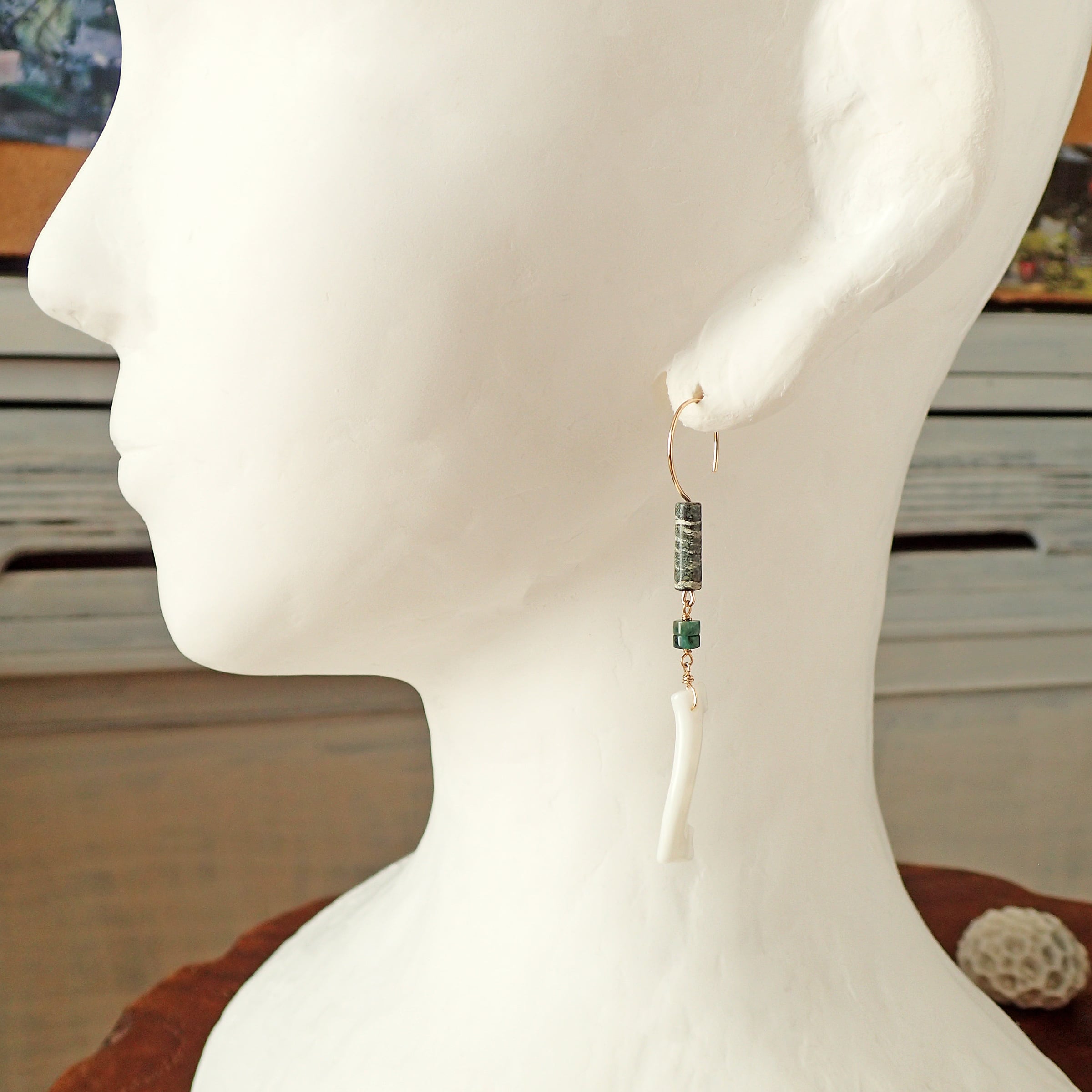 この美しいロングピアスは、白枝珊瑚とゼブラストーン、アフリカンジェードが調和した洗練されたデザインが特徴です。