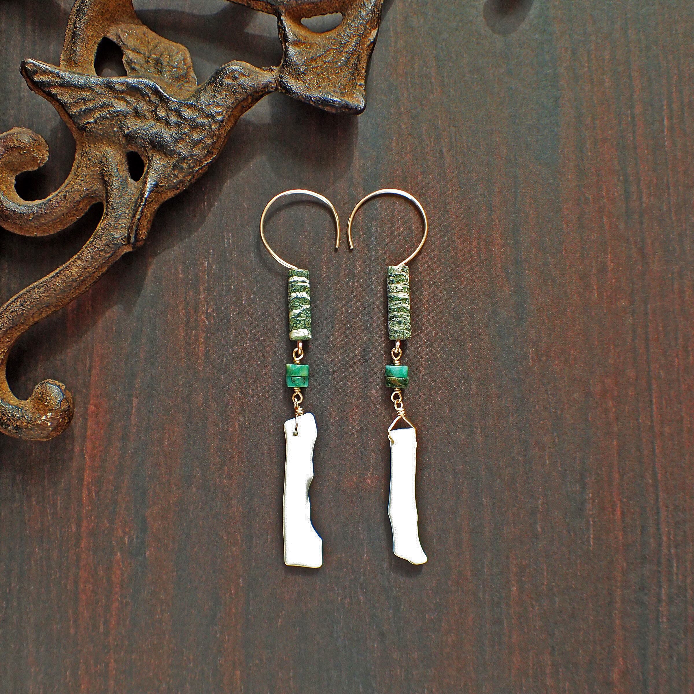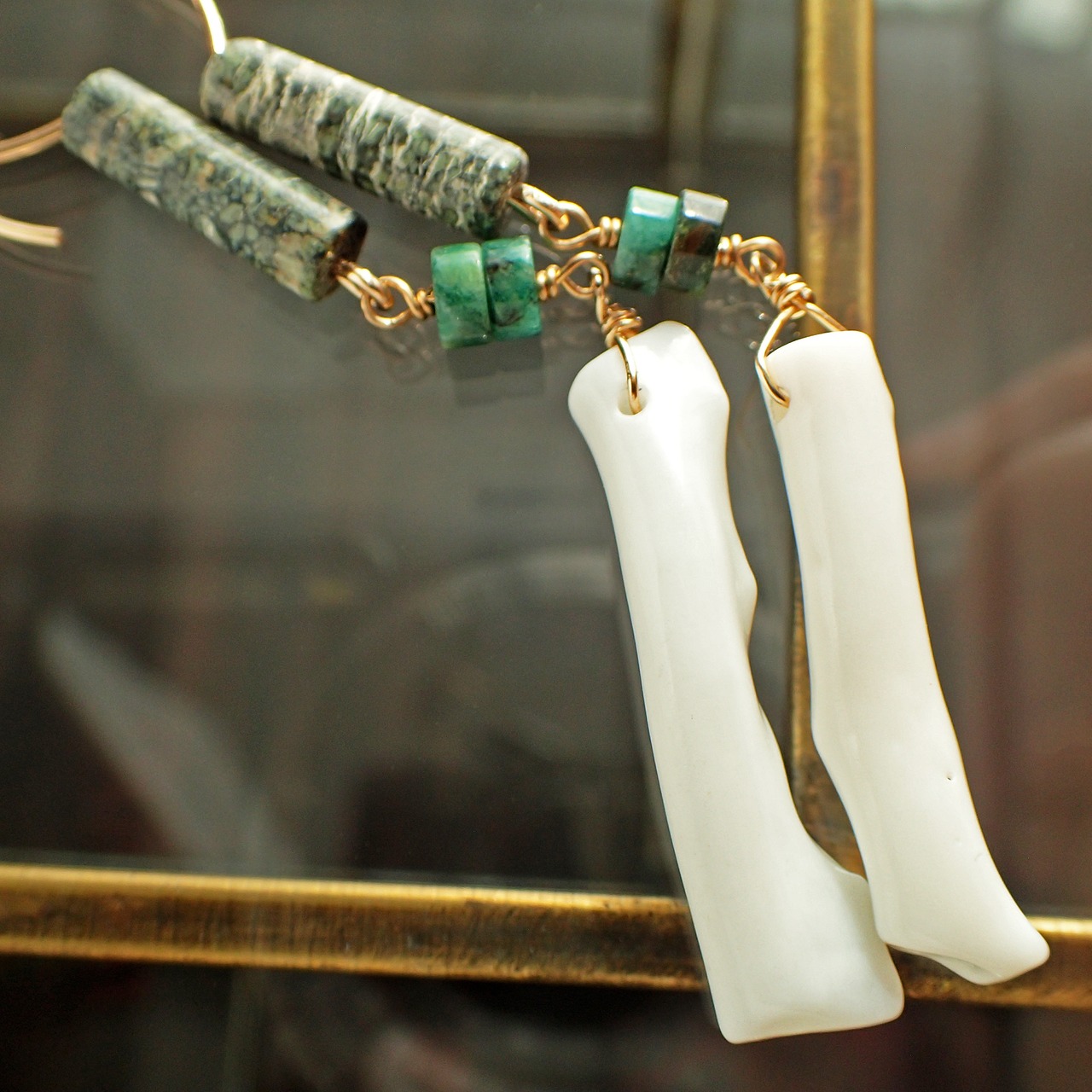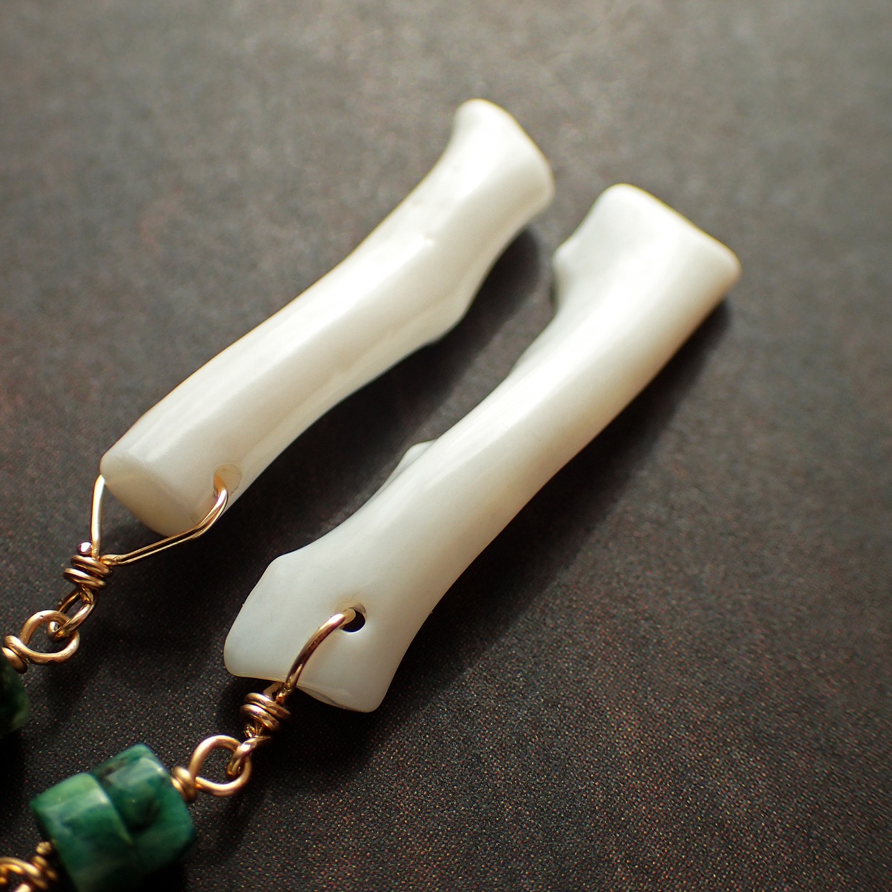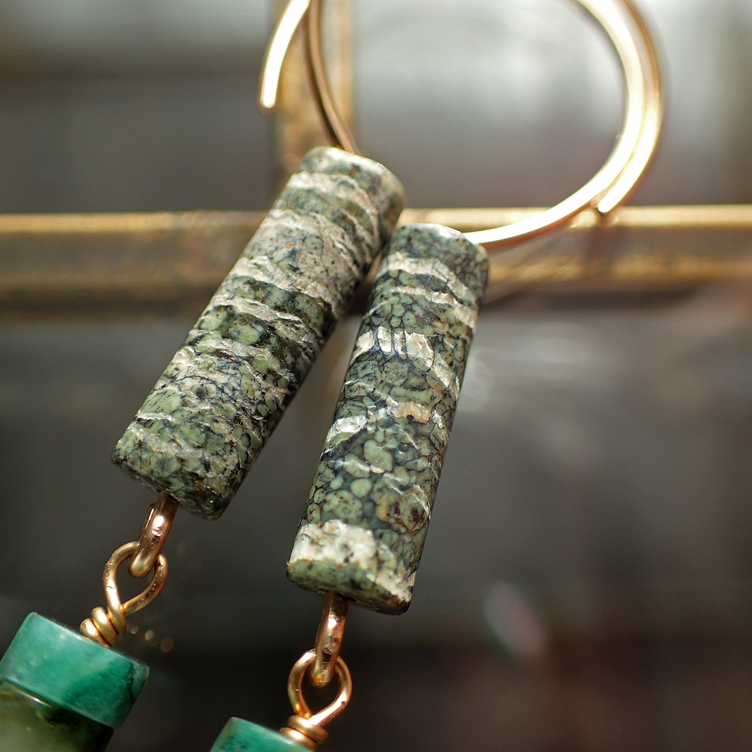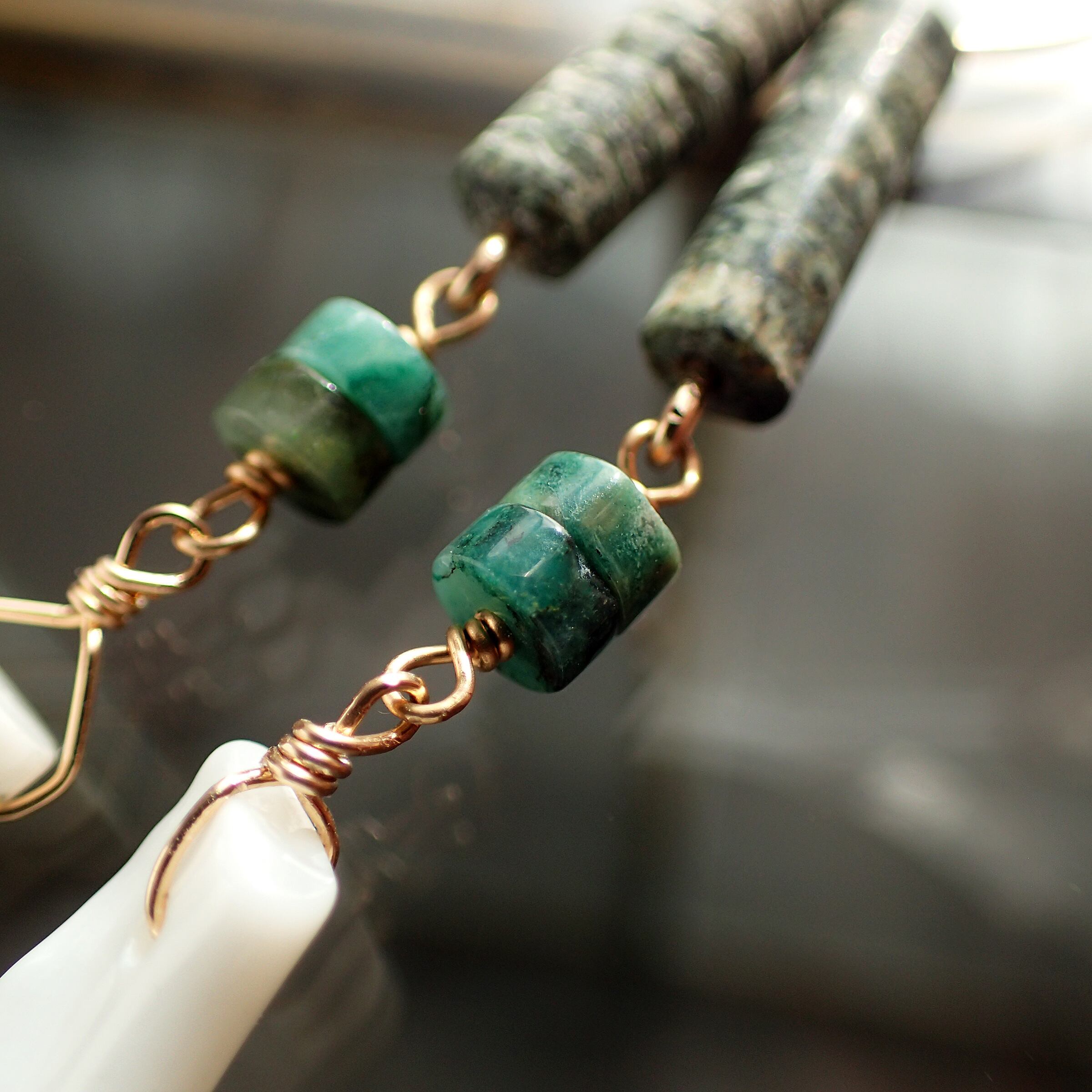 この美しいロングピアスは、白枝珊瑚とゼブラストーン、アフリカンジェードが調和した洗練されたデザインが特徴です。