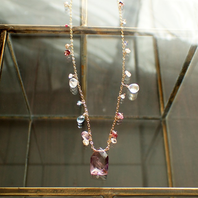 # 花束ネックレス(アメトリン&ジェムストーン) この「Bouquet Necklace 花束ネックレス」は、アメトリンを中心に、ピンクトルマリン、レインボームーンストーン、スイスブルートパーズ、ピンクやパープルカラーのスピネル、アクアマリン、ルビー、淡水パール、タンザナイト、ハーキマーダイヤモンドといった多彩な天然石を使用した、華やかでありながら上品なデザインが特長のアクセサリーです。 様々な色合いの宝石が調和し、まるで美しい花束のように目を引くデザインは、あなたのスタイルに華やかさを添えることでしょう。 様々なカットの宝石が織りなす輝きは、どの角度から見てもその魅力を感じさせ、特別な日から日常使いまで幅広いシーンで活躍します。 全長41~45㎝のチェーンは、大人の女性の首元を美しく引き立て、シンプルなトップスやドレスに合わせてもその存在感は際立ちます。 特別なデザインは、自分への贈り物としても、大切な方へのプレゼントとしても喜ばれることでしょう。 すべてのパーツには高品質なK14GFを使用しており、肌に優しく安心してお使いいただけます。こだわり抜かれたデザインと厳選された素材が、このネックレスを特別な存在にしています。 ■ サイズ 全長:約41~45㎝ ■ 素材 アメトリン、アメジスト、レインボームーンストーン、ブルームーンストーン、スイスブルートパーズ、パープルスピネル、ピンクスピネル、ピンクトルマリン、アクアマリン、ルビー、淡水パール、タンザナイト、ハーキマーダイヤモンド、ムーンストーン、K14GF(パーツ、ワイヤー、チェーンすべて) ■ 全て手作りの1点ものです。写真に写っているそのものを販売しております。 ご不明な点がございましたらお気軽にお問い合わせください。できる限り早い対応をさせていただきますので、よろしくお願いします。 ■ お手入れ/取り扱い注意事項 お手入れは柔らかい布で優しく拭いてください。水や汗が付着した場合はすぐに拭き取ることをおすすめします。また、高温多湿の場所を避けて保管してください。 ■ 発送・注文に関する情報や注意事項 ご注文後、通常3~5営業日以内に発送いたします。正式な受注後のキャンセルや返品はお受けできませんので、ご了承ください。 ■ その他の情報や注意事項 購入前に十分にご検討ください。サイズやデザインの確認をお願いいたします。商品の特性上、合わない場合の返品は承れませんので、ご注意ください。 ショップのお問い合わせからお気軽にご質問ください。あなたのお越しを心よりお待ちしております。
